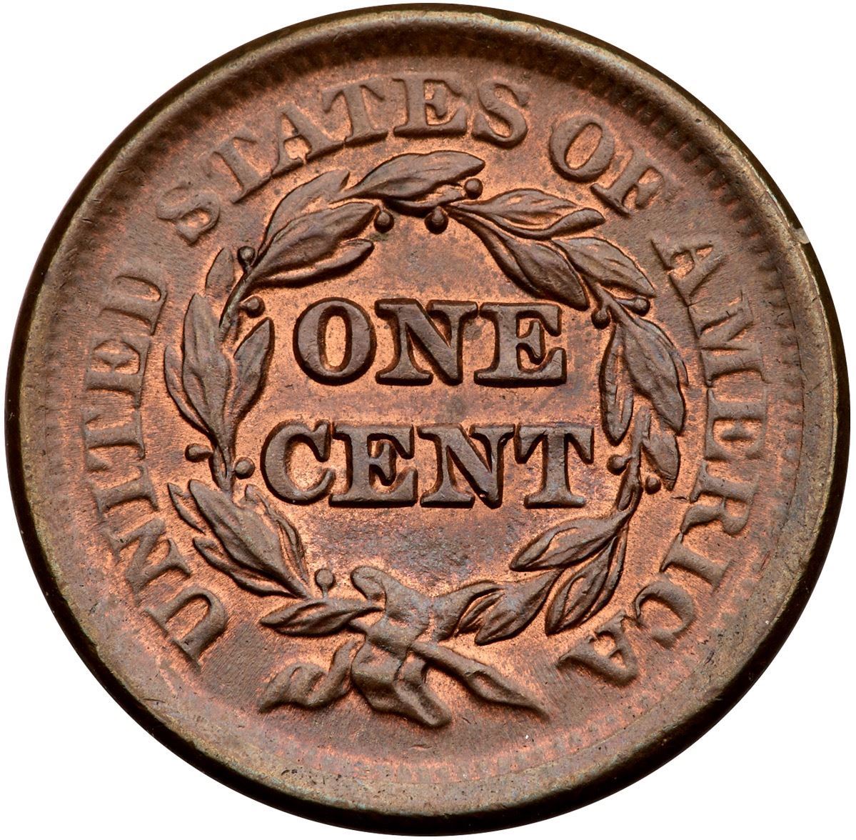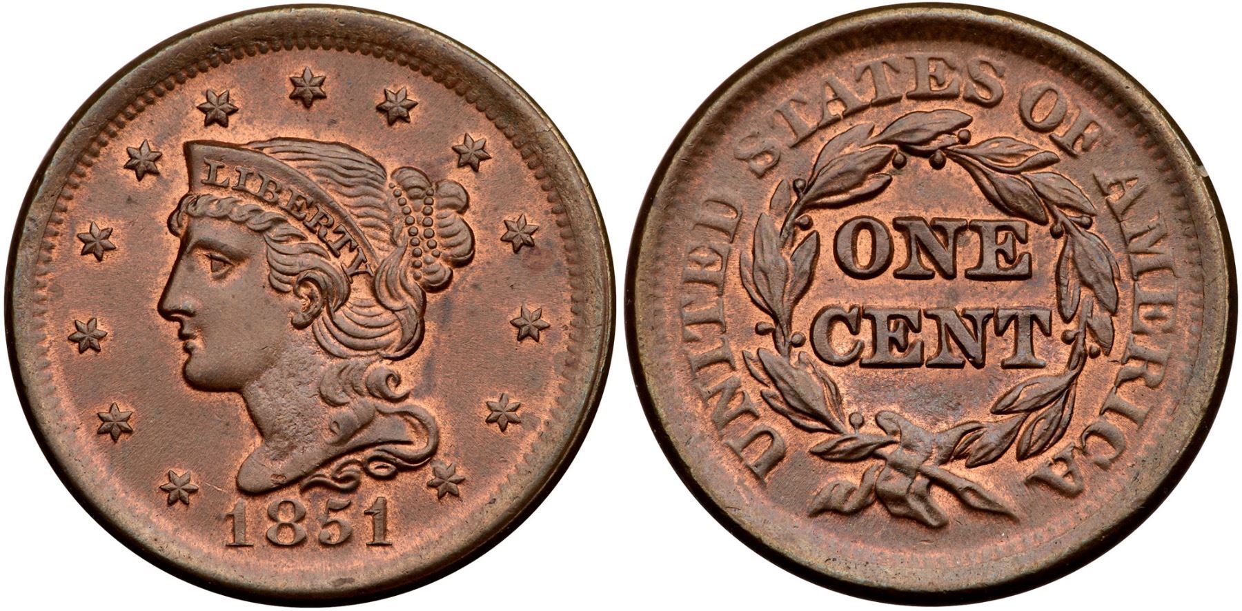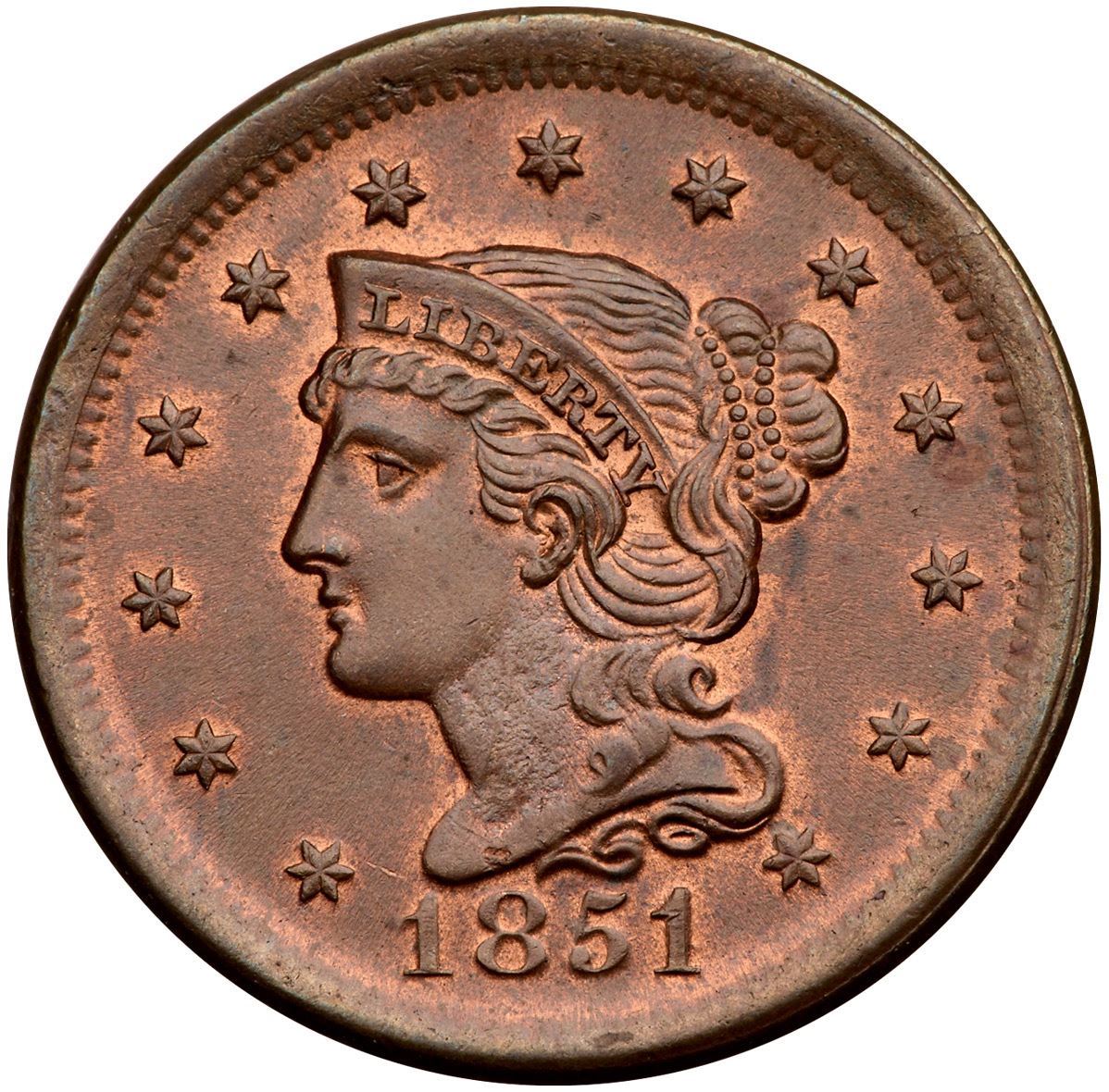1851 N-22 R-4 MS63Frosty brilliant light steel with generous amounts of underlying original mint red on both sides. There are a couple spots under the hair bun and near stars 10-11, and one trivial tick over U in UNITED, Otherwise flawless with frosty, brilliant cartwheel luster covering both sides. Excellent eye appeal. LDS, Grellman state c.Certificate Number: Pedigree: Ex; 2012 LBCS - Buck Burgess