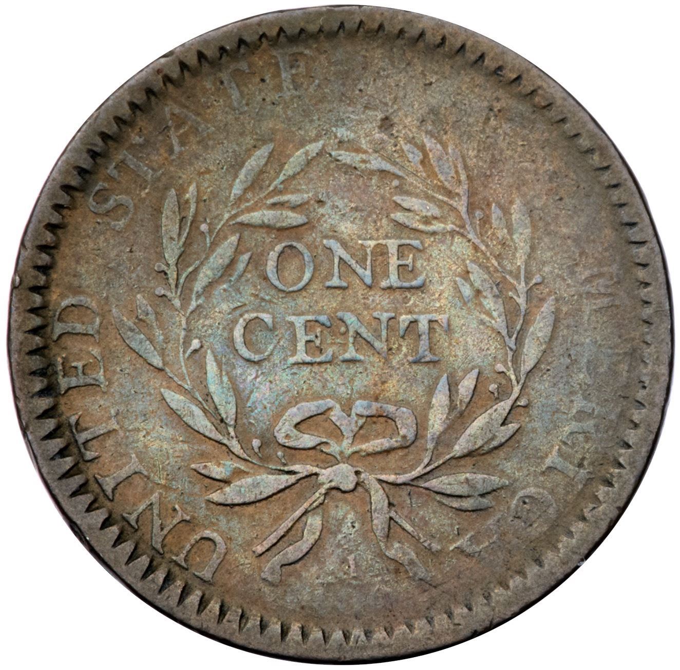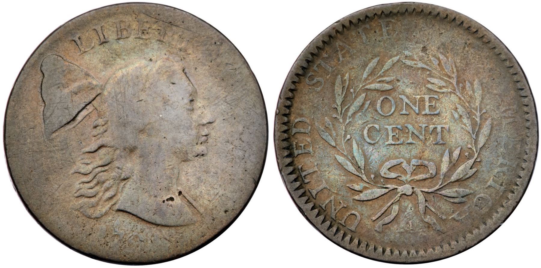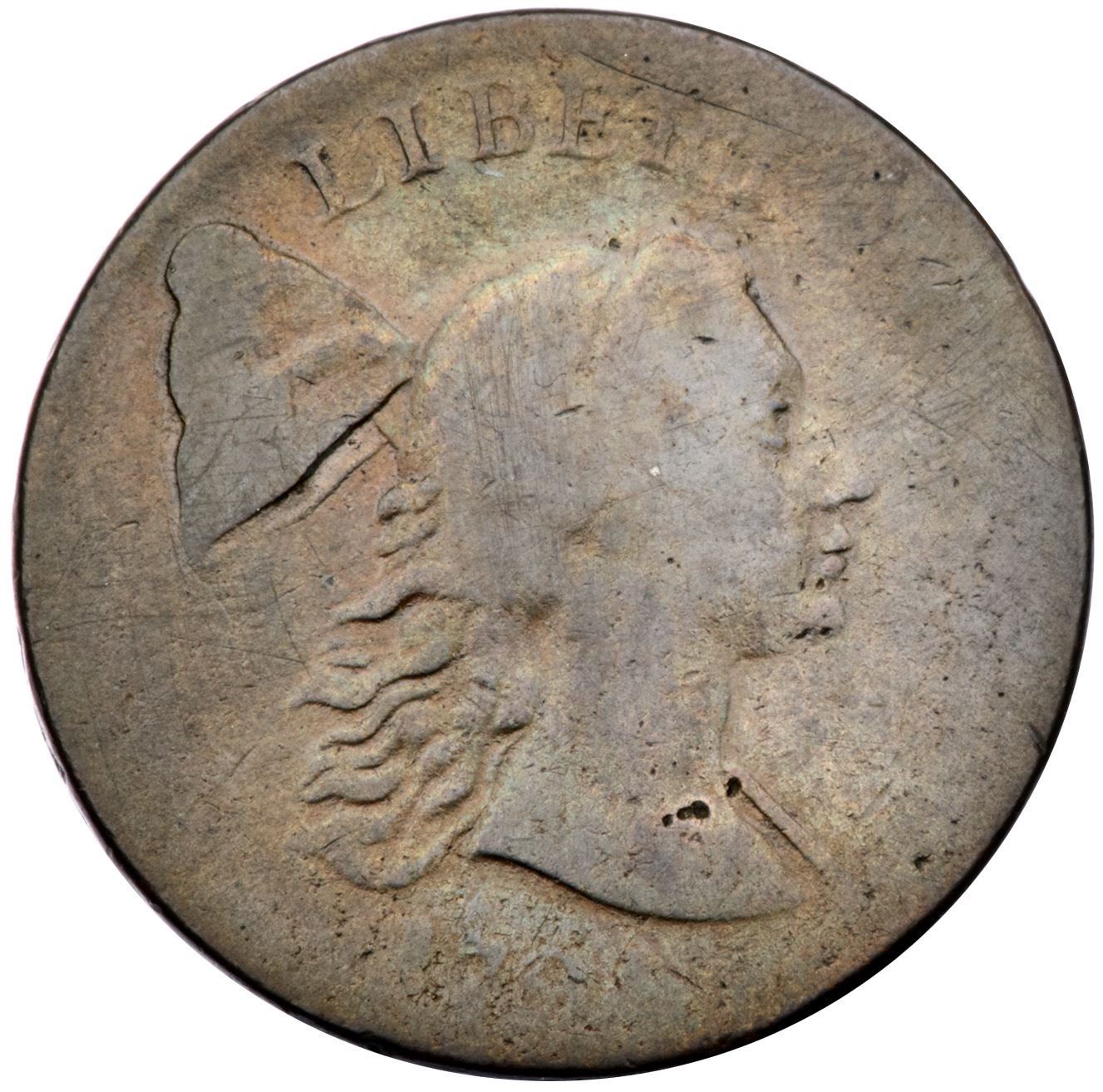 1794 S-19b R-4 Head of 1793, Edge of 1794 G6Slightly sharper, particularly in those areas where the devices were properly struck, but recolored. Glossy steel brown and chocolate with lighter tan in protected areas. Smooth with even wear, but the upper third of the reverse is relatively weak from the uneven strike. The only marks are a few small digs at the top of the bust near the neck. The lower part of the date is weak but it remains easily readable. LDS with obvious swelling under the cap. A nice lower grade cent, and the Head of 1793 is relatively strongCertificate Number: Pedigree: Ex T.W. 6/1984-Fred H. Borcherdt Collection