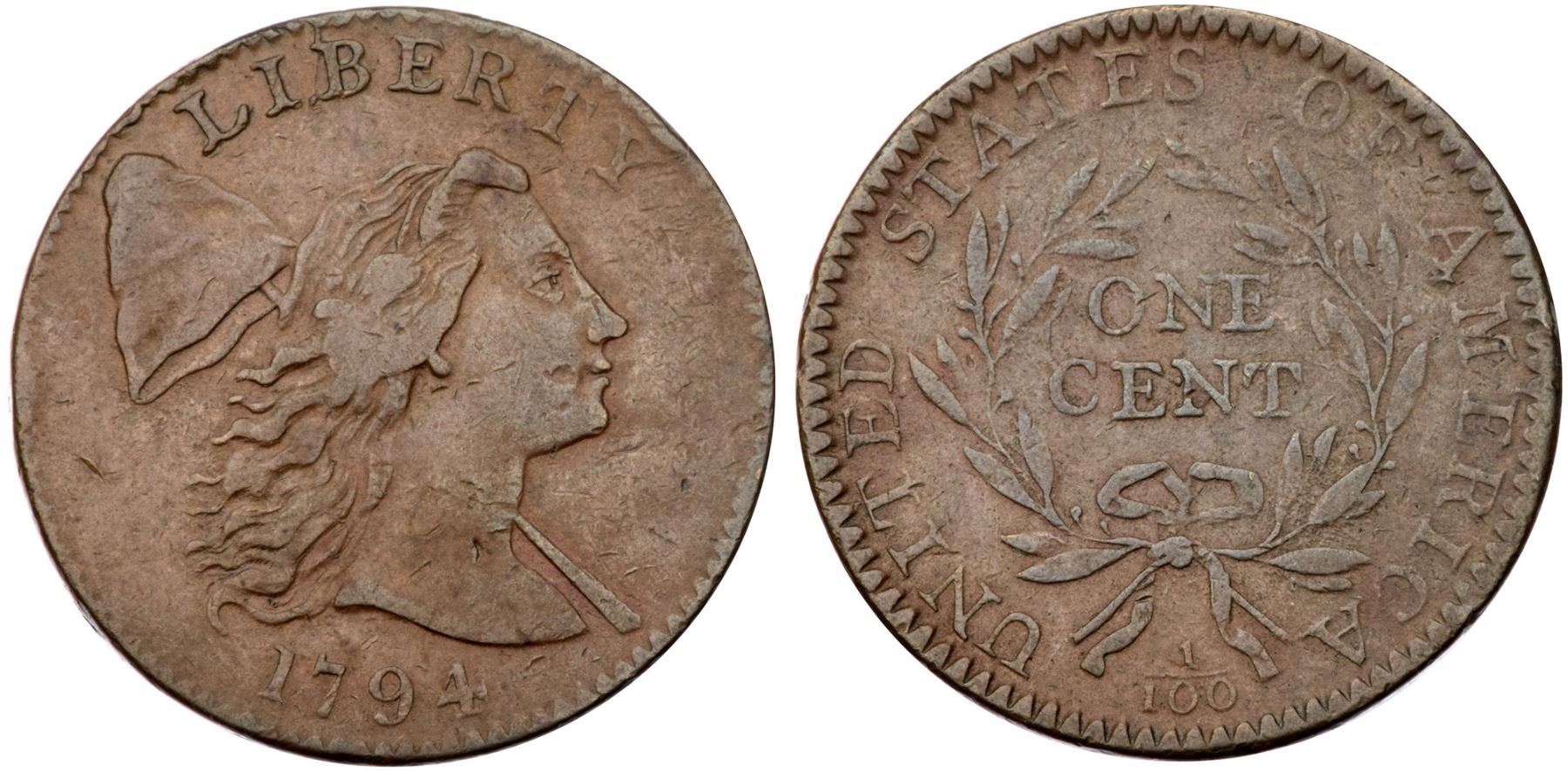 1794 S-21 R-3 VF20Slightly sharper but there are some nicks on the obverse and a rim bruise left of the bottom of the cap. Attractive glossy light to medium brown. LDS, Breen state V, with fine die cracks and clashmarks.Certificate Number: Pedigree: Ex R. S. "Robbie" Brown, Jr. 6/1980-George Ramont-Fred H. Borcherdt Collection (includes the Ramont collection envelope)