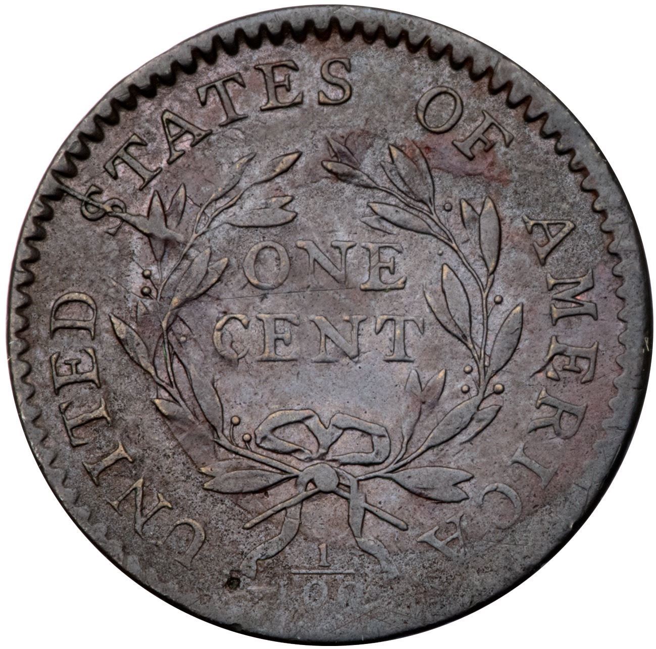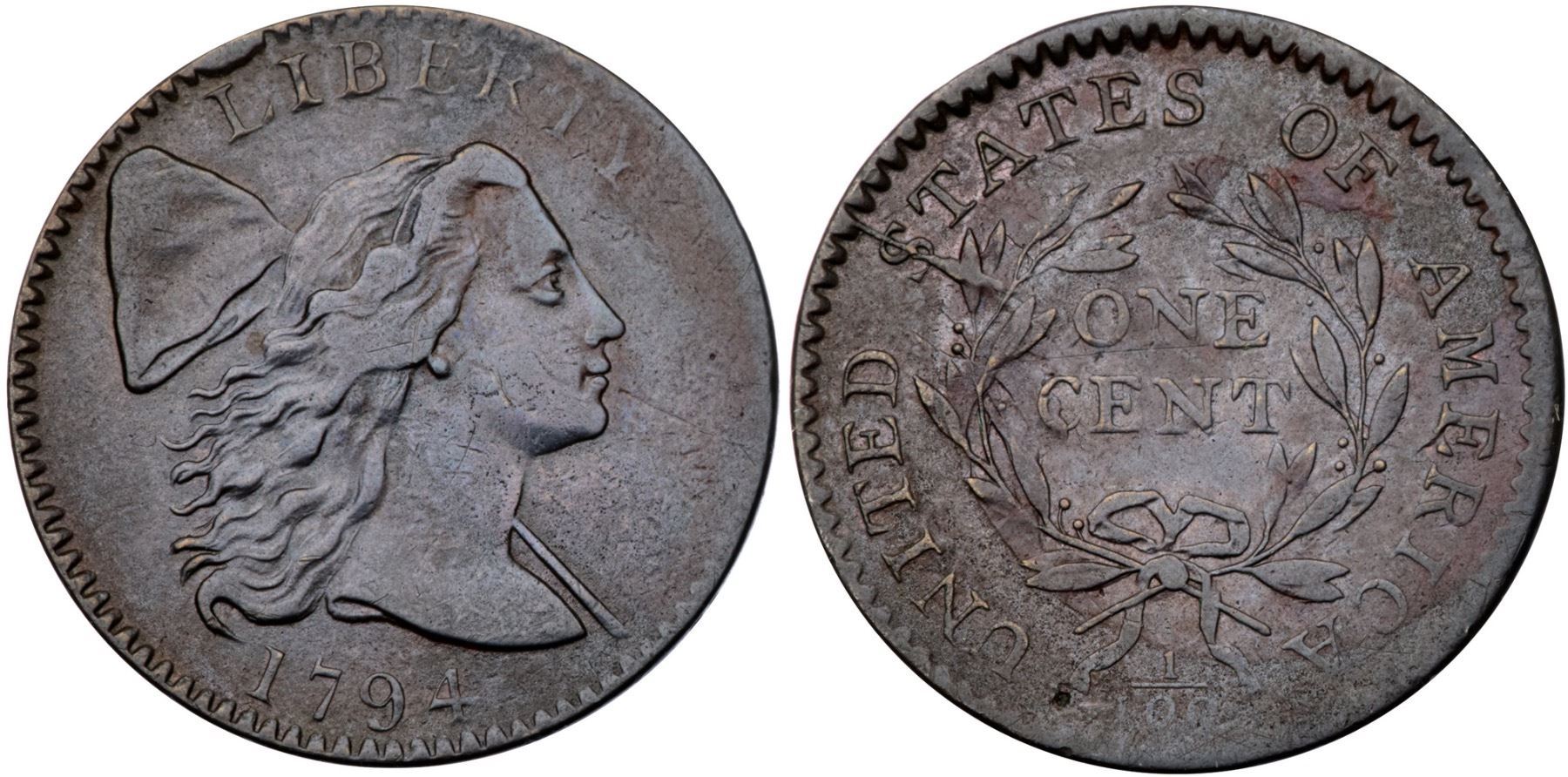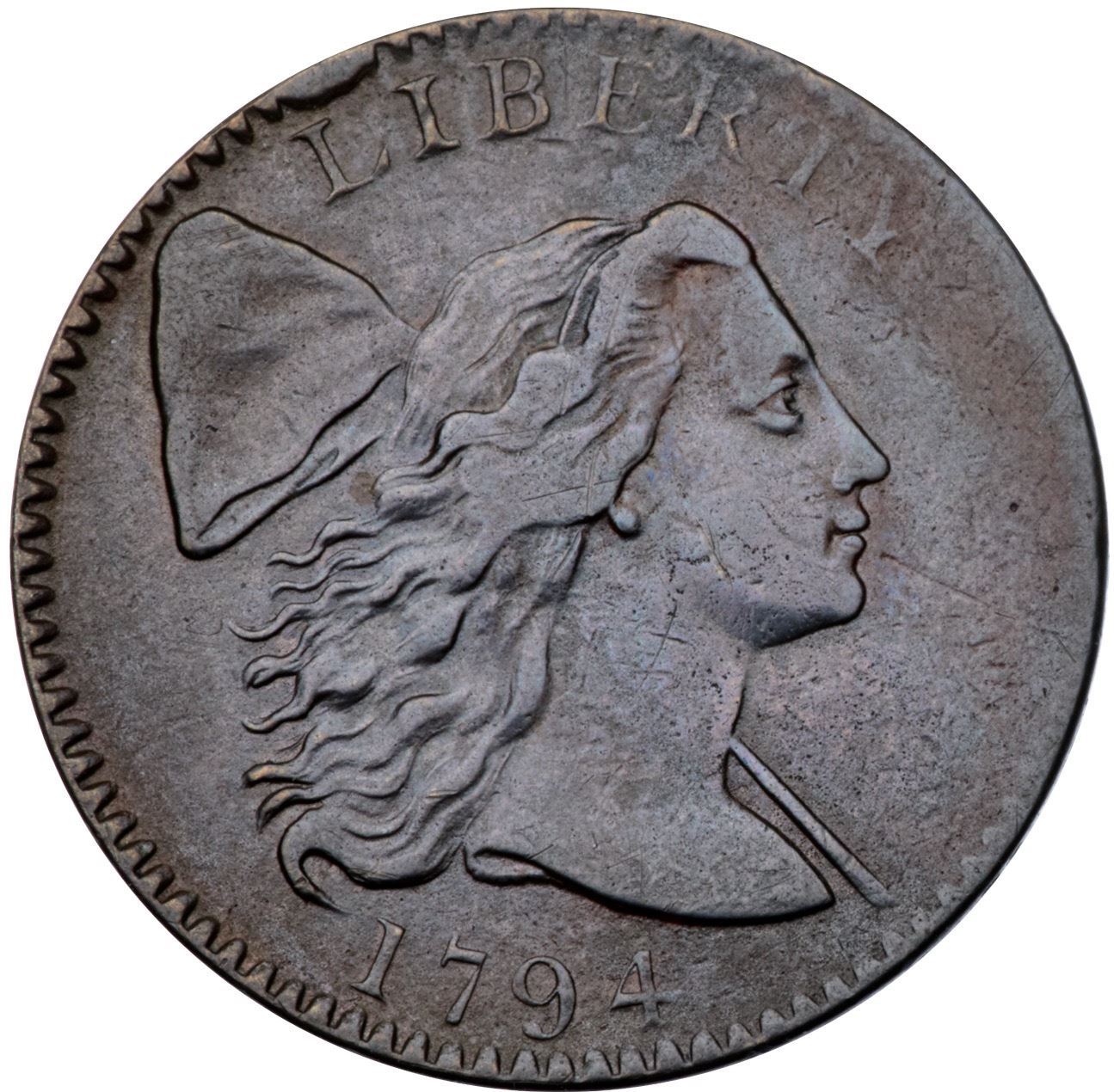 1794 S-32 R-2 F15+Ten points sharper (more where properly struck, less in the weakly struck areas) but there are a few light contact marks and stains. The notable marks are a light scratch in the field before the chin and another lighter one below ON. Mostly glossy light olive and steel brown with subtle puffs of reddish brown on both sides. Traces of microscopic roughness can be found in protected areas, mostly on the reverse. M-LDS, Breen state IV, with a strong radial crack through the first S in STATES and die clashmarks on the reverse. Unevenly struck with weakness along the right edge of the obverse and lower part of the reverse; the reverse is rotated 45 degrees CCW from the normal head-to-foot die orientation. Graded VF30 net VF20 and tied for CC#18 in the Noyes census, his photo #25829.Certificate Number: Pedigree: Ex Denis W. Loring 8/1979-Fred H. Borcherdt Collection