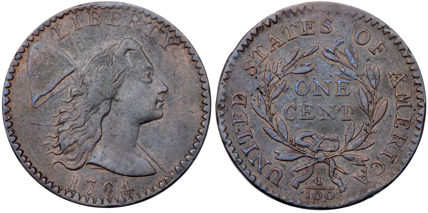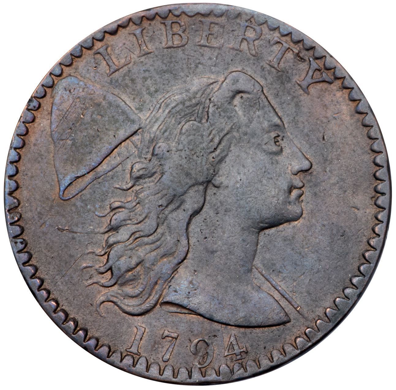 1794 S-35 R-5 VG8Sharpness VF25 but the surfaces are slightly uneven with two obvious depressions at the date and some light rim bruises on both sides. Recolored a slightly glossy steel brown with traces of reddish tan in protected areas. The surfaces look smooth to the unaided eye but a glass reveals microscopic granularity that covers the fields and protected areas. E-MDS, Breen state IV, with a fine vertical crack on the obverse and die clashmarks on both sides. Struck with the reverse rotated 30 degrees clockwise.Certificate Number: Pedigree: From the Fred H. Borcherdt Collection