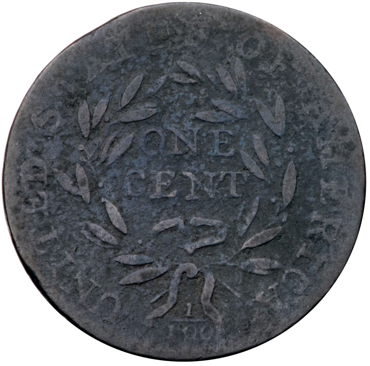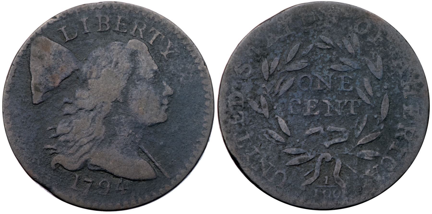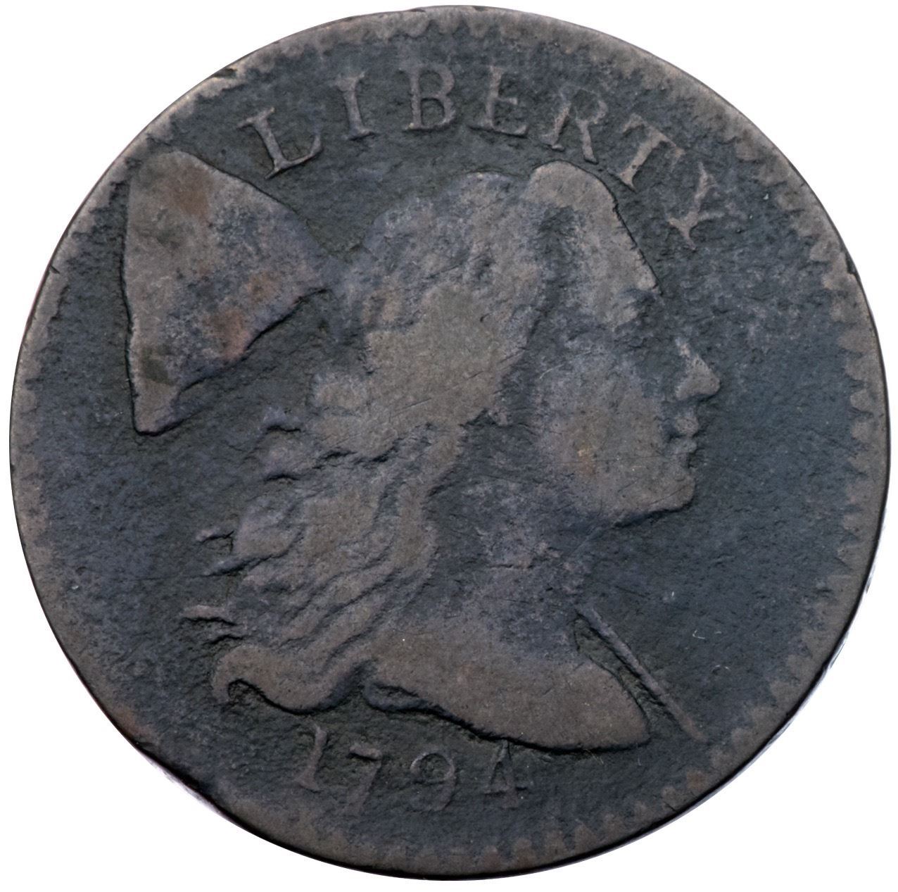 1794 S-53 R-6 G5Several points sharper but covered with fine to moderate roughness on all but the highest points of the devices. No verdigris or marks other than a small mint-made planchet clip affecting the dentils left of the date and over the opposing second T in STATES. Partly glossy olive brown with lighter steel brown on the devices. The date is complete and clear, and the legends are easily readable. Graded G5 by Del Bland. Noyes says VG10 net G5 and tied for CC#12, his photo #26067.Certificate Number: Pedigree: Ex Denis W. Loring 7/1981-Fred H. Borcherdt Collection