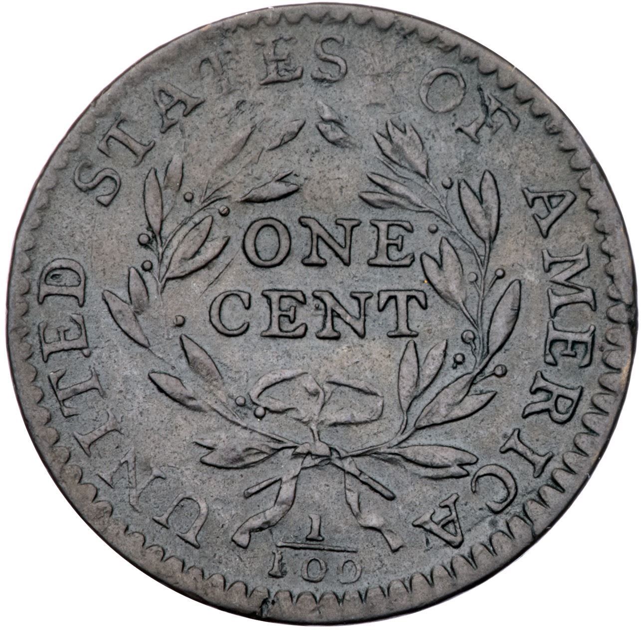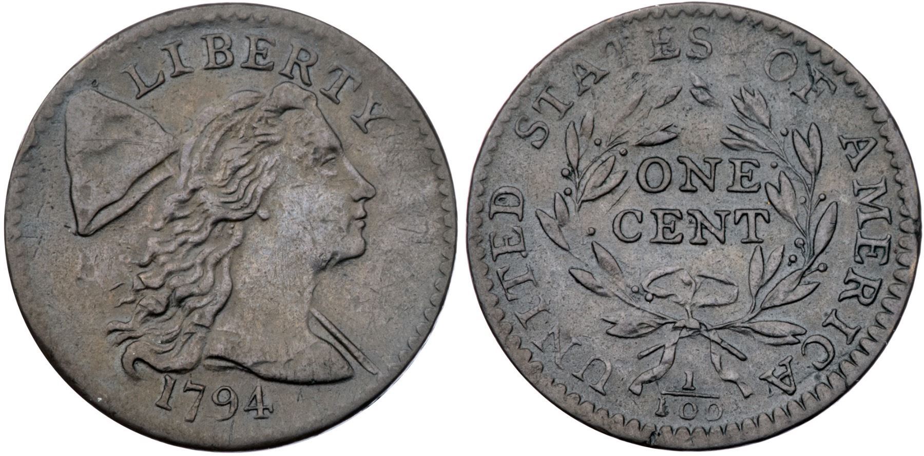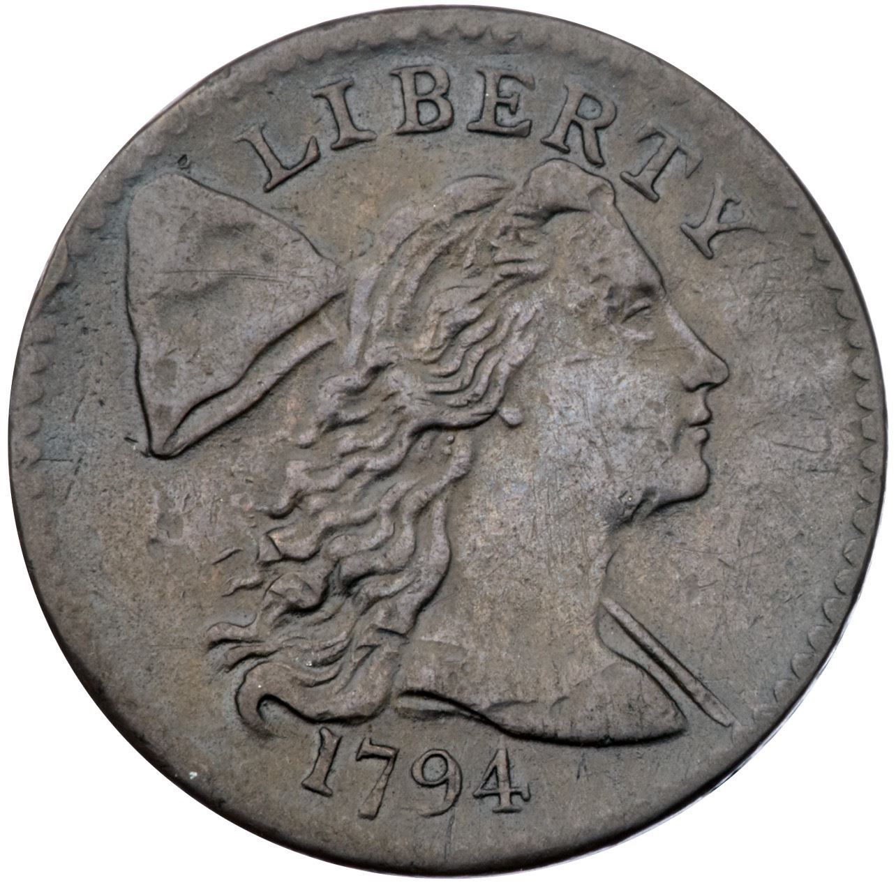1794 S-57 R-1 VF25Slightly sharper with a few more light contact marks than you like to see at this level of sharpness. Most of the marks are located at the top of the reverse; a small rim bruise at ER in AMERICA is the best identifying mark. Glossy light chocolate bending to light olive brown in protected areas. M-LDS, Breen state IV, with two shallow "Trenches" in the field before the face, and the upper trench has a fine die crack running along its center. A nice cent with excellent eye appeal in spite of the minor marks.Certificate Number: Pedigree: Ex Denis W. Loring 8/1982-Fred H. Borcherdt Collection