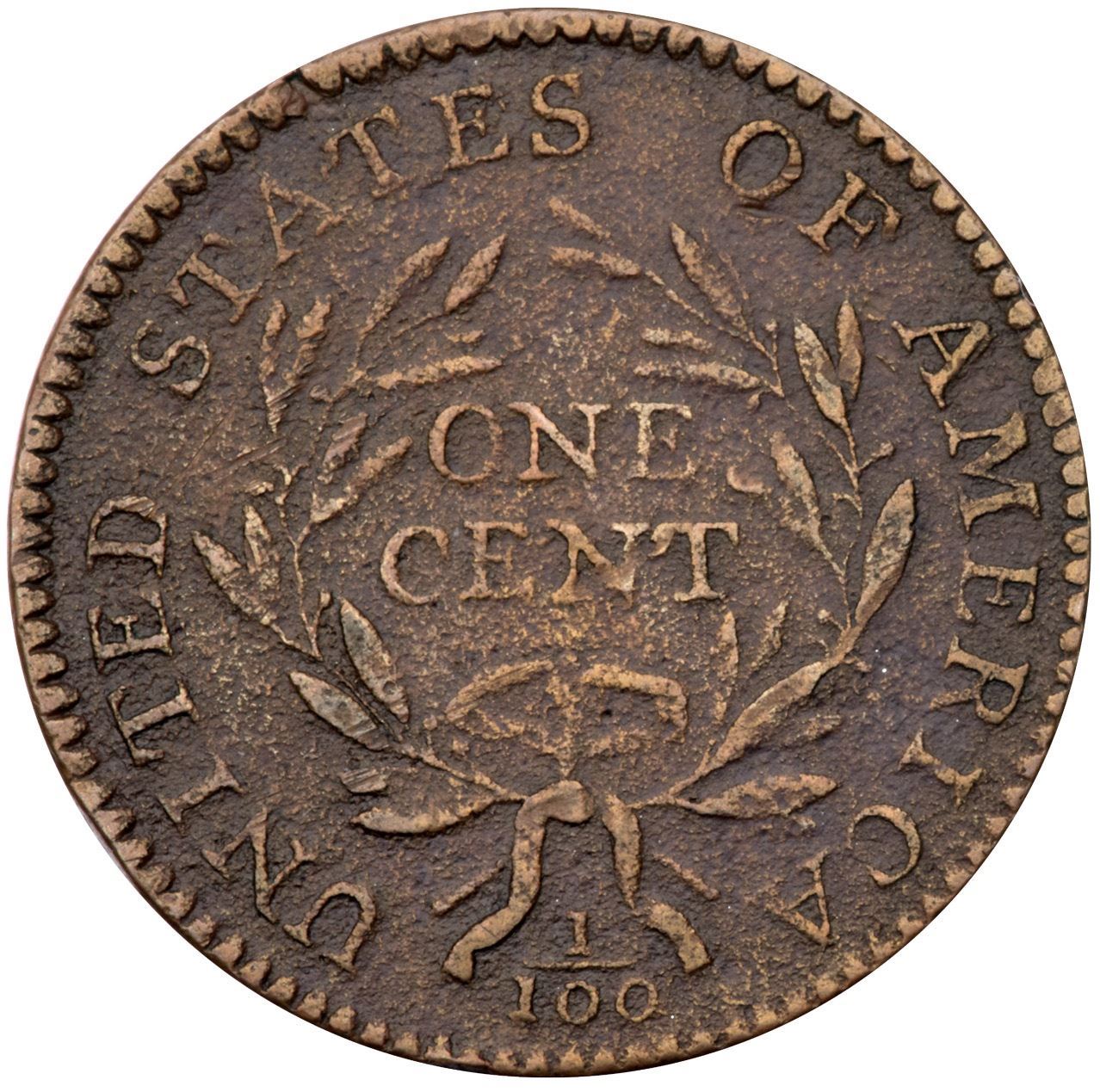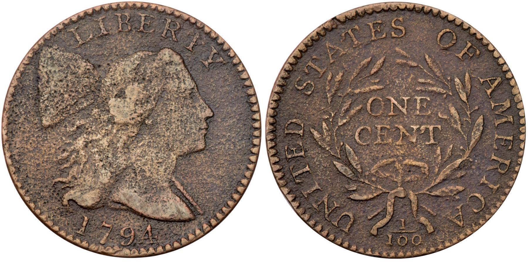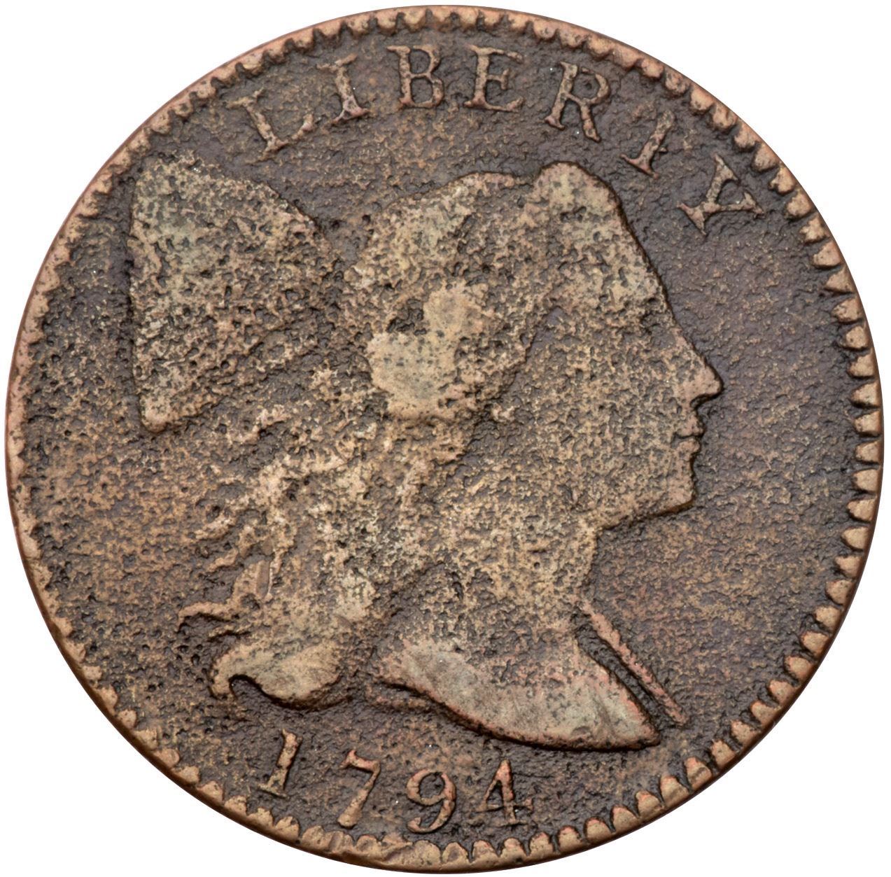 1794 S-66 R-5 VG8Sharpness VF20 but both sides are covered with uniform fine porosity. No verdigris and the only mark is a small nick or chip on the rim over the second T in STATES. Slightly glossy brown and light chocolate. E-MDS, Breen state II, with a fine die crack along the lower edge of the pole. A nicely detailed example of this tough variety, one of the sharpest known. Graded VF20 net VG7 and tied for CC#12 in the Noyes census, his photo #25727.Certificate Number: Pedigree: Ex Hance Jaquett 6/1979-Fred H. Borcherdt Collection