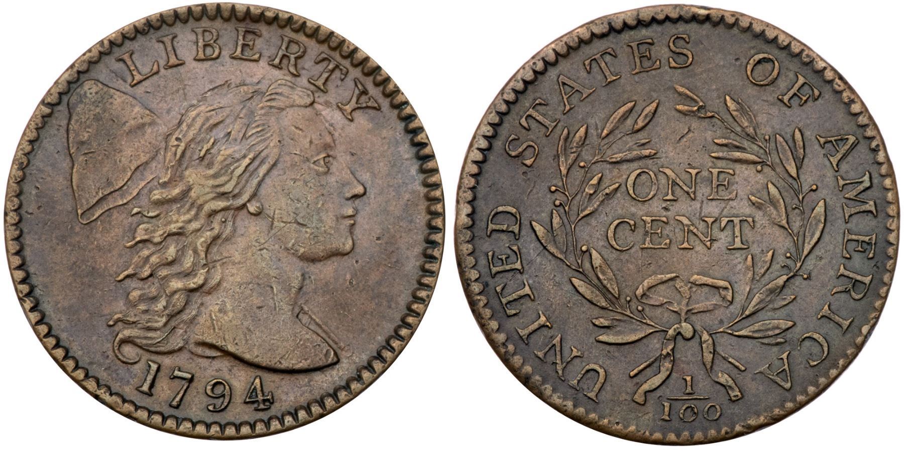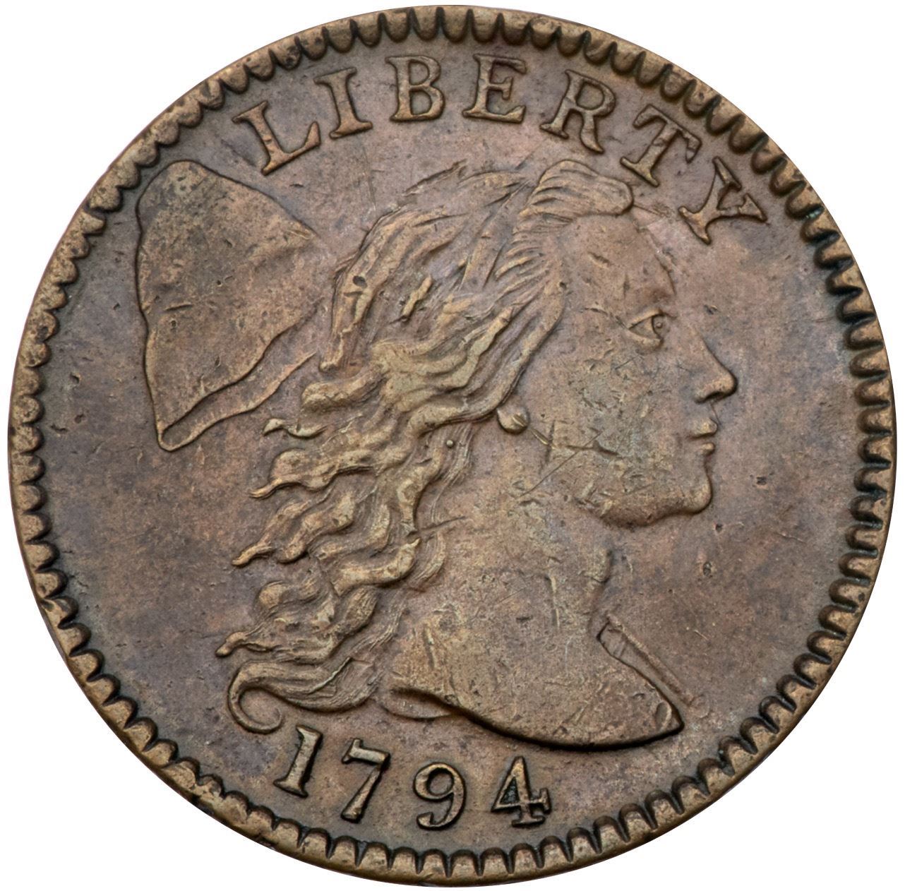 1794 S-67 R-3 Head of 1795 VF30+At least five points sharper with a bold strike and great eye appeal, but there are small contact marks on both sides, none significant but too many to ignore. The best identifying defects are a thin nick left of the L in LIBERTY and tiny rim nicks at the second S in STATES and the I in AMERICA. Glossy light chocolate brown mixed with lighter brown, particularly on the obverse. MDS, Breen state III, with fine die cracks and die clashmarks on the obverse. Called EF40 net VF25 and tied for CC#21 in the Noyes census, his photo #25716. Comes with a great provenance that has been traced back well over 100 years.Certificate Number: Pedigree: Ex Lorin G. Parmelee, New York Coin & Stamp 6/25/1890-Howard R. Newcomb, J. C. Morgenthau & Co. 2/7/1945-Harold Bareford, Stack's 3/17/1987:138 (EF40, plated)-J. J. Teaparty-Fred H. Borcherdt Collection