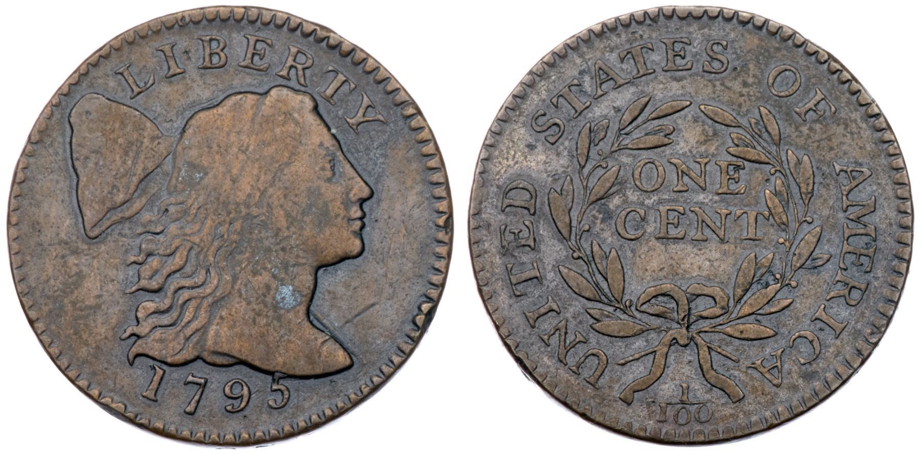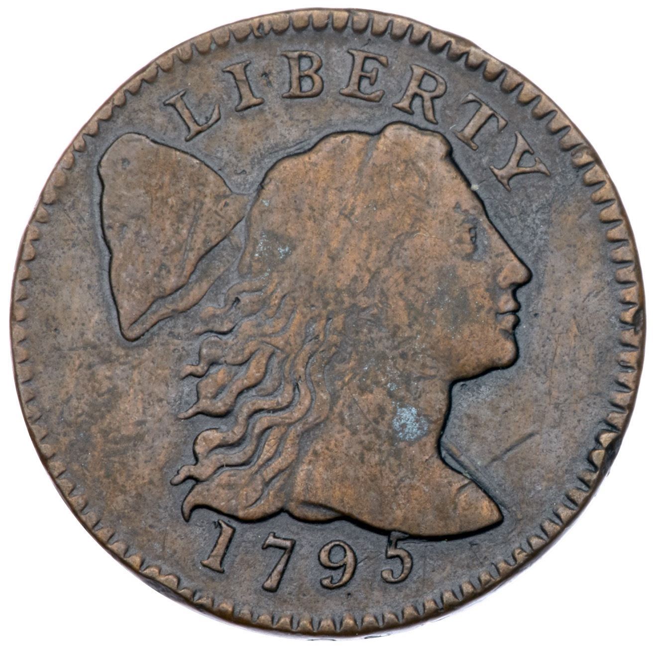 1795 S-74 R-4- Lettered Edge F15+Close to VF20 but there is a light scratch up from the bust, another on the cap, a dull rim nick before the neck, and a tiny rim bruise just left of the date. Smooth with attractive glossy chocolate brown toning delicately woodgrained with lighter brown on the obverse. E-MDS, Breen state II, with a die crack on the reverse but no bulge at the 7. The date and legends are all strong.Certificate Number: Pedigree: Ex Robert S. Carter, Jr.-1967 ANA Sale (Paramount International Coin Corp.), lot 173-Richard Picker-Denis W. Loring 1978-Fred H. Borcherdt Collection (includes the ANA auction lot envelope)