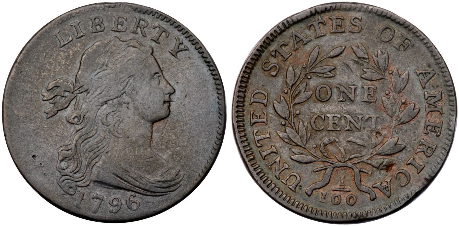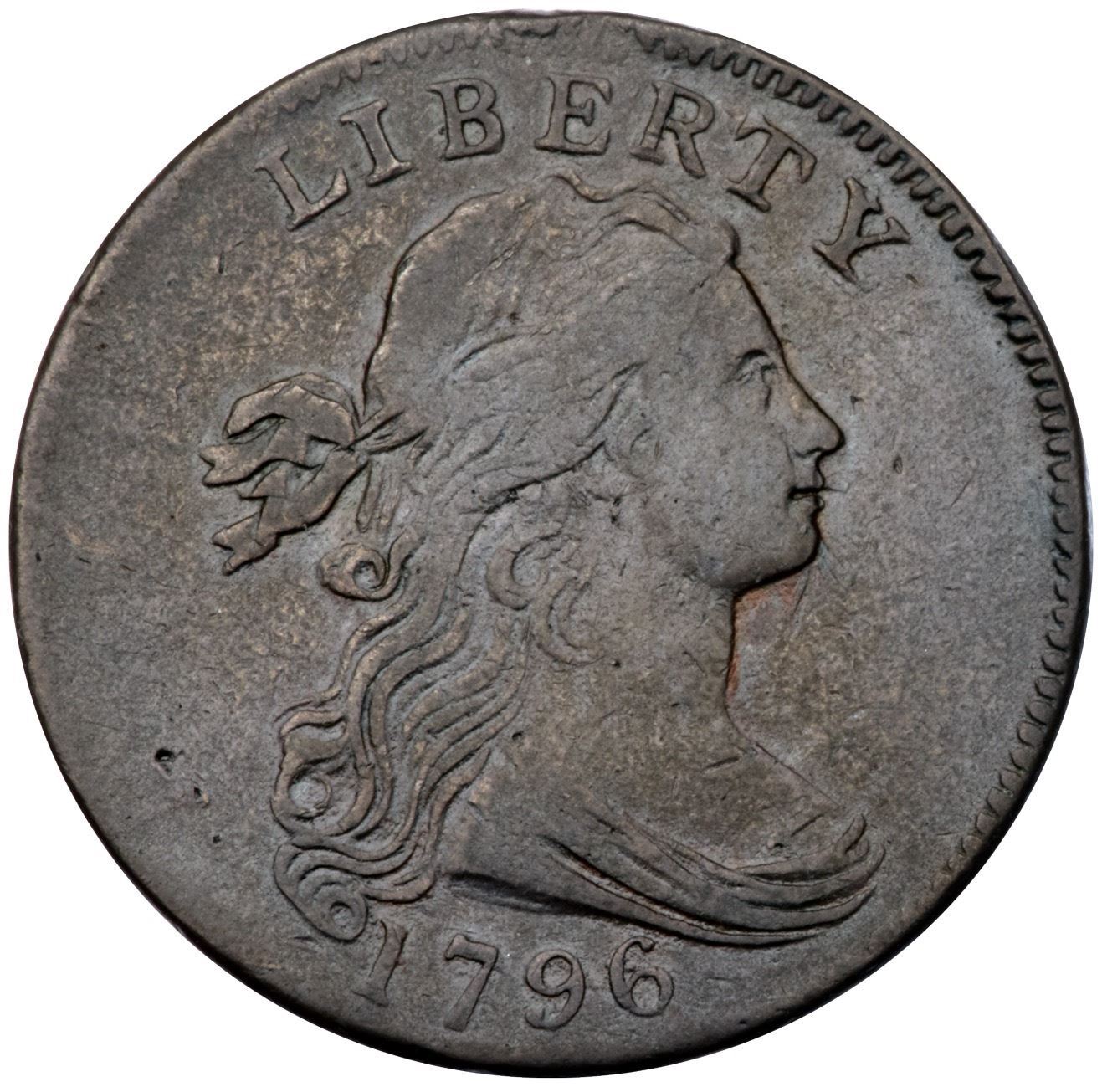 1796 S-115 R-3 Draped Bust F15At least 5 points sharper but there are some light rim bruises on both sides and two pits on the reverse: one at the bottom of the T in CENT and another below the C in AMERICA. Glossy chocolate brown and steel with traces of lighter reddish brown in protected areas, mostly on the reverse. E-MDS, Breen state II late, with clashmarks but no cracks on the obverse. Called F15 net VG10 and tied for CC#14 in the Noyes census, his photo #25846.Certificate Number: Pedigree: Ex Mid-American Rare Coin Auctions 5/24/1985:39 (as VF20, plated)-Fred H. Borcherdt Collection