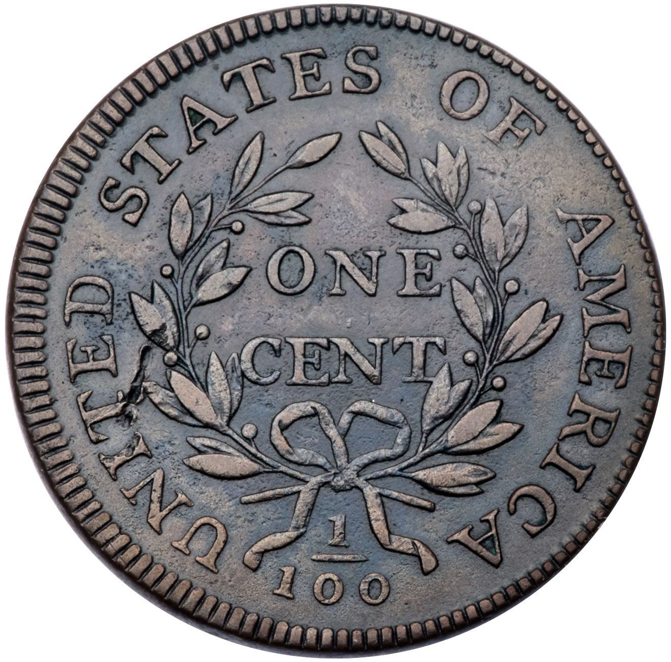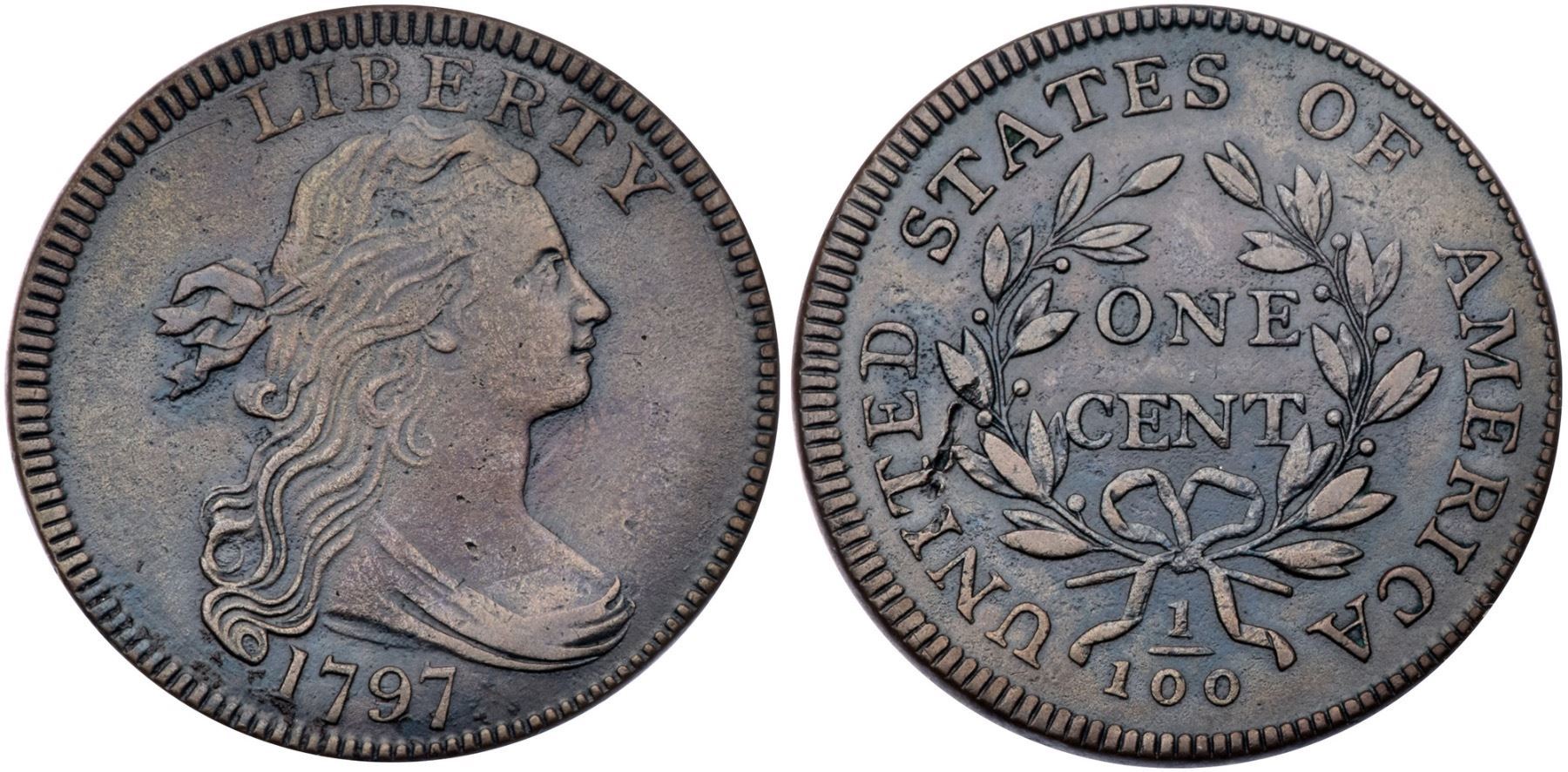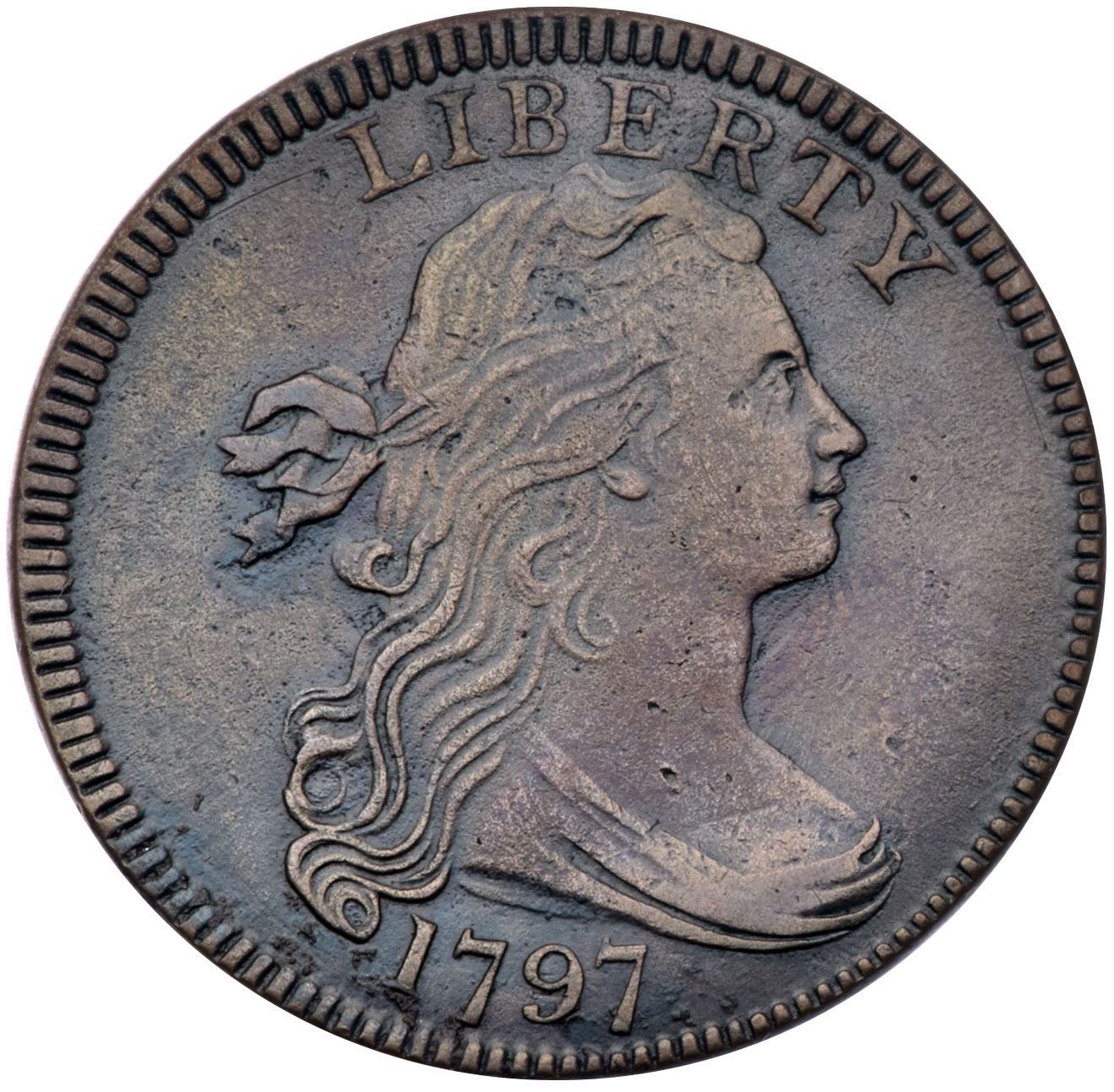1797 S-125 R-5 VF20Sharpness VF35 but covered with fine porosity, strongest in a small patch close below the hair ribbon. There are microscopic specks of verdigris left of the date, and the only notable contact mark is a line of dull but relatively strong nicks under IT in UNITED. Partly glossy medium steel brown blending to chocolate in protected areas. Possibly retoned long ago. MDS, Breen state II, with obvious bulges at the date, bust, and into the field above. Struck with the reverse rotated 20 degrees CCW. Graded VF35 net VF25 and tied for CC#1 in the Bland census. Noyes says VF35 net VF20 and tied for CC#2, his photo #26388. Not perfect but clearly one of the finest of this tough variety, and most of the top pieces have similar surfaces defects.Certificate Number: Pedigree: Ex William Van Roden, Stack's 5/2/1968:208-Dr. Hiram T. Ward 1978 (via Denis W. Loring)-Fred H. Borcherdt Collection