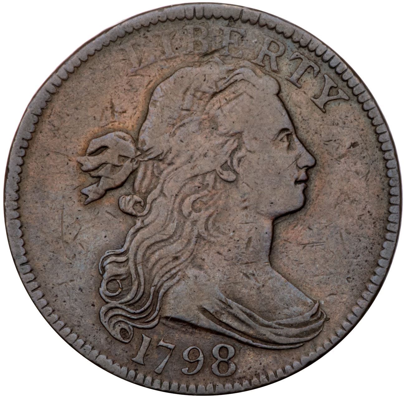 1798 S-147 R5- Large 8, Style I Hair VG10+Glossy brown and light olive with reddish brown in protected areas on the reverse. Slightly sharper with smooth surfaces and very nice eye appeal, but there are some light contact marks at the top of the obverse. A dull nick at the base of the B in LIBERTY is the only notable mark, but the strike is a bit uneven with weakness on the left edge of the reverse thanks to that die being slightly misaligned to K-9 while the obverse is nicely centered on the planchet. EDS, Breen state I, before any die cracks on the reverse. Graded VG10 and tied for CC#10 in the Bland census. Noyes says F12 net VG10 and tied for CC#7, his photo #26274.Certificate Number: Pedigree: Ex C. R. Mathewson-Robert Le Blanc (Le Blanc Numismatics) 6/1982-Denis W. Loring-Fred H. Borcherdt Collection