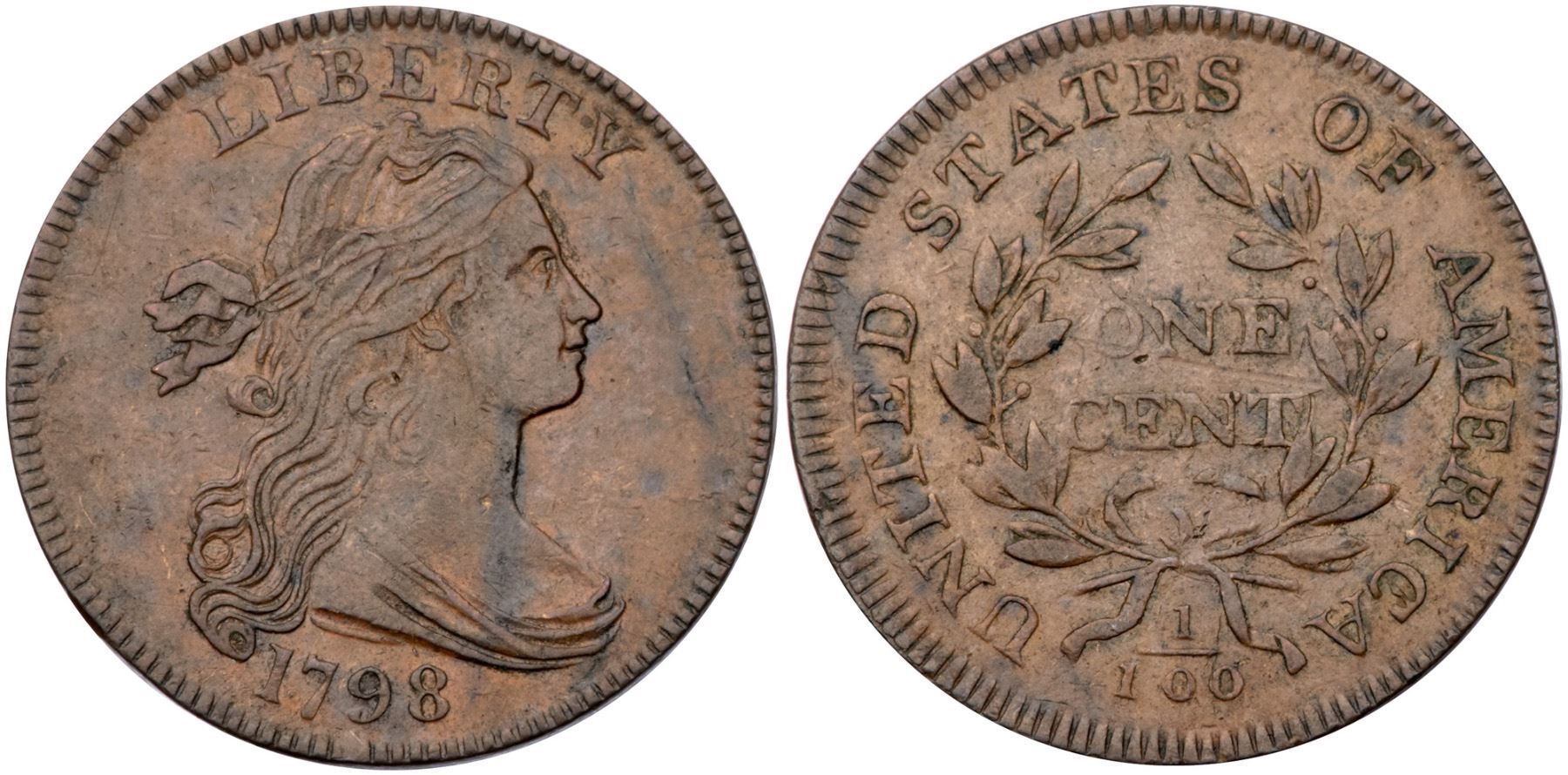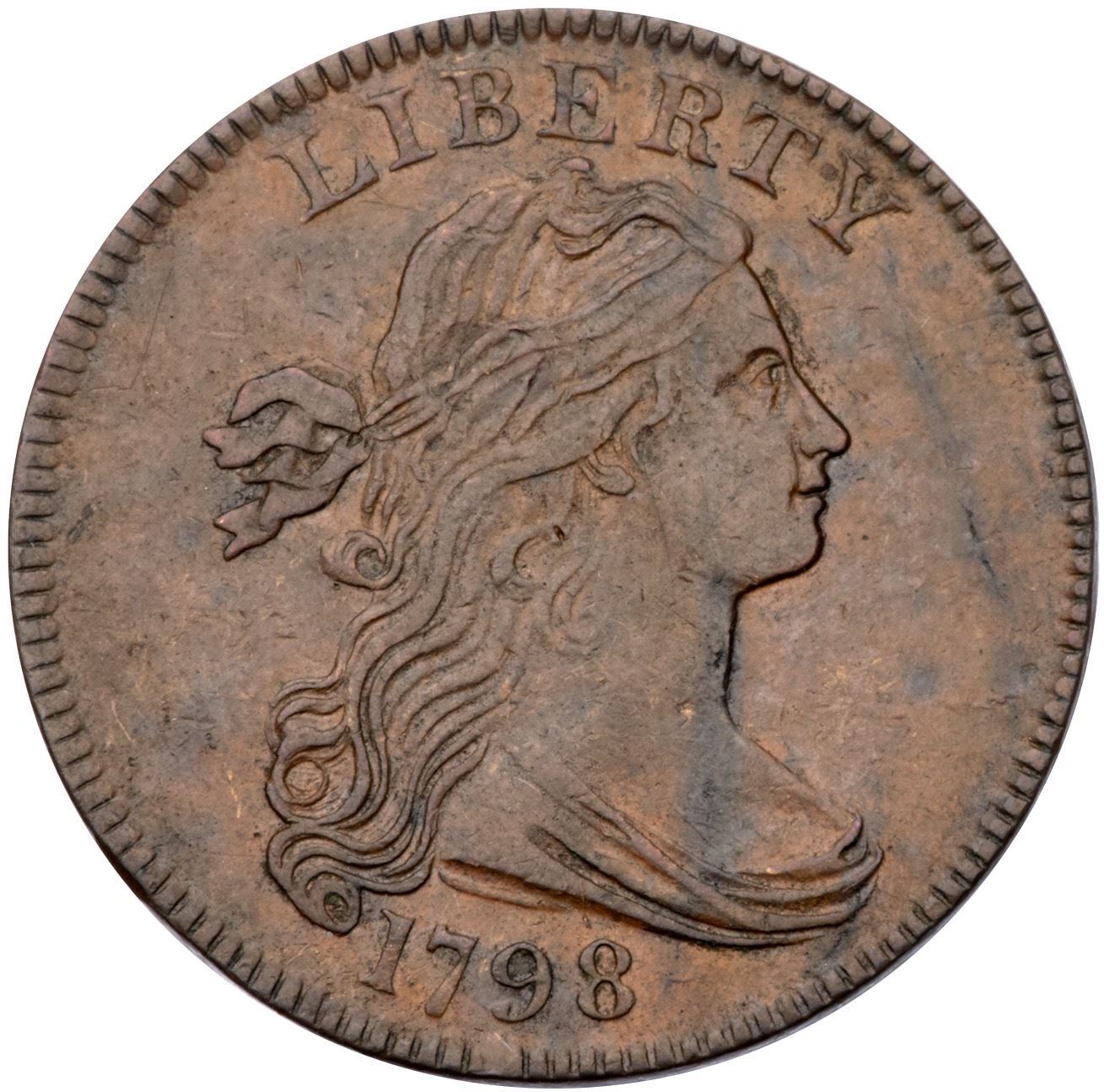 1798 S-157 R2 Small 8, Style I Hair VF20+Sharpness VF30 with smooth surfaces and very nice eye appeal, but there is a dull scratch under ONE. Glossy light to medium brown with wisps of darker olive brown toning on both sides and frosty tan in protected areas. E-MDS, Breen state II late, with a faint line of small lumps in the field before the neck but no crumbling on the profile and no crack through the date.Certificate Number: Pedigree: From the Fred H. Borcherdt Collection