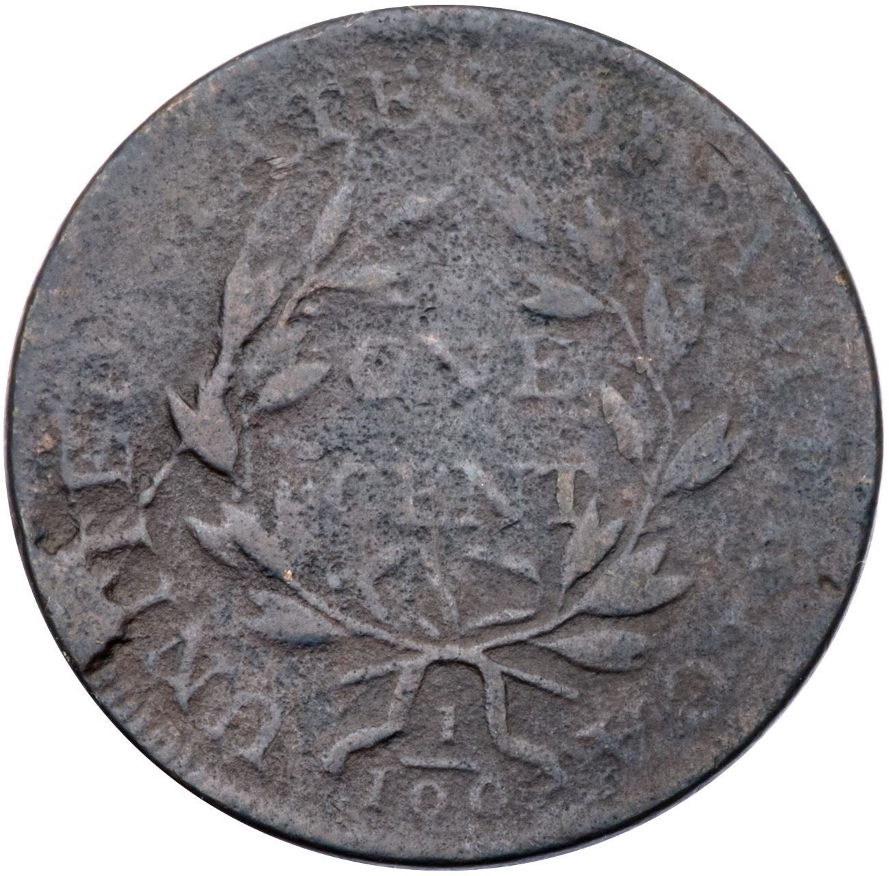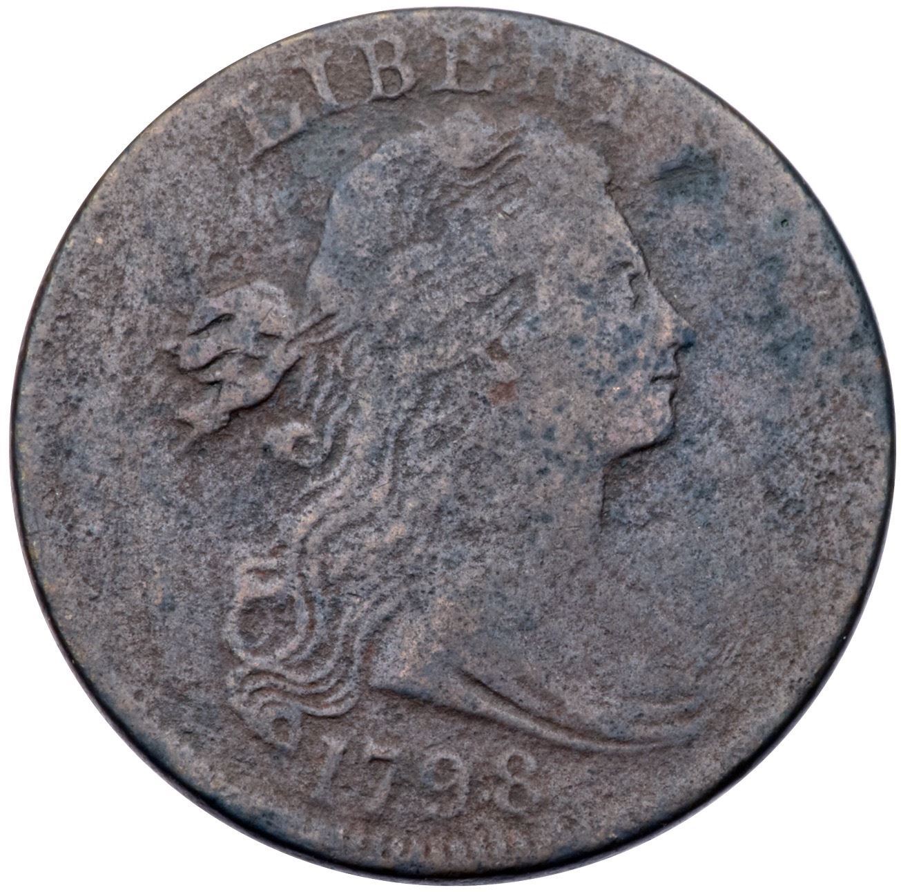 1798 S-158 R4 Small 8, Style I Hair G6Several points sharper but covered with light to moderate corrosion. No notable verdigris or contact marks. A small planchet flake at the rim over the R in AMERICA can help identify this cent. Slightly glossy dark chocolate brown and steel. Not a pretty cent but the date is strong and the legends are clear. Extremely rare M-LDS, Breen state V, with a strong cud break connecting IT to the rim above. Only five examples of this die state are known to us. Graded F15 net G5 in the Noyes census, his photo #29269.Certificate Number: Pedigree: From the Fred H. Borcherdt Collection