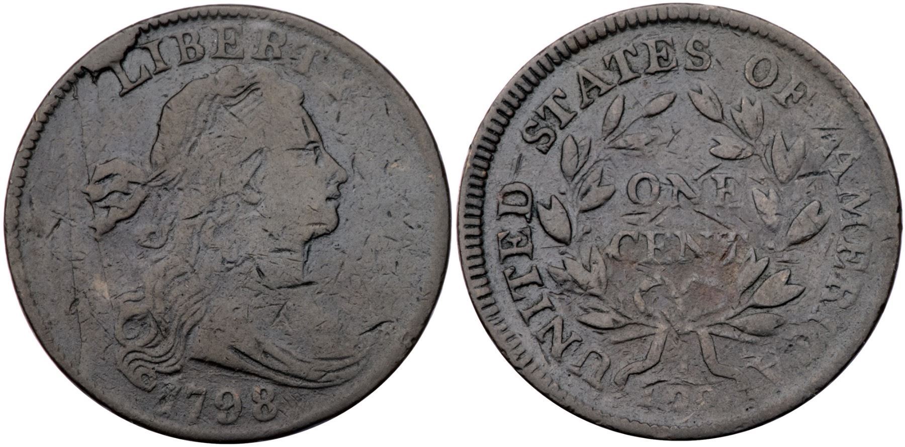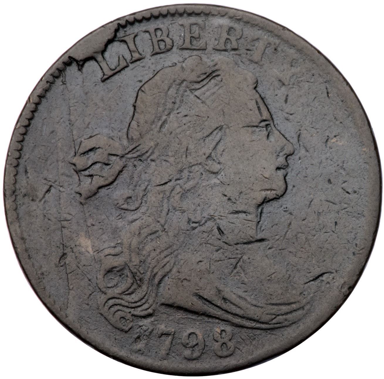 1798 S-159 R3 Small 8, Style I Hair VG8Slightly sharper with some nicks on otherwise smooth, attractive surfaces. Glossy medium chocolate brown with lighter brown on the devices. No corrosion or verdigris. A nick on the 1 in the date and two thin parallel nicks right of the D in UNITED can help identify this cent. Extremely rare TDS, Breen state VII, with a cud break connecting the L to the rim. Struck with the reverse rotated 20 degrees CCW. Graded F12 net VG10 and finest of only 6 known of the die state in the Noyes census, his photo #38322.Certificate Number: Pedigree: Ex Denis W. Loring 5/5/1983-Richard V. Punchard-Fred H. Borcherdt Collection