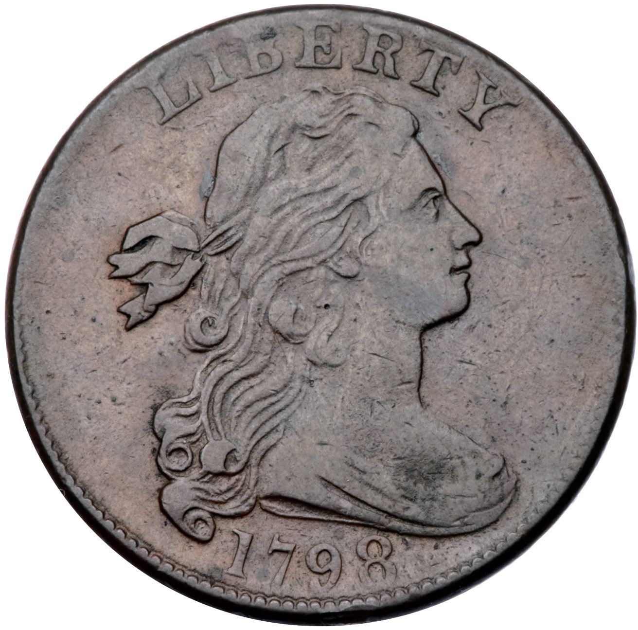 1798 S-167 R1 Large 8, Style II Hair VF25Glossy chocolate brown and steel with lighter brown in protected areas on the obverse. Lightly worn and smooth except for a patch of microscopic roughness and verdigris on the bust. A vertical nick over the right top of the T in CENT is the only other notable defect. EDS but not the earliest, Breen state I late, with very light die chips on the reverse. The number "10" is neatly punched into the edge below the date, most likely to identify this piece as the Proskey 10 die variety.Certificate Number: Pedigree: Ex Robert Le Blanc (Le Blanc Numismatics)-Denis W. Loring 6/1982-Fred H. Borcherdt Collection