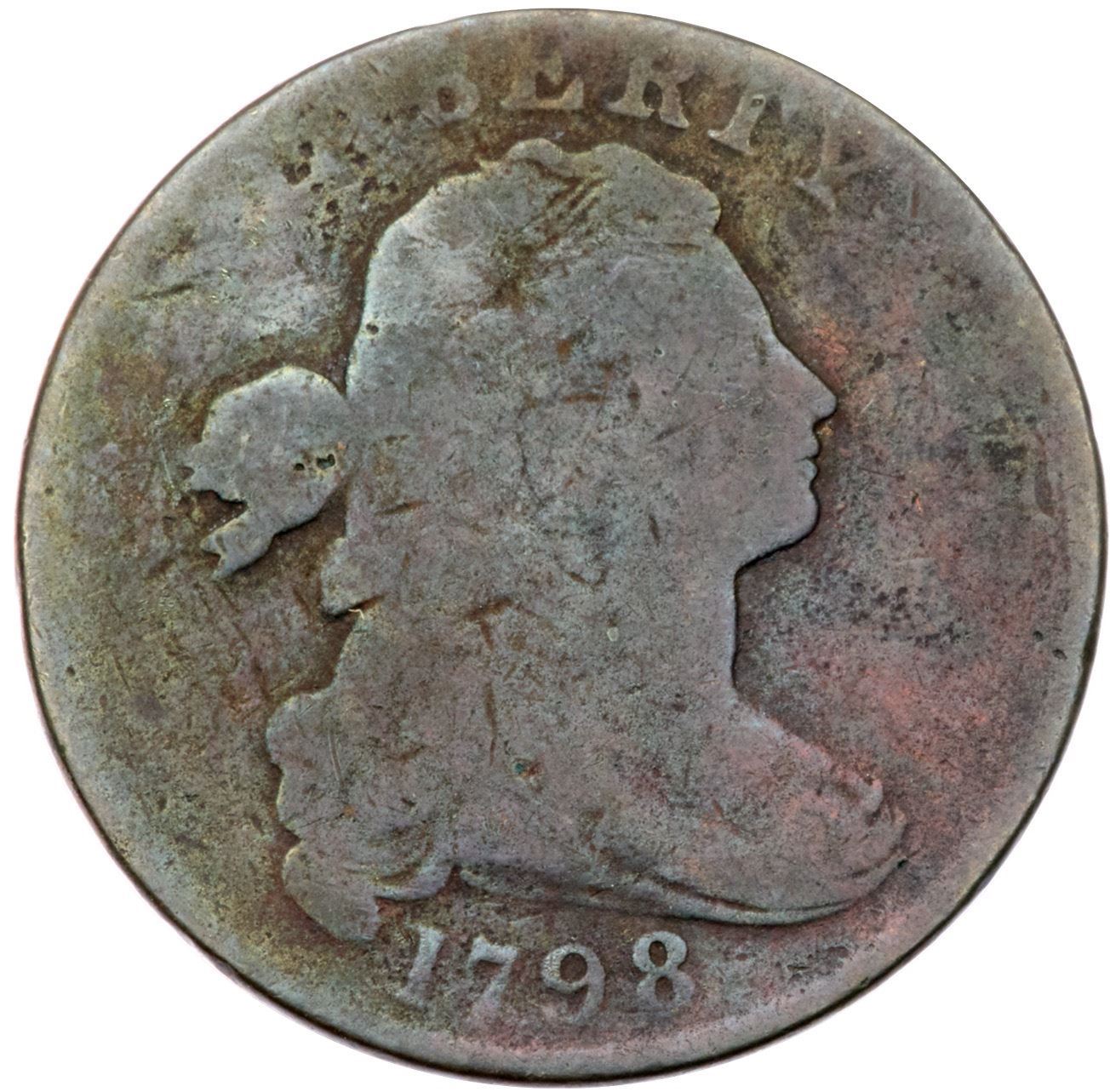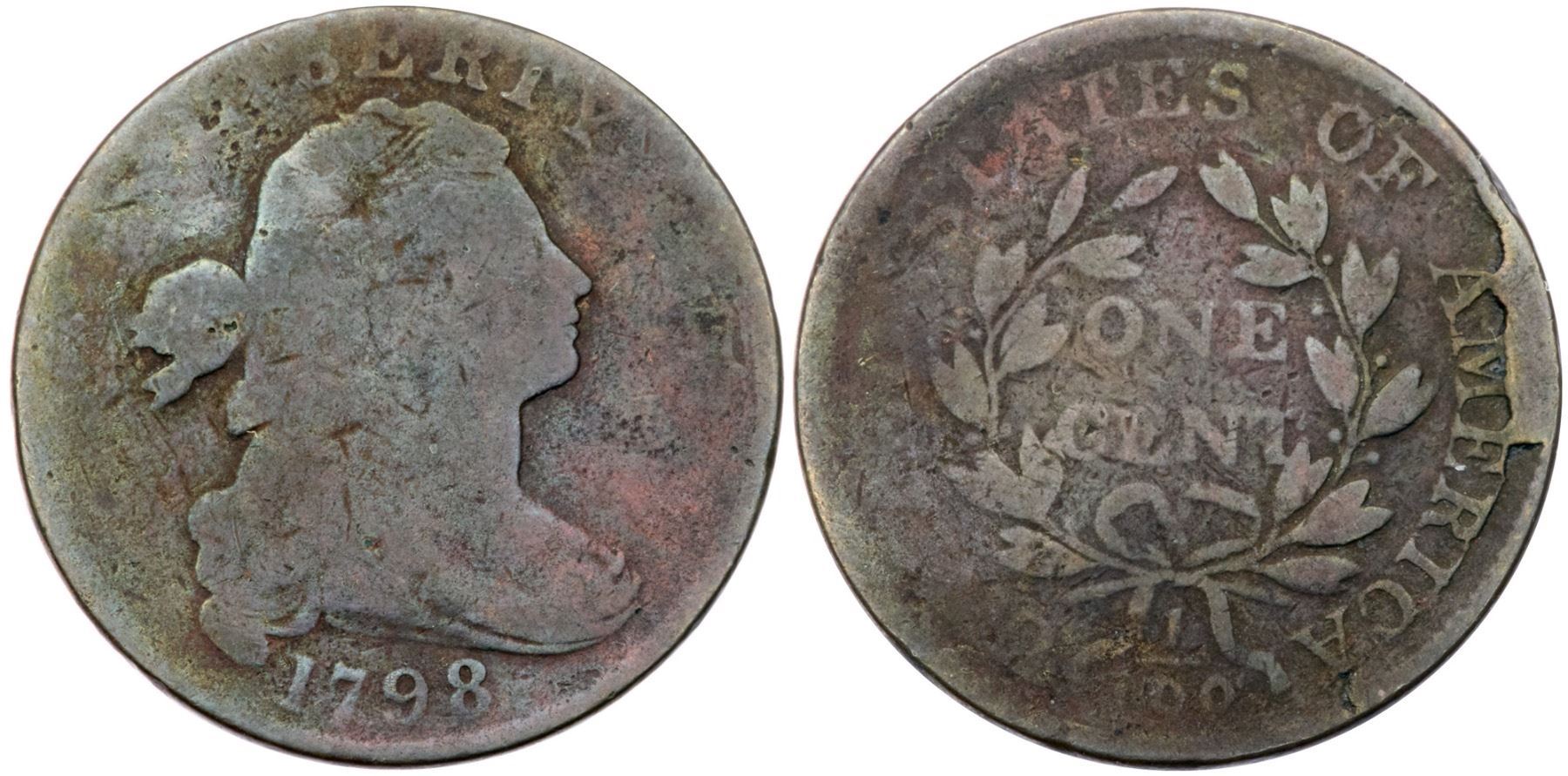 1798 S-168 R3 Small 8, Style II Hair G5Glossy chocolate brown and steel. The highpoints are smooth while traces of extremely fine roughness show in the fields and protected areas. No verdigris and the only notable mark is a small planchet fissure over the second A in AMERICA. The date is strong for the grade and most of the legends are clear. Terminal die state, unknown to Breen, with a bold cud break connecting AM to the rim. Only two examples are known today, and this is the finest piece. Another great die state from the Fred Borcherdt collection.Certificate Number: Pedigree: From the Fred H. Borcherdt Collection (acquired from an unrecorded source in 2013)
