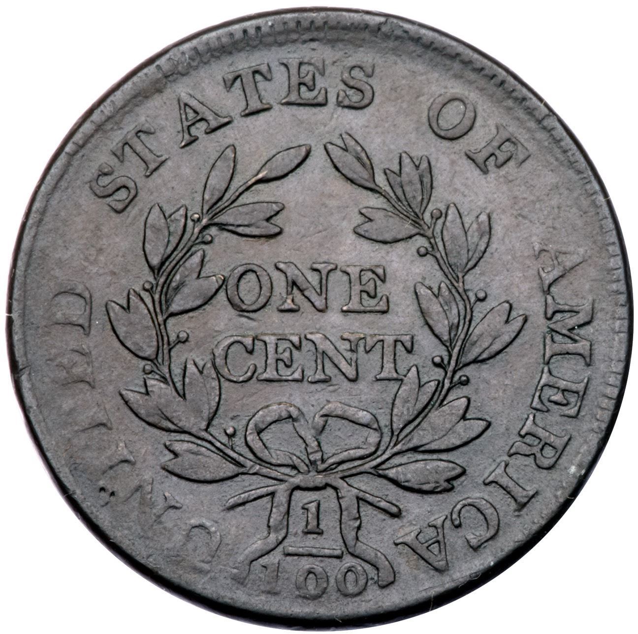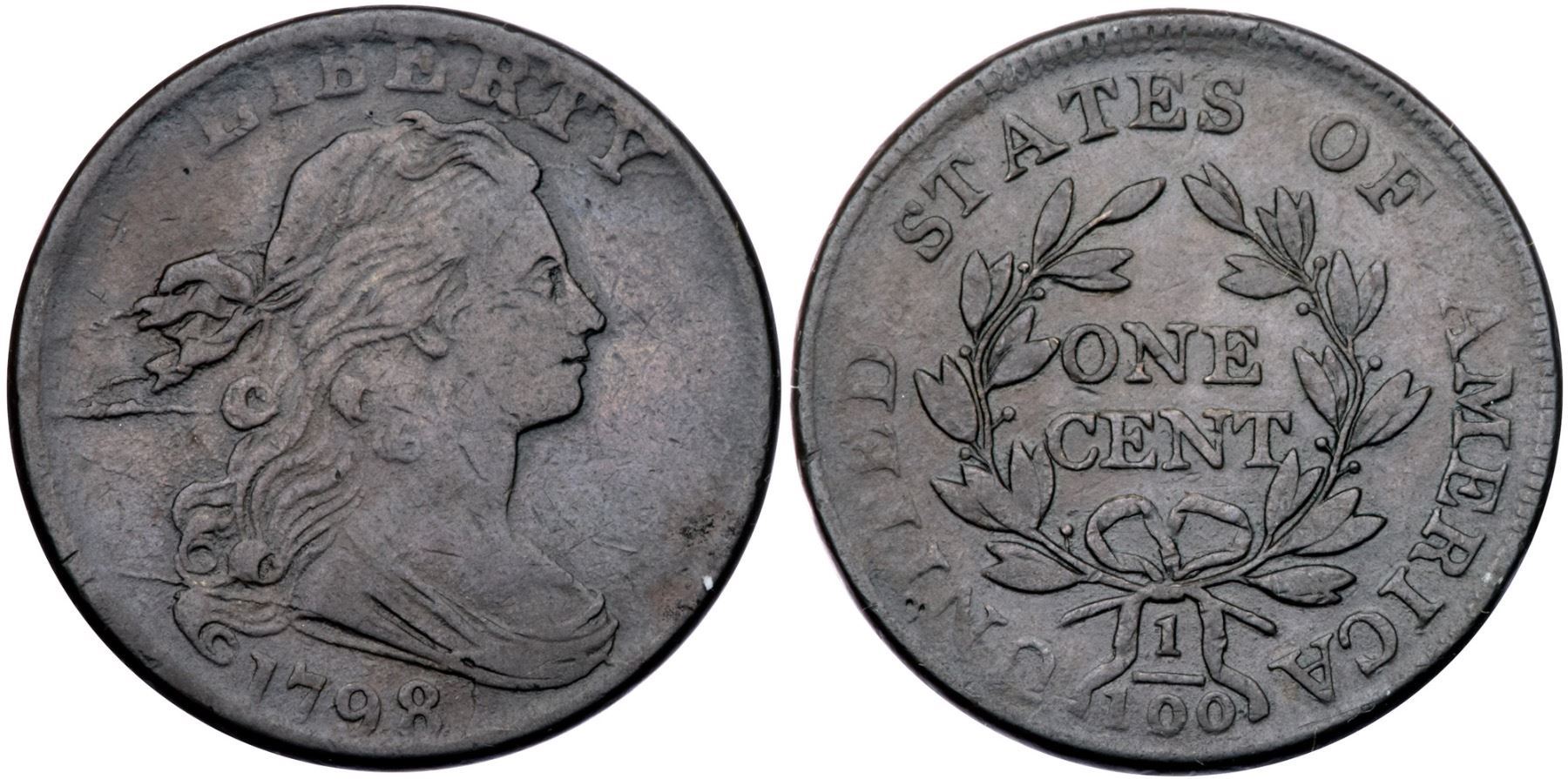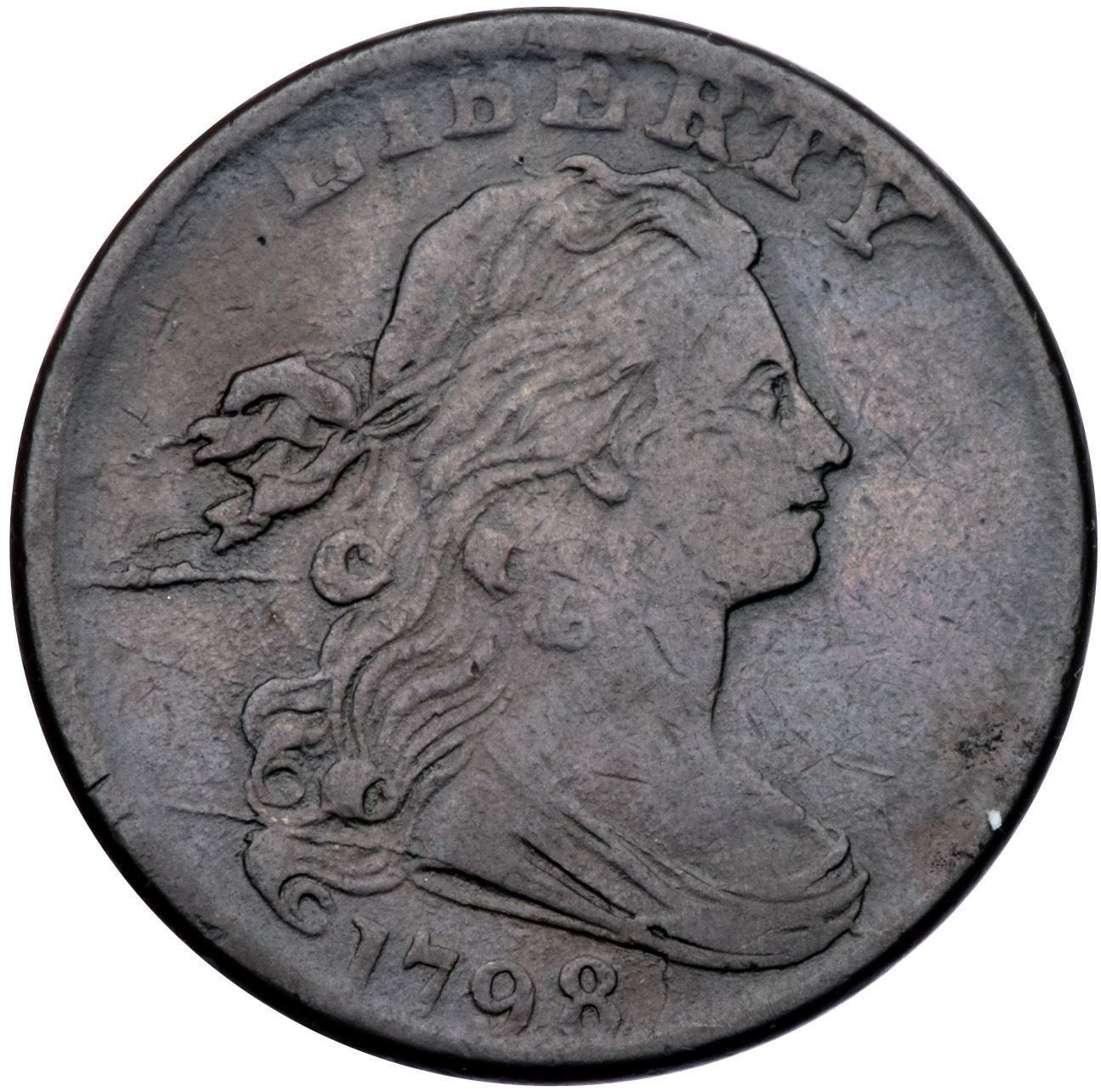 1798 S-181 R3 Small 8, Style II Hair F15+Variety with a Large 00 over Small 00 in the Denominator. Glossy chocolate and steel brown. Smooth with trivial marks and great eye appeal for the grade. A small planchet flake on the rim over the second S in STATES is the only notable mark. LDS, Breen state IV, with several die cracks on the obverse and a slightly raised retained cud break at the bust tip. Struck with the reverse rotated 35 degrees CCW. The small 0's inside the larger 0's in the denominator are clearly visible.Certificate Number: Pedigree: Ex C. Douglas Smith 2/1981-Fred H. Borcherdt Collection