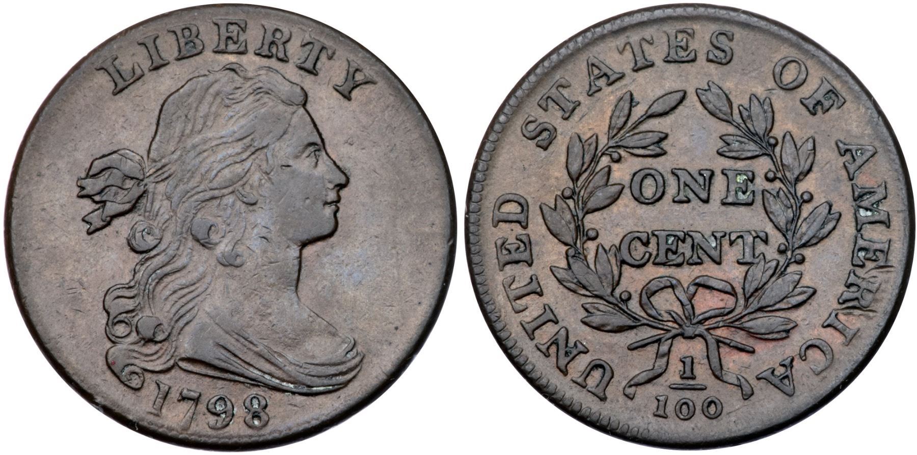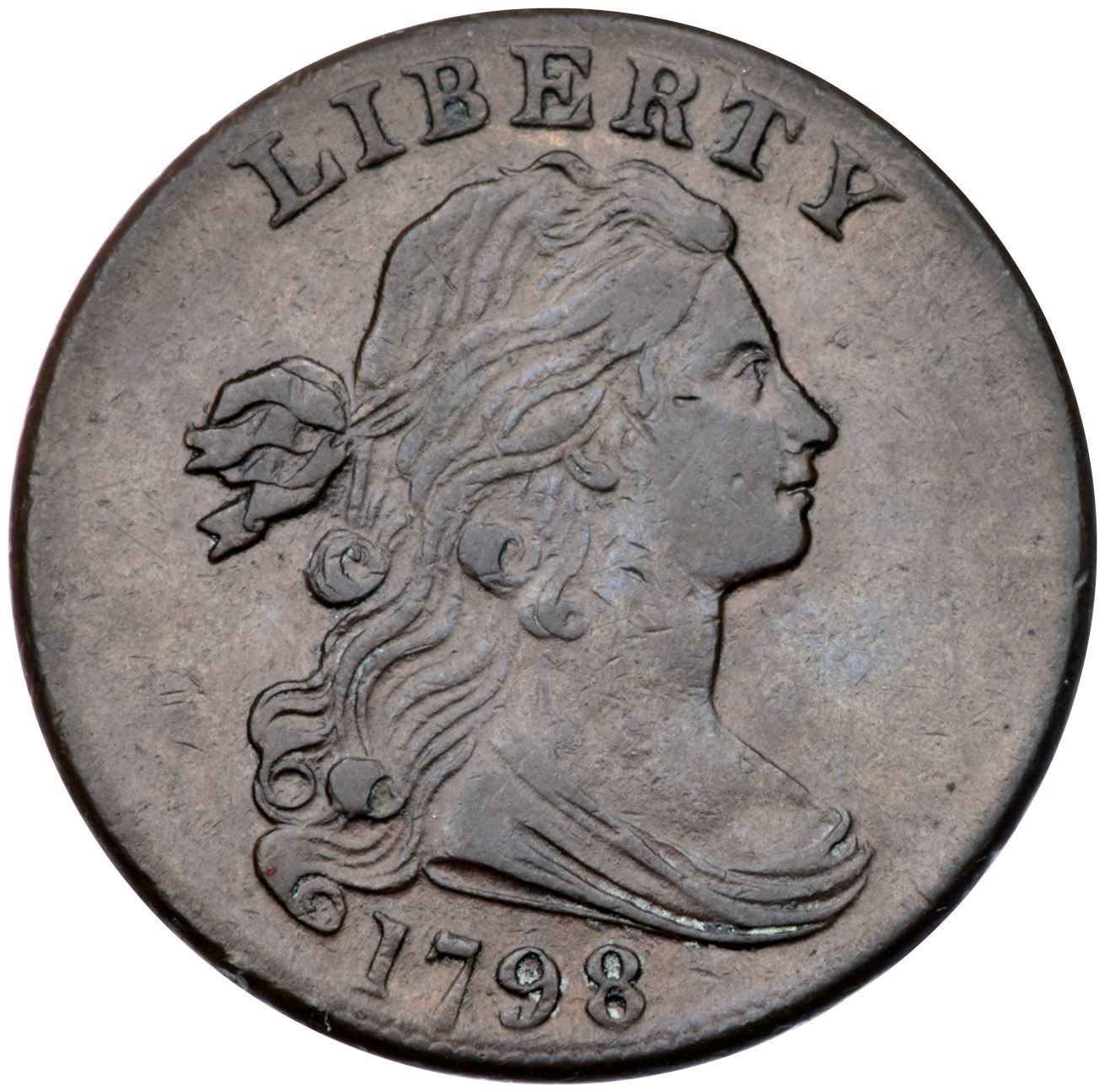 1798 S-187 R1 Small 8, Style II Hair VF30+Sharpness EF40 with smooth surfaces and very attractive glossy light chocolate brown toning, but there are a few contact marks. A pair of nicks left of the eye and two stronger marks at ER in AMERICA are the only notable defects. Traces of mint frost show in protected areas and there is some reddish brown toning inside the right ribbon loop. E-MDS, Breen state II, with die cracks on both sides.Certificate Number: Pedigree: Ex Dr. Hiram T. Ward-Denis W. Loring 1/1980-Fred H. Borcherdt Collection