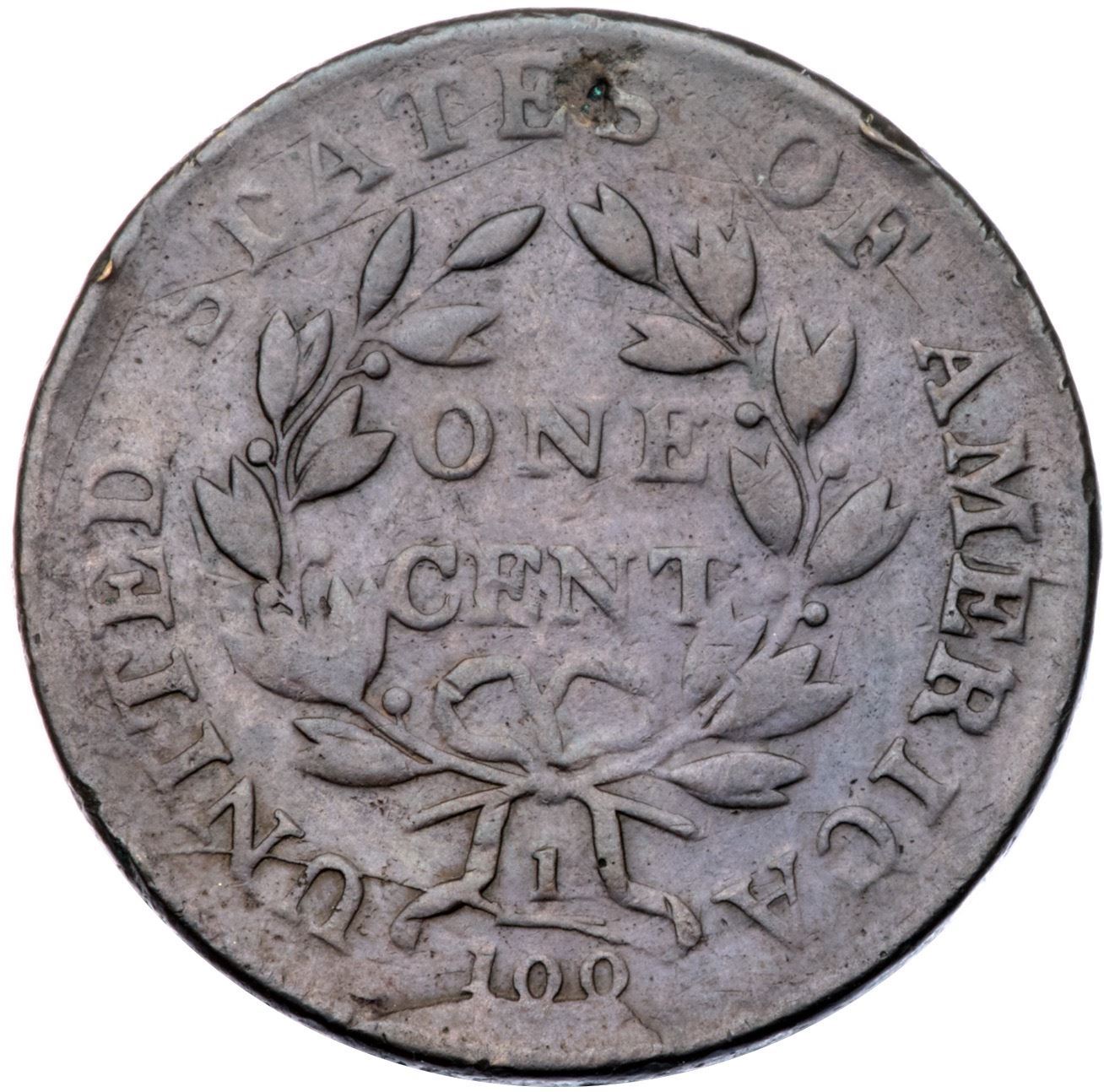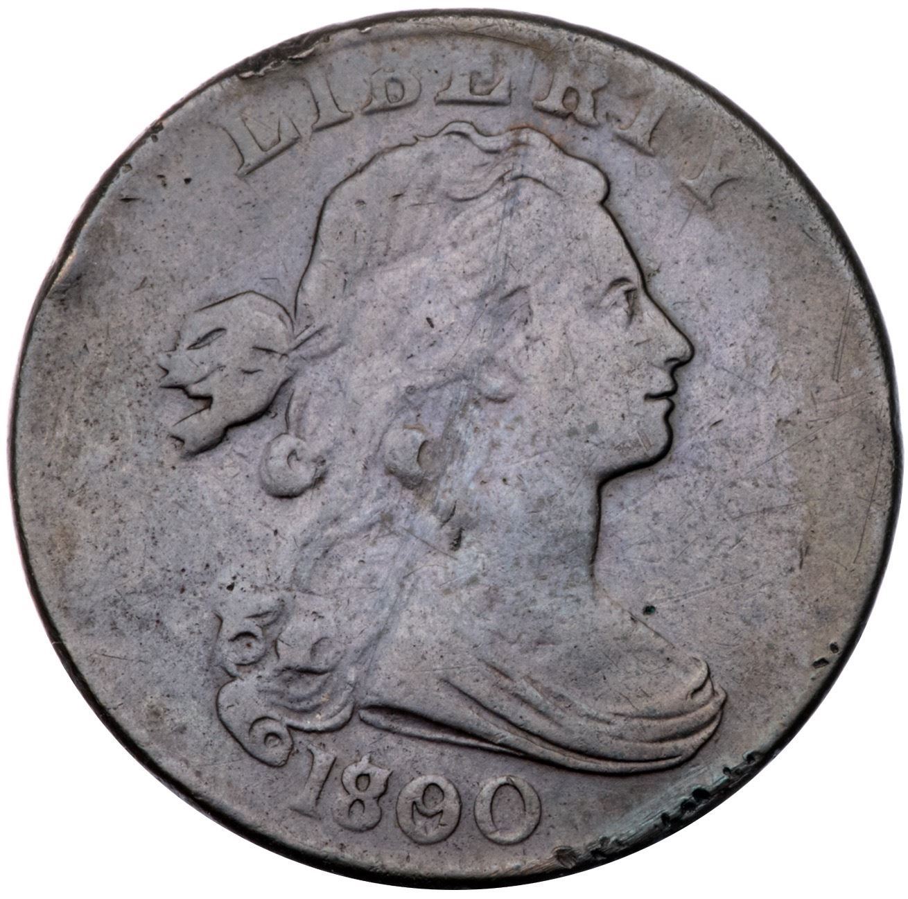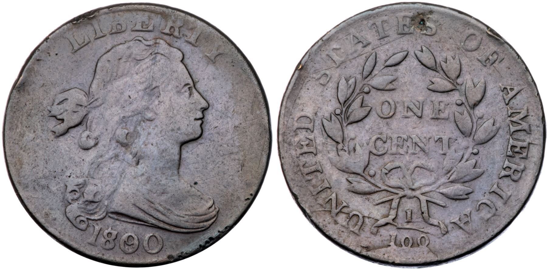 1800/79 S-193 R4 Overdate 80 over 79, Style II Hair VG10Five points sharper with several small rim bruises on both sides and a pit at the rim over ES in STATES. Otherwise the surfaces are smooth with only trivial marks and the toning is an attractive glossy light olive brown and steel. Semi-unique terminal die state, Breen state V, with a cud break connecting the denominator to the rim below. This is the Noyes plate coin for the die state and is graded F12 net VG7 in his census, photo #26102. The only other piece known to us is a corroded VF20 sharpness net VG8 (Daniel Holmes sale, McCawley & Grellman Auctions/Goldbergs 9/7/2009:362). The piece offered here is clearly superior in our opinion.Certificate Number: Pedigree: From the Fred H. Borcherdt Collection