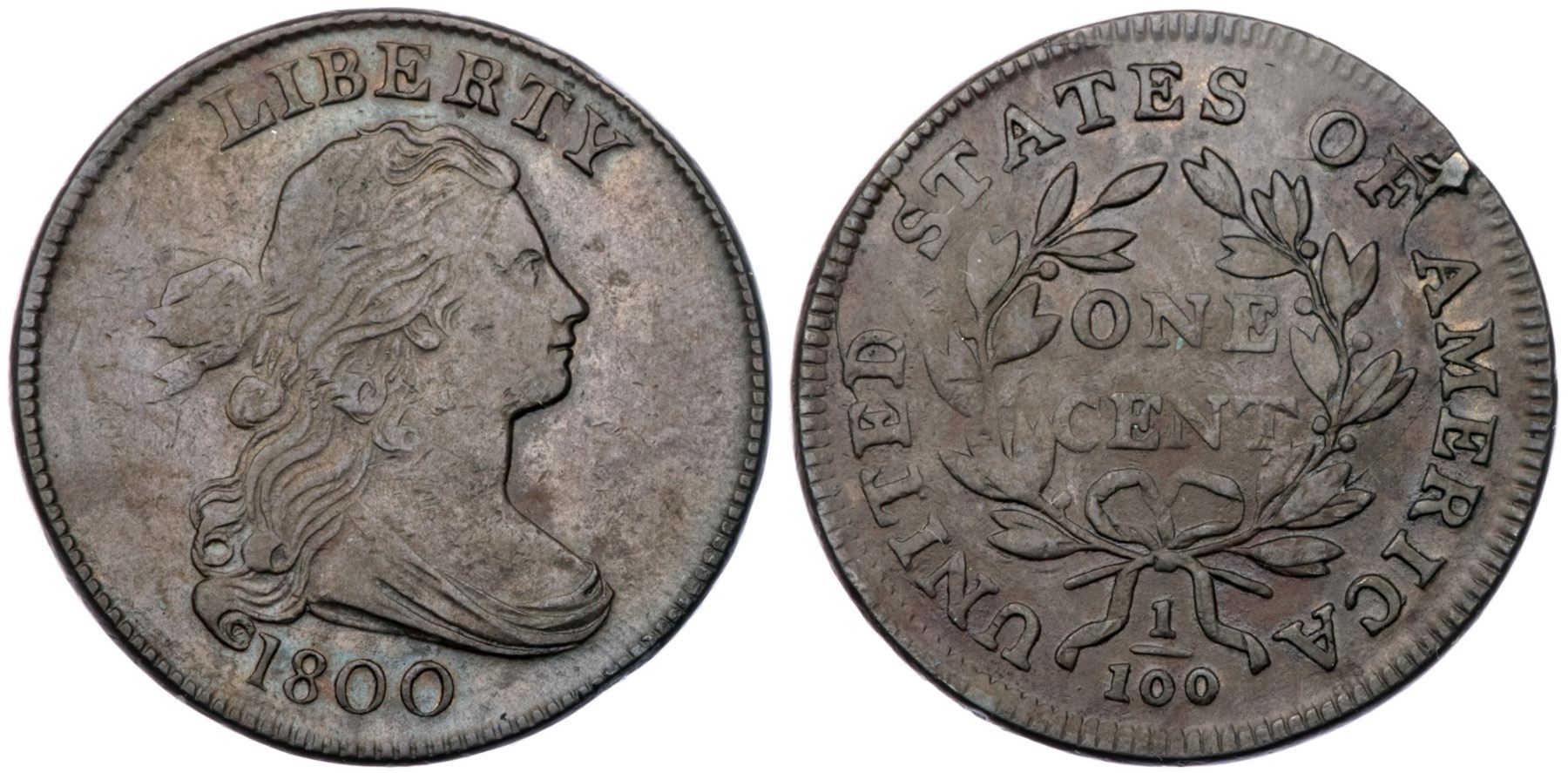 1800 S-199 R4 VF25Glossy light olive and chocolate brown with some slightly darker toning at OF AMER. Smooth with trivial contact marks, none notable. MDS, Breen state V, with a small but bold cud break at the F in OF in addition to other cracks and swelling on the reverse. Called VF25 net F15 and tied for CC#9 in the Noyes census, his photo #26689.Certificate Number: Pedigree: Ex George Ross-George Ramont-Fred H. Borcherdt Collection (includes the Ramont collection envelope)