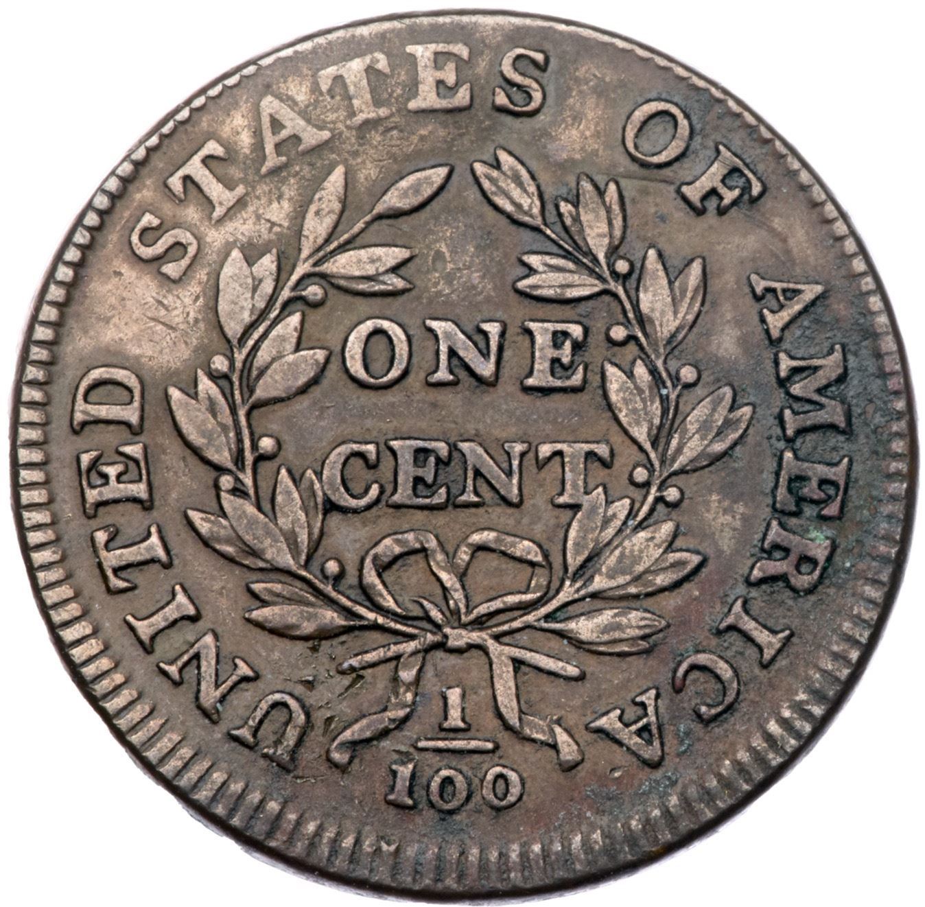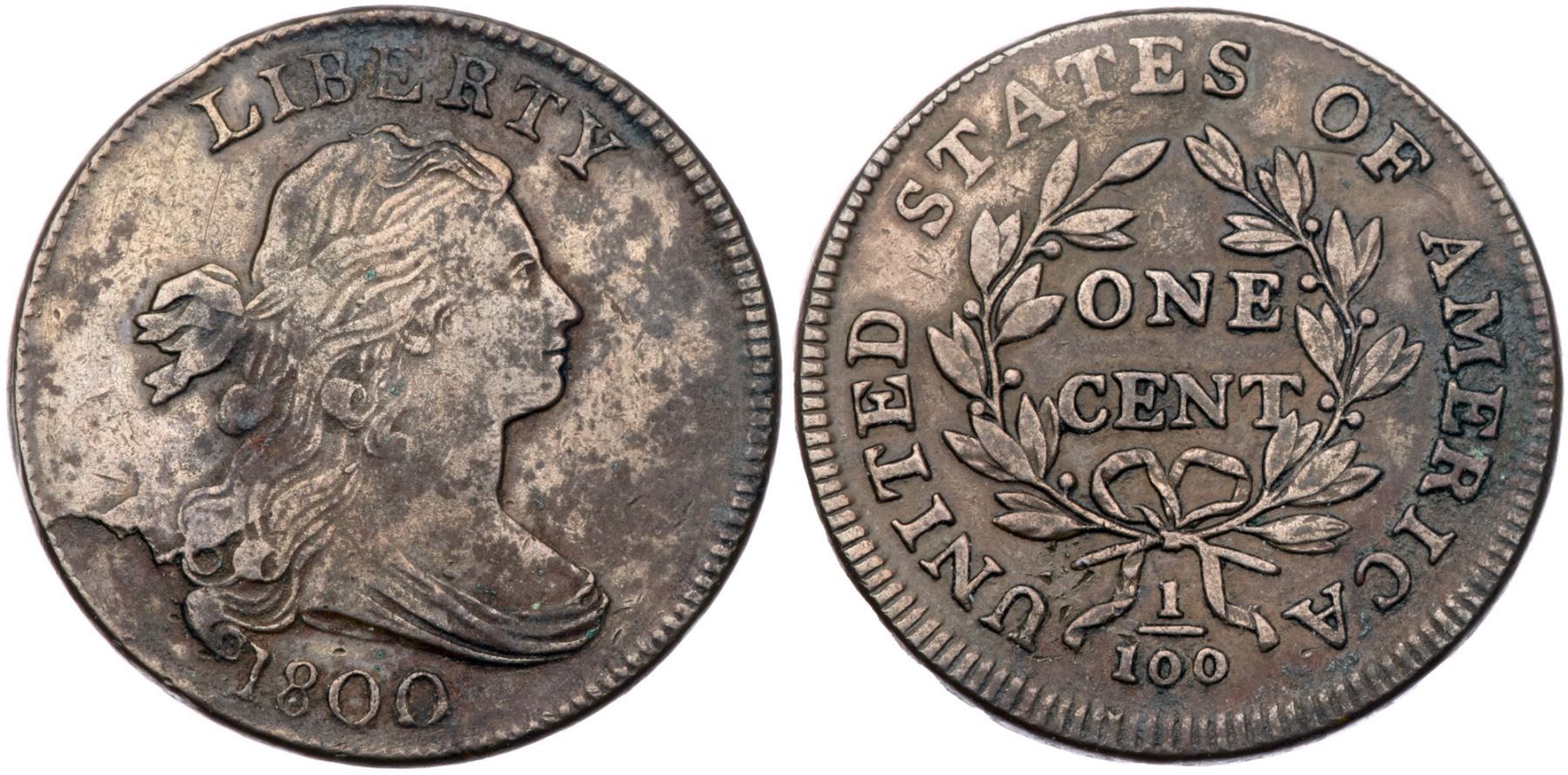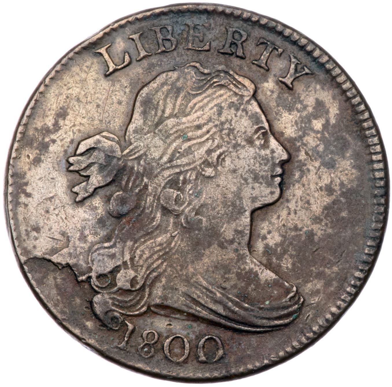 1800 S-202 R4+ F15Ten points sharper but there are traces of fine verdigris in protected areas, mostly on the right side of the reverse. Rather glossy mix of medium brown and light olive blending to darker chocolate and olive brown in a few places. The only notable signs of contact are a small rim bruise at the L in LIBERTY, a pair of light vertical scratches in the field behind the head, and a few tiny ticks around the stem under the U. E-MDS, Breen state II, with an obvious bulge at ATE. Graded VF20 and tied for CC#6 in the Bland census. Noyes says VF25 net F12 and tied for CC#11, his photo #39052. Comes with the famous (infamous) Sheldon-ANS-Naftzger provenance.Certificate Number: Pedigree: Ex ANS Museum Collection (as part of the legal settlement with Naftzger) 2001-R. E. "Ted" Naftzger, Jr. (via William C. Noyes)-Fred H. Borcherdt Collection