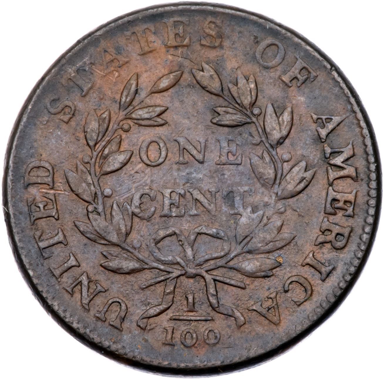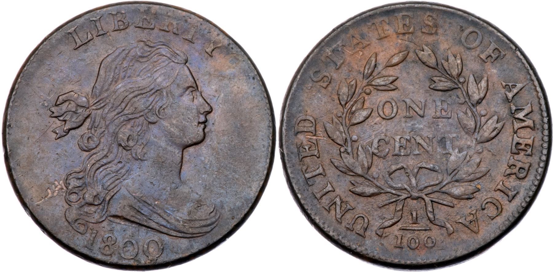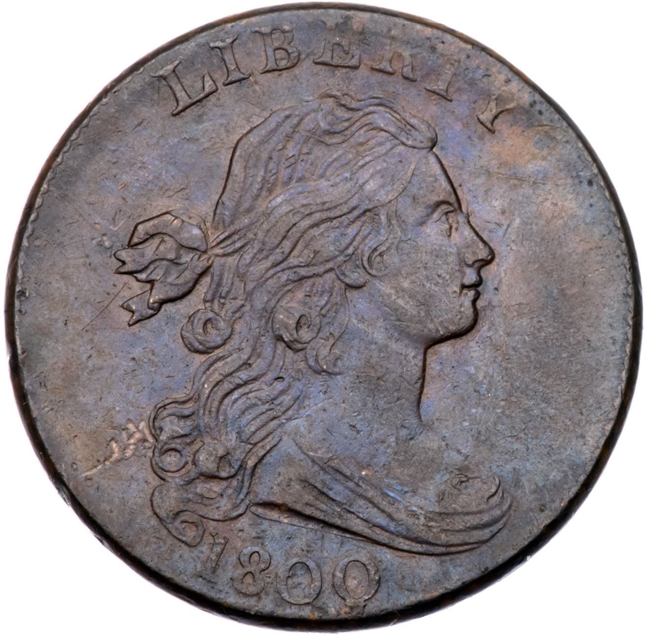 1800 S-212 R3 VF25Sharper by at least 10 points but there is a collection of small, dull marks in the field left of the lowest curls and more at CE in CENT and TA in STATES. Otherwise the surfaces are smooth and satiny and the overall eye appeal is quite nice. Glossy light to medium brown and steel with frosty lighter brown in protected areas. LDS, Breen state VI, with all the fine die cracks described by Breen. Graded EF40 net VF25 and tied for CC#14 in the Noyes census, his photo #38150.Certificate Number: Pedigree: Ex 1999 EAC Sale, lot 246 (as VF25)-Fred H. Borcherdt Collection
