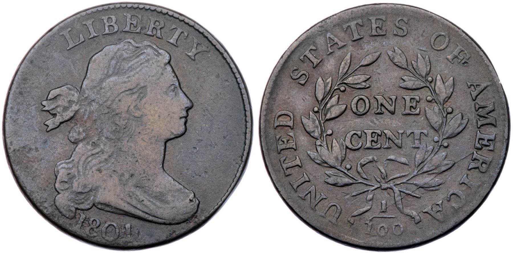 1801 S-215 R4+ VG8+Slightly sharper with minor roughness along the bottom of the obverse and at the ribbon knot into the hair. Otherwise the surfaces are smooth with trivial contact marks. Mostly glossy olive and steel brown with a hint of reddish brown under the ribbon knot. EDS, Breen state I, before the strong clashmarks at the date. Noyes graded VG10 net VG8 and tied for CC#16 but second finest of the early die state, his photo #25982. Comes with a nice provenance.Certificate Number: Pedigree: Ex Homer K. Downing, 1952 ANA Sale (New Netherlands Coin Co.), lot 1878-C. Douglas Smith 4/1980-Fred H. Borcherdt Collection