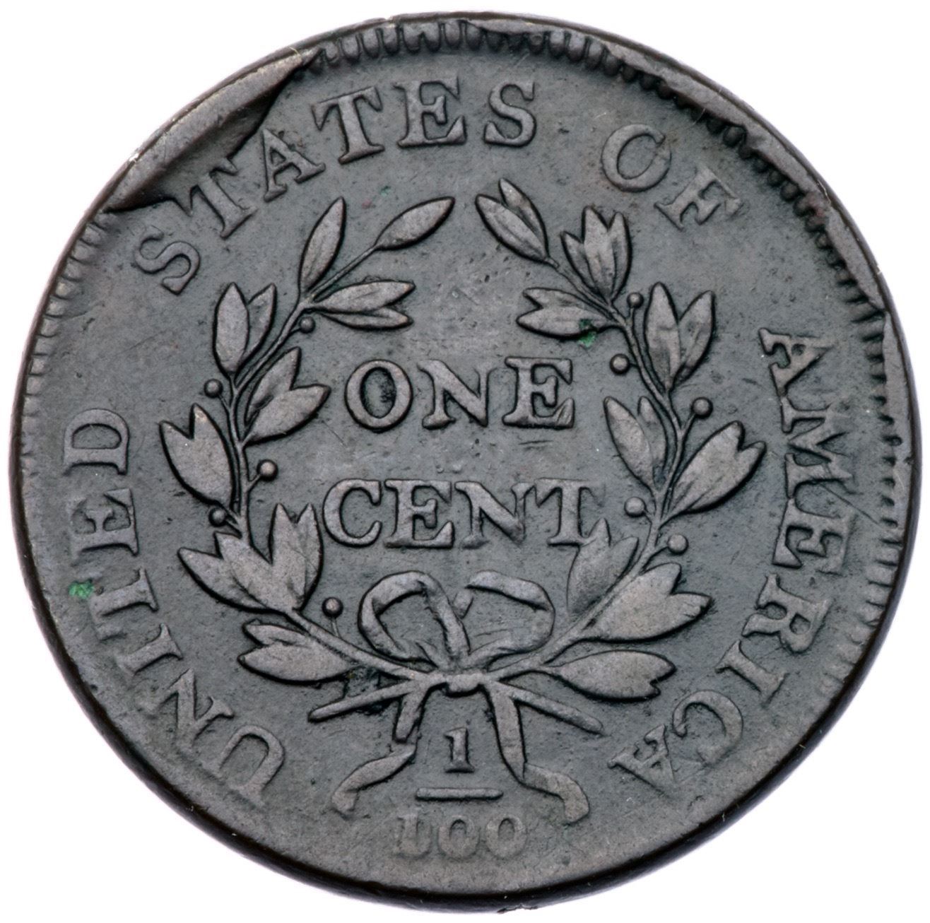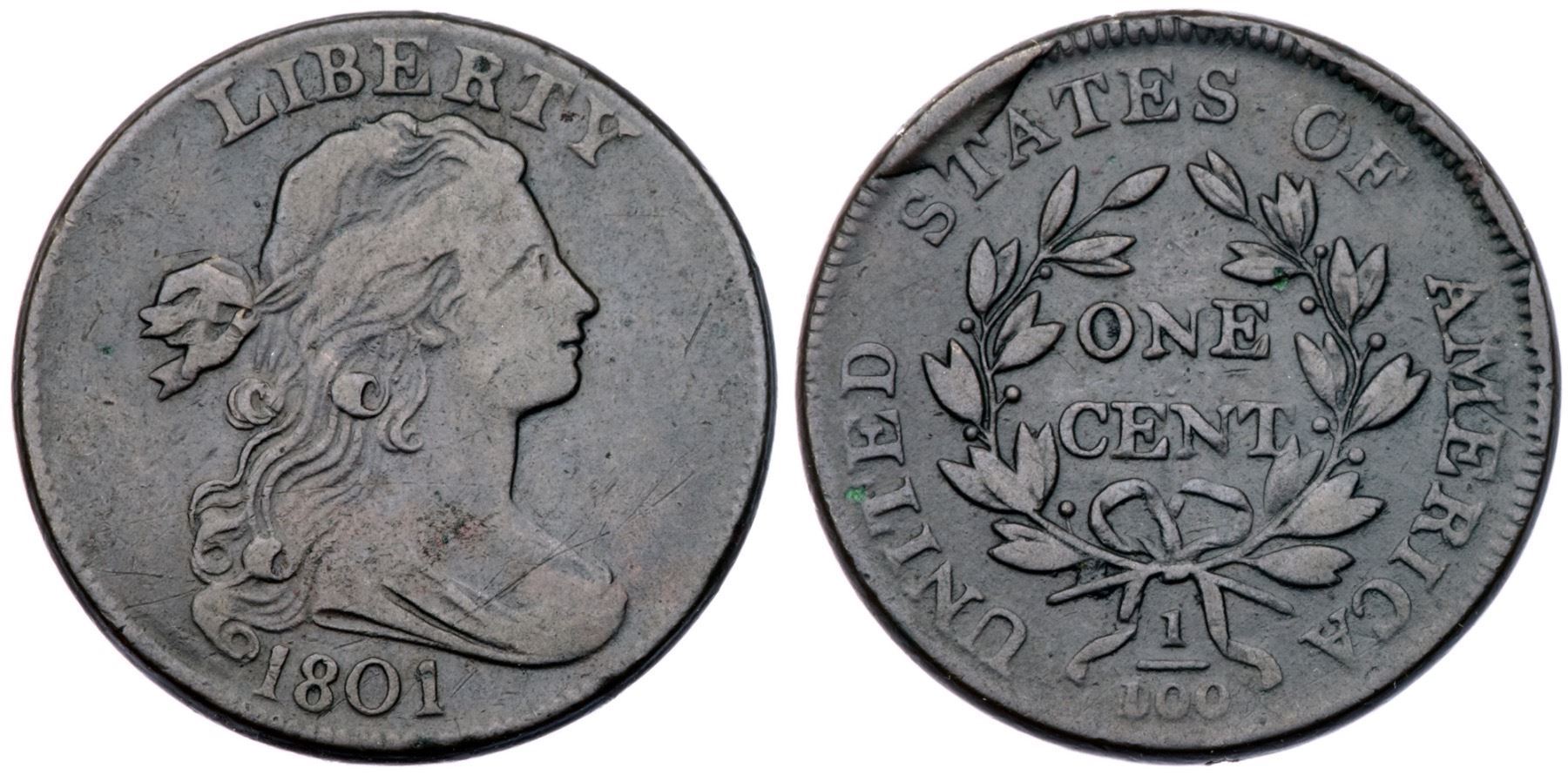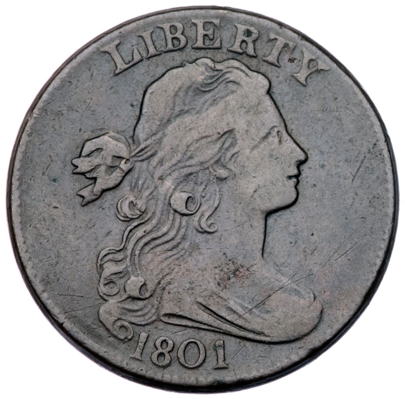 1801 S-221 R-2 Corrected Denominator 100/000 F15Slightly sharper but there is some microscopic roughness at the shoulder on an otherwise smooth, attractive cent. Glossy olive with lighter brown on the devices and a hint of reddish brown in the roughened area at the shoulder. Just a few contact marks including a light diagonal scratch from the bust into the field above and a long diagonal nick at the left corner of the eye. TDS, Breen state VI, with a strong cud break at TAT. Graded F15 net F12 and CC#3 of the TDS in the Noyes census, his photo #26150.Certificate Number: Pedigree: Ex; Robert Le Blanc (Le Blanc Numismatics) 6/1982-Fred H. Borcherdt Collection