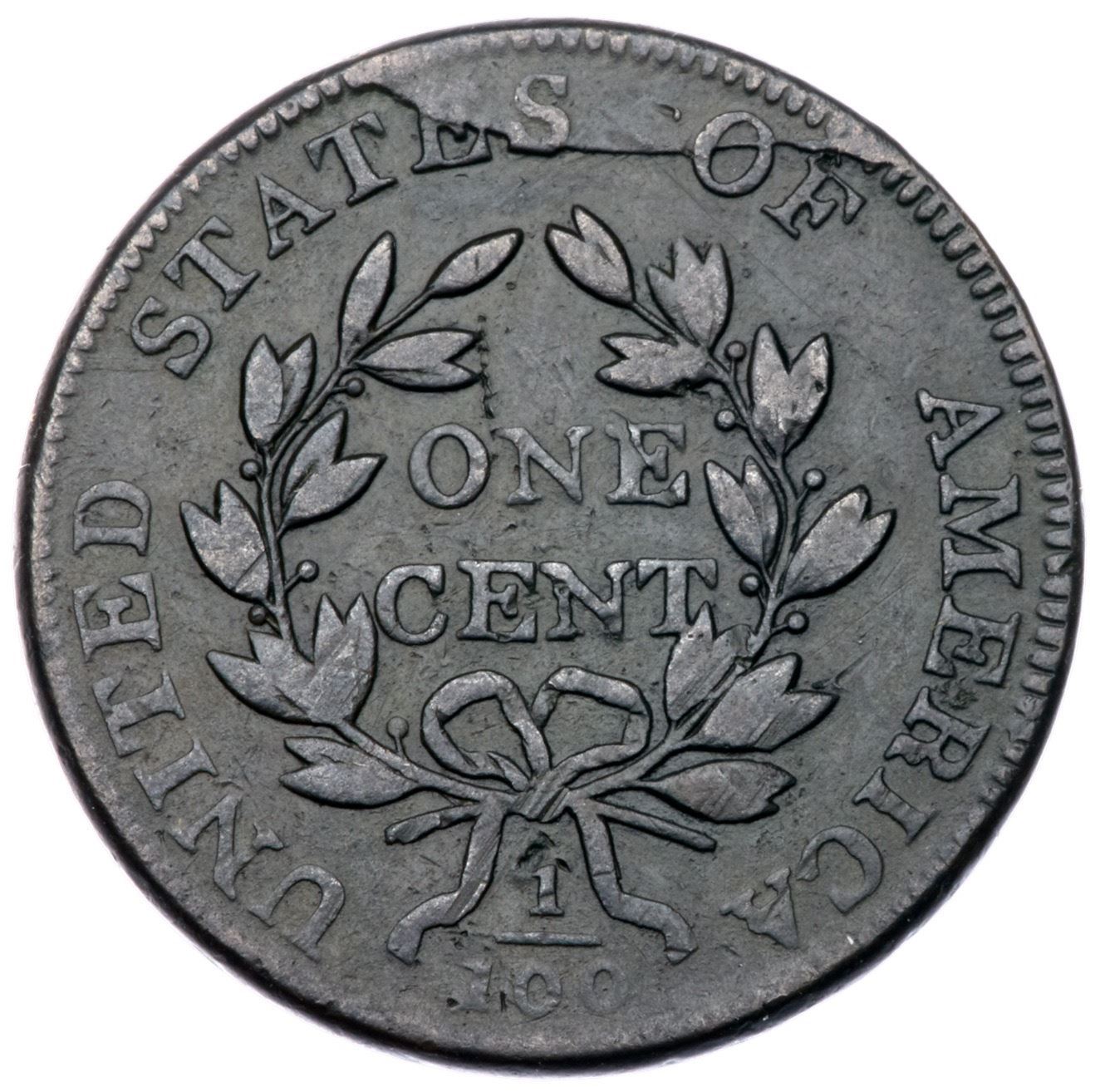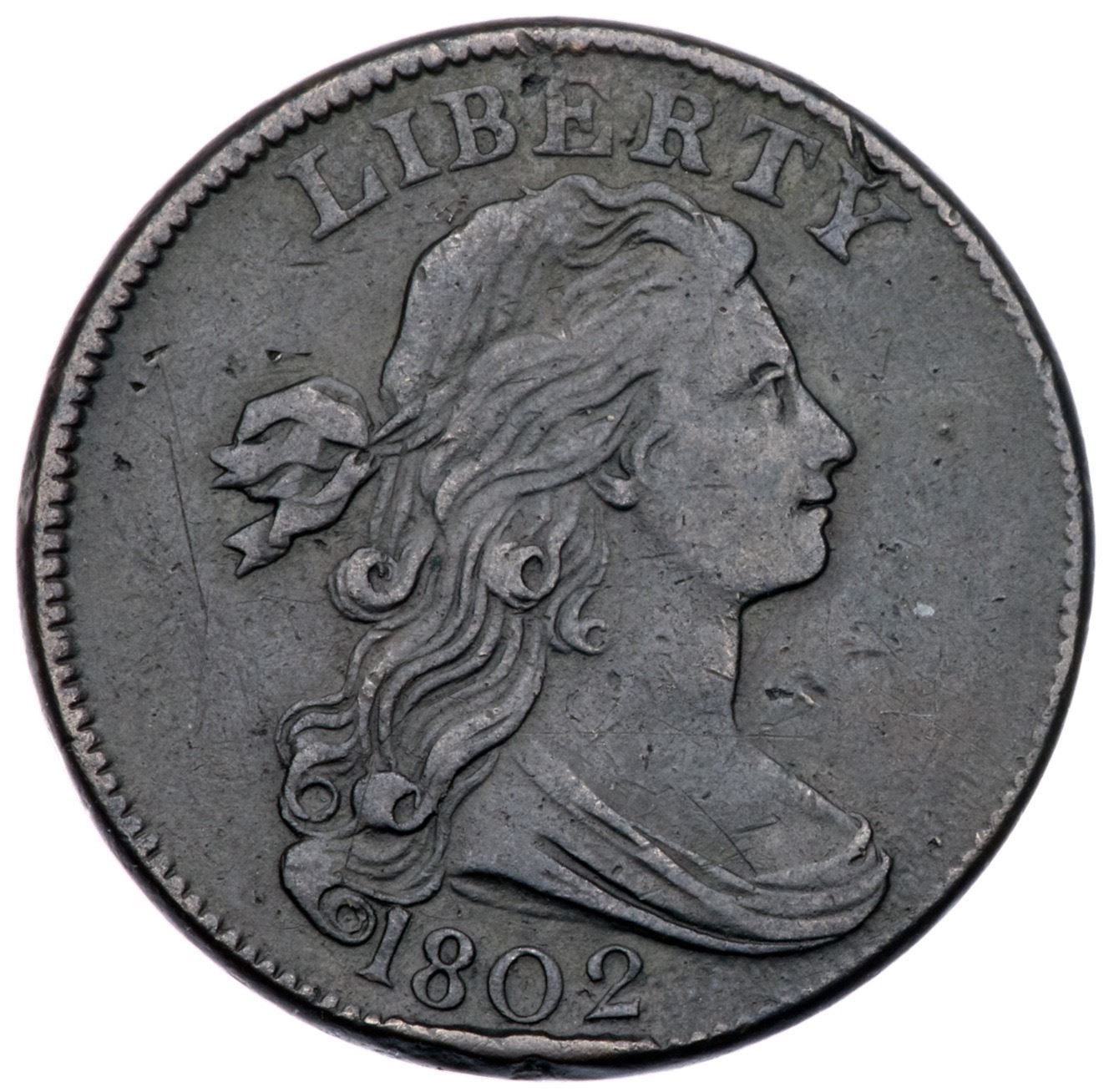 1802 S-225 R-3 VF25At least 5 points sharper with smooth surfaces that have a few contact marks. The notable marks are small digs over the E and Y in LIBERTY, a couple vertical hairline scratches in the field behind the portrait, a rough line of ticks at the leaf tips over the O in ONE, and a small dig at the top of the numerator. Mostly glossy medium olive brown and steel. Extremely rare LDS, Breen state VI, with a raised retained cud break at ES-O. Graded VF25 net F12 and finest of only two known in this die state in the Noyes census, his photo #23124. The other piece is a scudzy Basal State-1. An important cent for the collector of significant die states, and it comes with a great provenance.Certificate Number: Pedigree: Ex Henry C. Hines-Homer K. Downing, 1952 ANA Sale (New Netherlands Coin Co.), lot 1895-C. Douglas Smith-Dr. Robert A. Schuman, 2007 EAC Sale, McCawley & Grellman Auctions 4/28/2007:292 (as VF25)-Brett Dudek 1/18/2008-Fred H. Borcherdt Collection (EAC Sale lot ticket included)