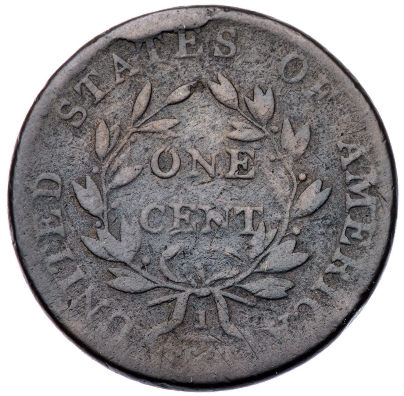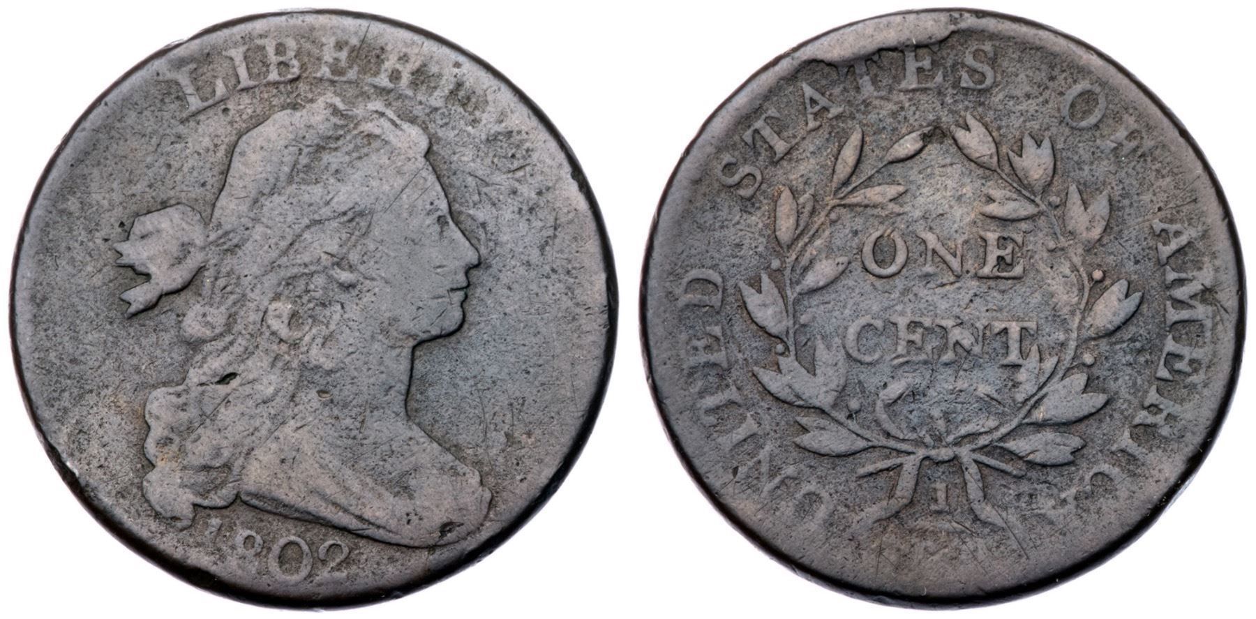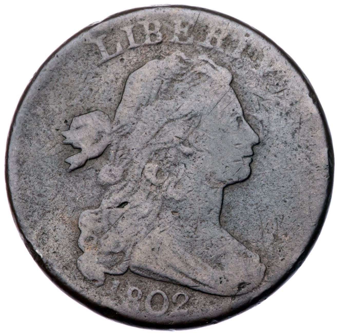 1802 S-229 R-2 G6A few points sharper but covered with light roughness, mostly in the fields and protected areas. No verdigris and the notable marks are a rim bruise left of the lower curls and a shallow pit between the upper leaves of the wreath. Partly glossy medium to dark steel. The date and legends are clear. M-LDS, Breen state VI, with a cud break connecting TE in STATES to the rim. Graded VG10 net G6 and finest of the die state in the Noyes census, his photo #38283.Certificate Number: Pedigree: Ex Thomas D. Reynolds-Fred H. Borcherdt Collection
