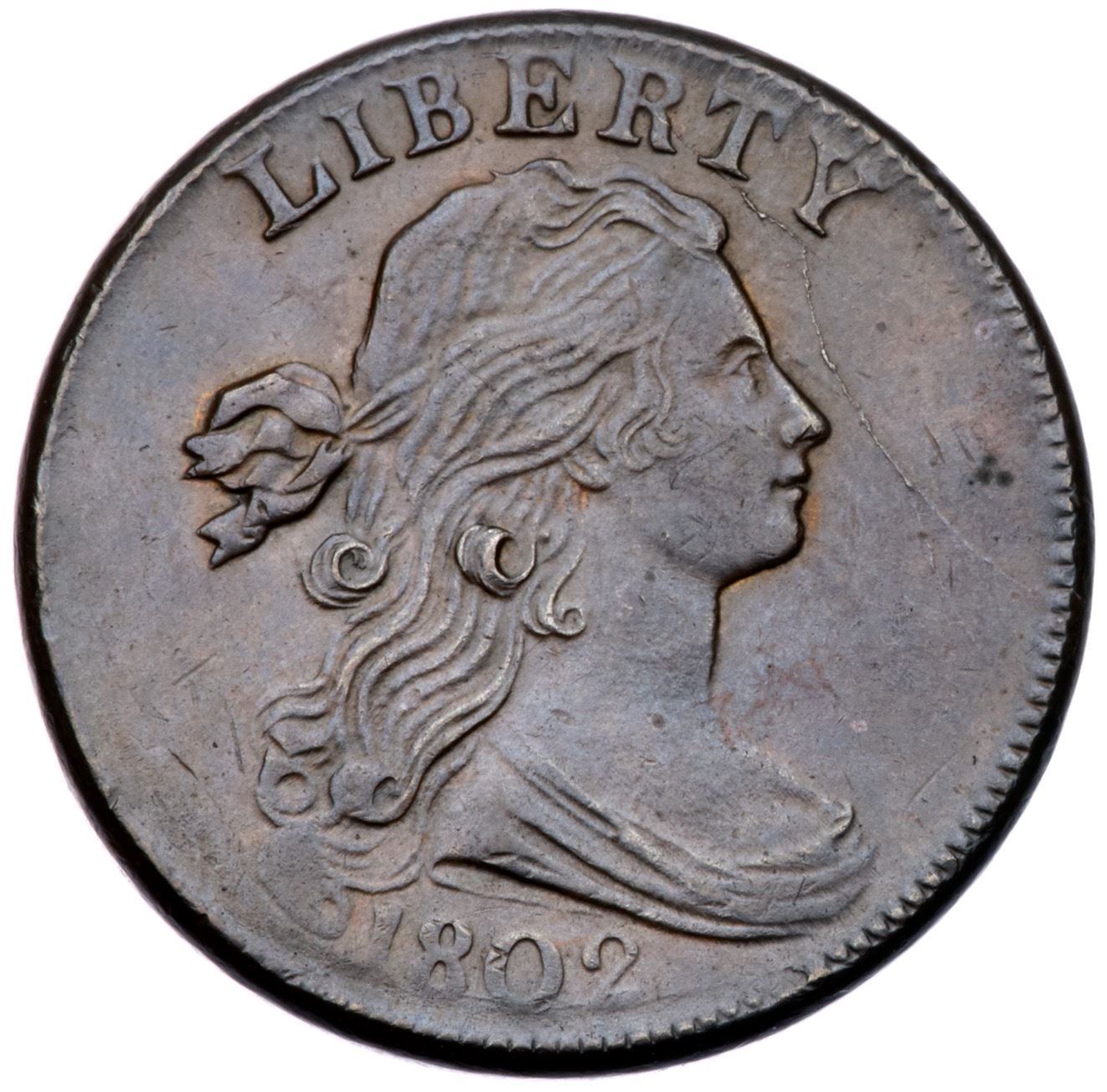 1802 S-231 R-1 Stemless Wreath EF45Glossy steel brown and chocolate with frosty lighter brown and tan in protected areas. Smooth surfaces with trivial marks including a few ticks left of the lower curls. Nicely struck except for the lowest curl and STATES, which are weak. LDS, Breen state VIII, with die cracks and clashmarks on both sides. Graded EF45 net VF35 and tied for CC#19 in the Noyes census, his photo #39045.Certificate Number: Pedigree: Ex ANS Museum Collection (as part of the legal settlement with Naftzger) 2001-R. E. "Ted" Naftzger, Jr. (via William C. Noyes)-Fred H. Borcherdt Collection