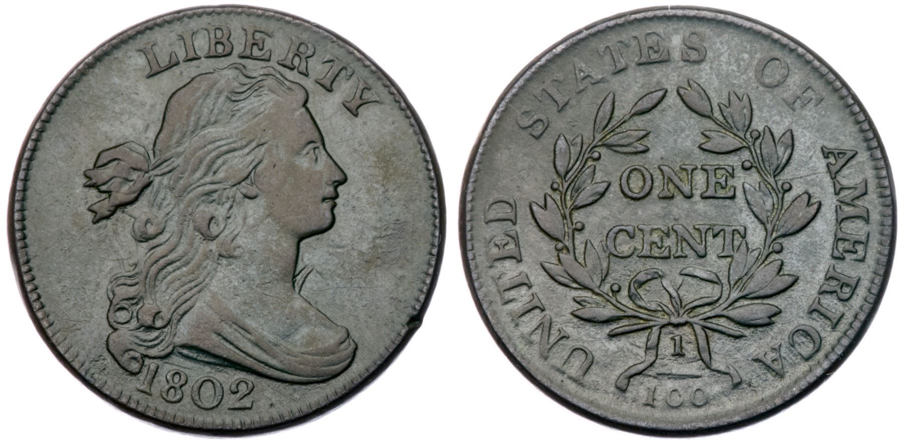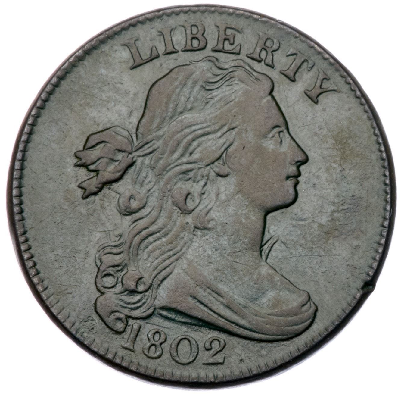 1802 S-240 R-3 VF20At least ten points sharper with microscopic roughness under mostly glossy dark olive brown toning. No marks but there are traces of verdigris in protected areas on the reverse. E-MDS, Breen state II, with die cracks on the reverse but no cracks on the obverse. Clear die clashmarks are visible on both sides. Graded VF30 and tied for CC#4 in the Bland census. Noyes says VF20 net VG10, his photo #26233.Certificate Number: Pedigree: Ex Dr. Lawrence A. Matternes, Lester Merkin 10/31/1973:327-C. Douglas Smith 10/1981-Fred H. Borcherdt Collection
