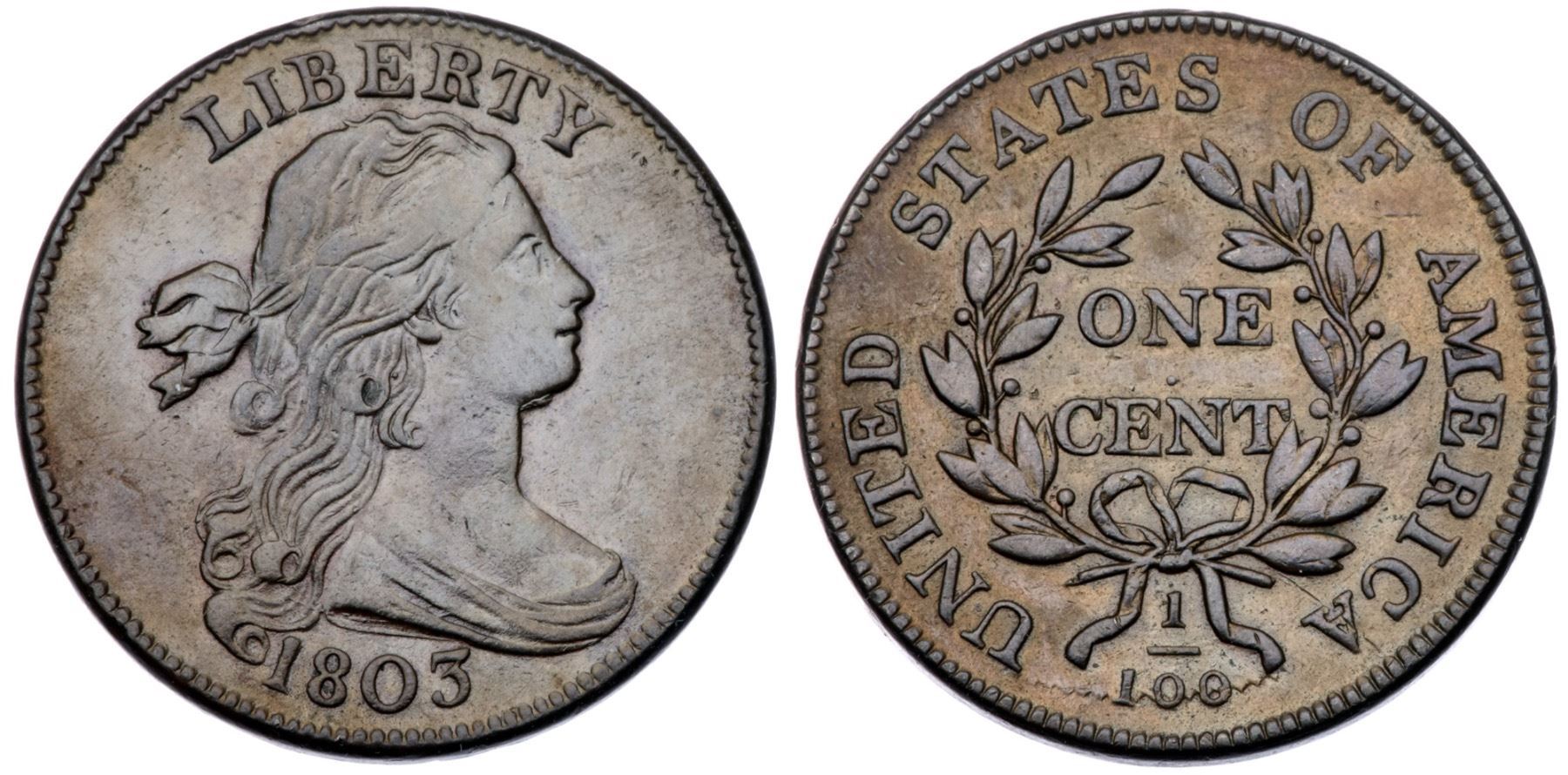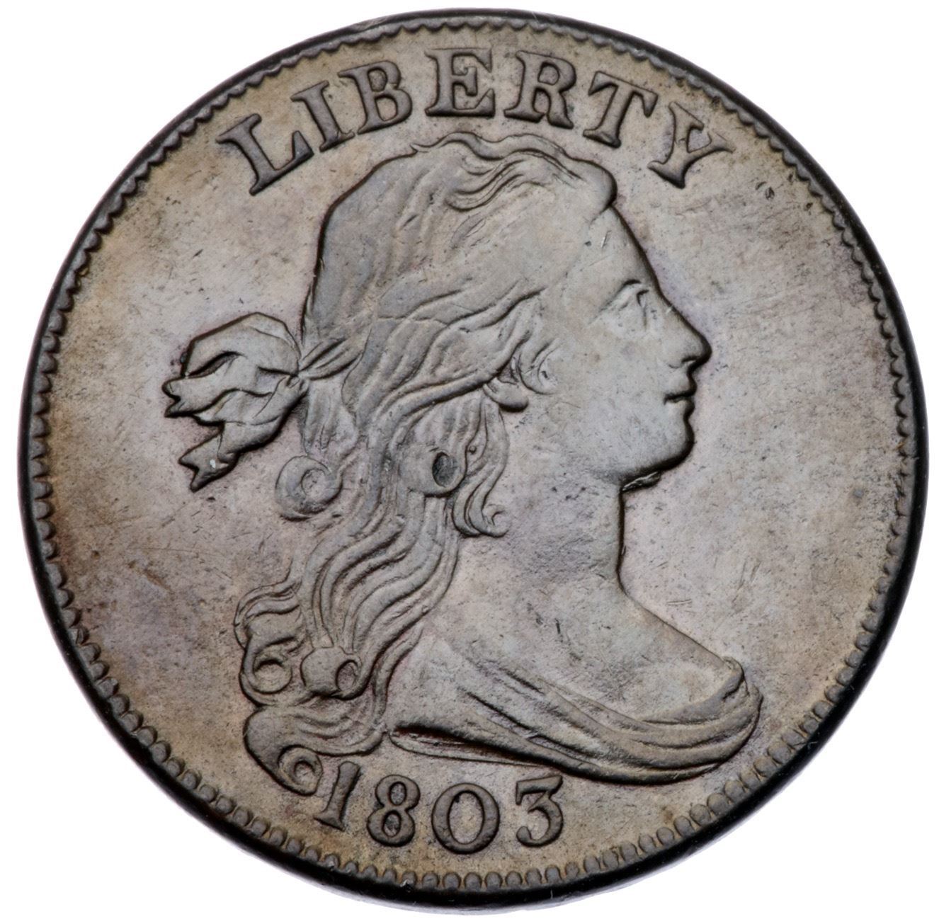 1803 S-247 R-3 VF25At least ten points sharper but there are faint hairline scratches in the fields on the obverse and traces of extremely fine roughness in the field before the face. Glossy medium brown and light chocolate with small splashes of reddish brown toning on the lower half of the obverse. E-MDS, Breen state I, with clashmarks but no cracks. Graded VF30 net VF20 and tied for CC#29 in the Noyes census, his photo #26021.Certificate Number: Pedigree: Ex Denis W. Loring 11/1983-Fred H. Borcherdt Collection