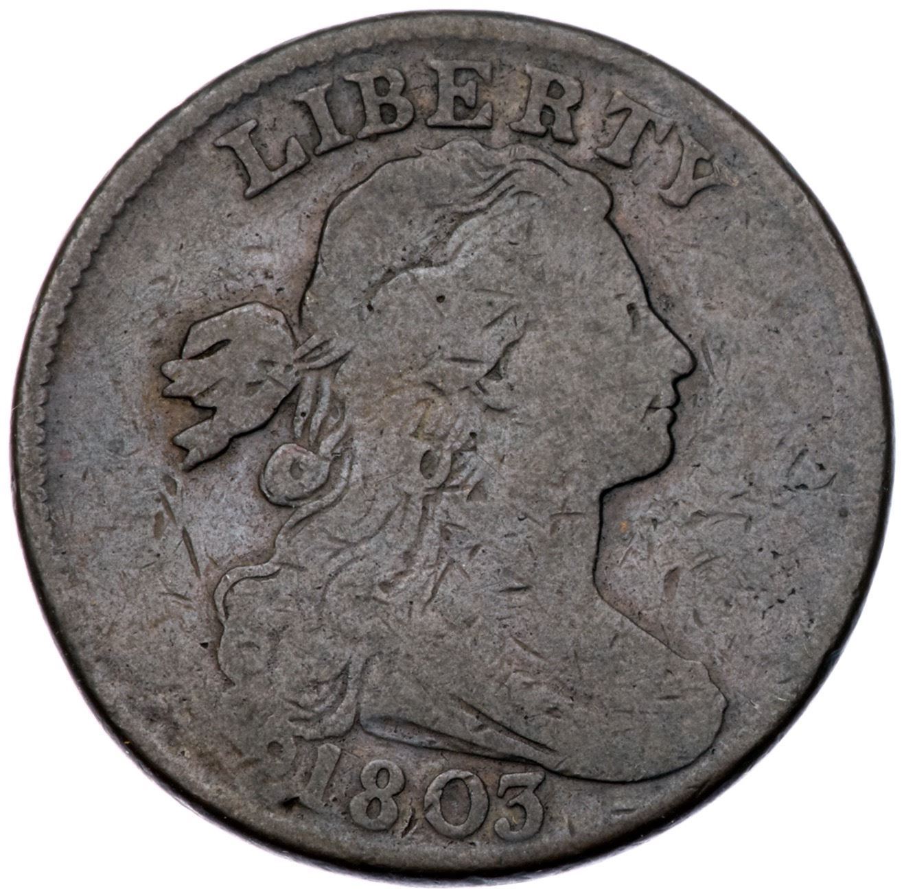 1803 S-255 R-1 VG7Slightly sharper with smooth, attractive surfaces for the grade, but there are some contact marks including a significant nick under the first A in AMERICA. Glossy uniform light olive. LDS, Breen state IV early, with an incomplete cud break over STA. This is the only example seen with an incomplete cud. It may be partial due to an incomplete planchet, or it may be an intermediate die state. Regardless this is the only example known to us. Graded VG8 net VG7 by Noyes, his photo #34201.Certificate Number: Pedigree: Ex William "Billy" Paul (American Heritage Minting) as a gift-Fred H. Borcherdt Collection