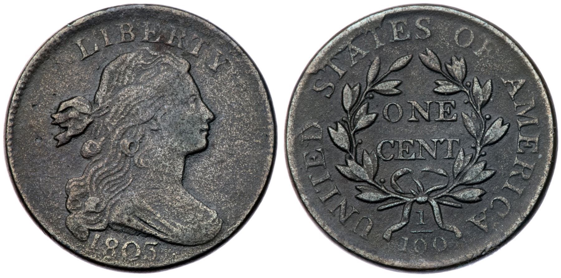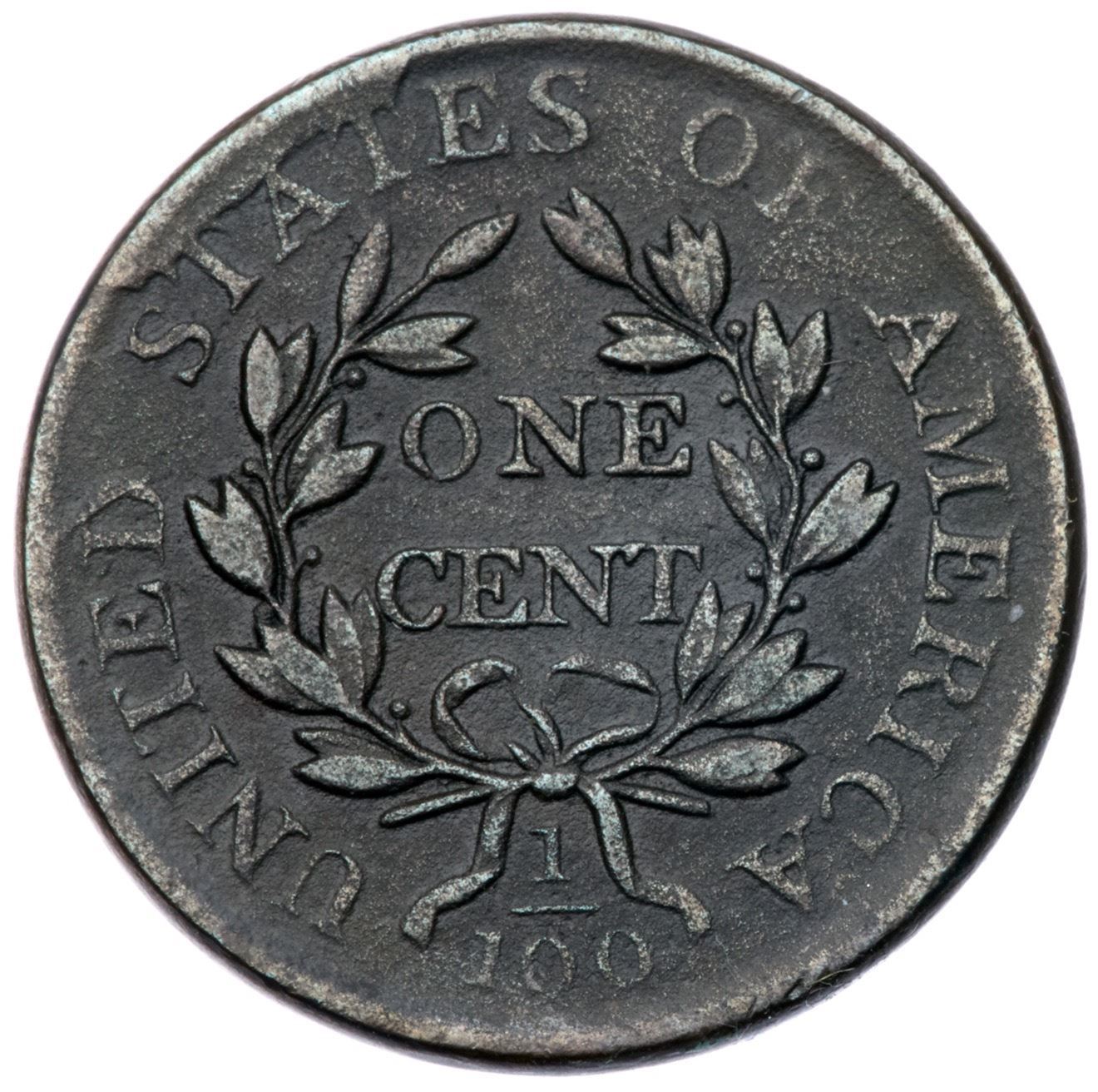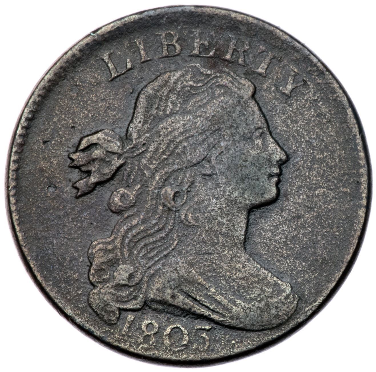 1803 S-259 R-4 Large Fraction VG8Sharpness near VF20 but covered with uniform moderate granularity. No verdigris and only trivial marks including two tiny planchet flakes off the ends of the hair ribbon. Slightly glossy olive brown and steel. LDS, Breen state IV early, with a retained cud break over STAT that connects TAT to the rim. We know of two with a partially raised retained cud and three with the full cud break. Noyes graded F15 net VG8, his photo #39498.Certificate Number: Pedigree: Ex Thomas D. Reynolds-Fred H. Borcherdt Collection (includes the Reynolds sales envelope)