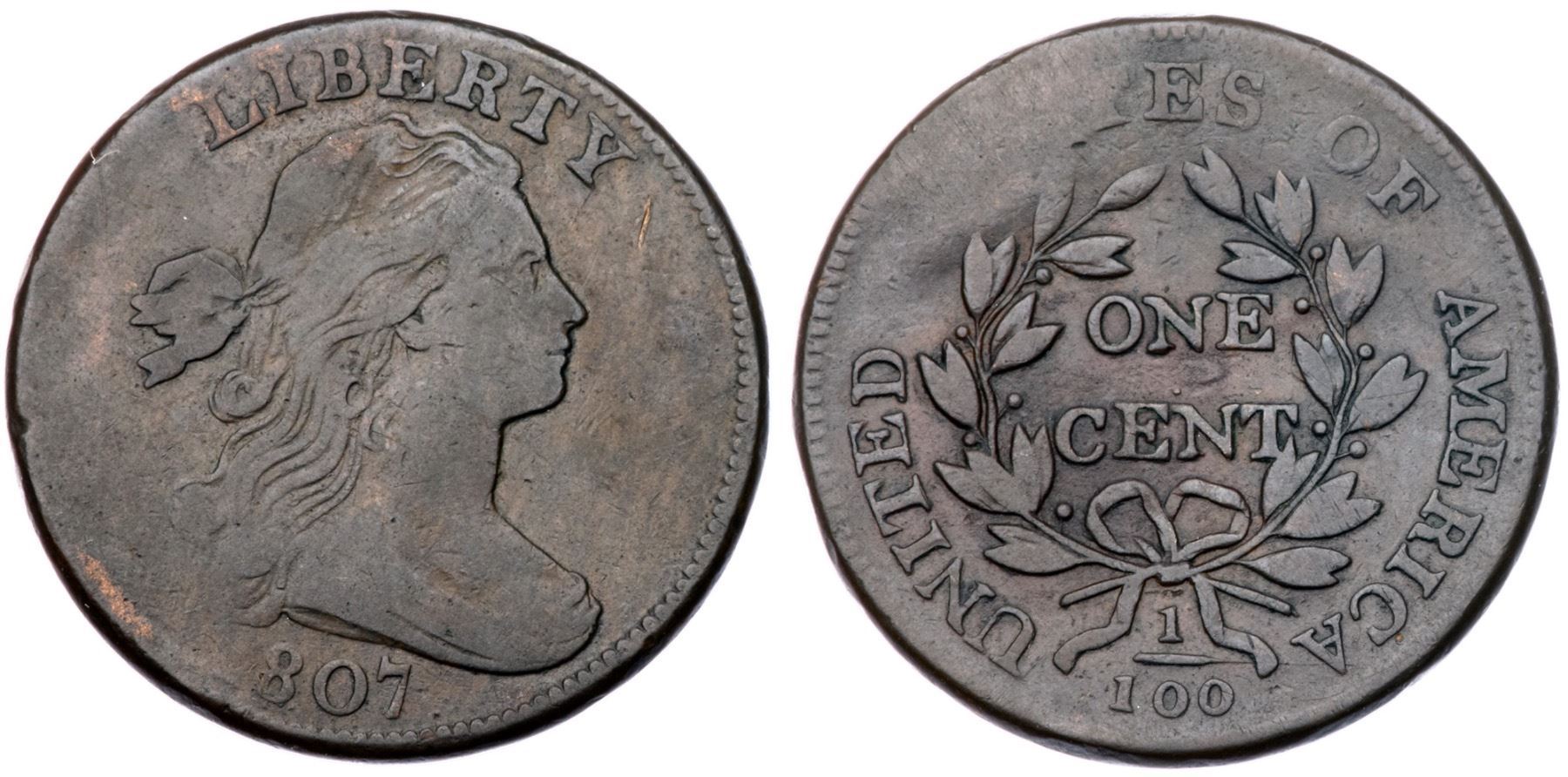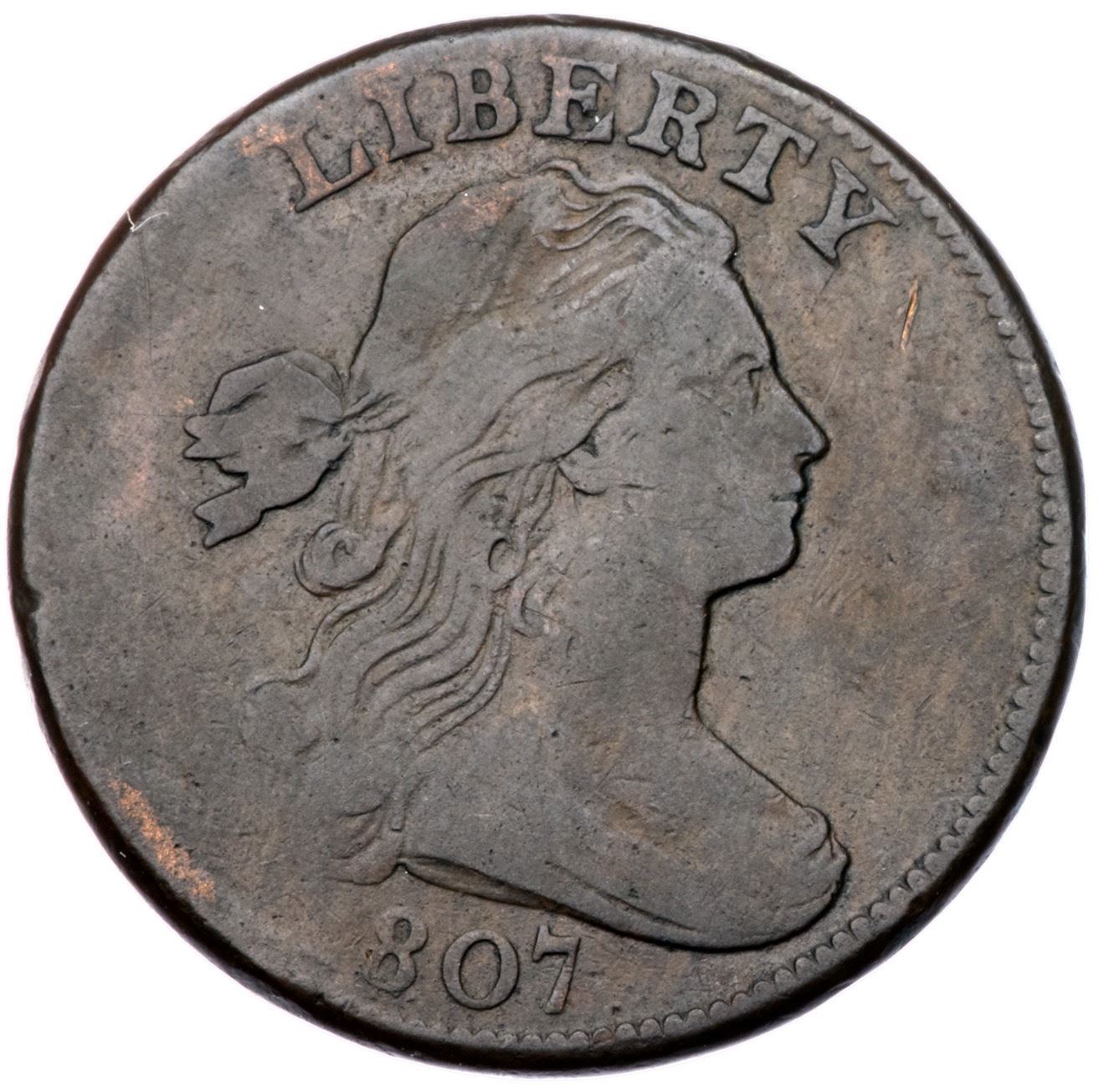 1807 S-274 R2 Small Fraction VG8A couple points sharper with some very fine roughness inside the wreath; otherwise the surfaces are smooth. The only notable marks are a minor rim bruise off the upper end of the hair ribbon and another left of the fraction. Glossy chocolate and steel with reddish brown in the roughened area inside the wreath. LDS, Breen state IV, with heavy swelling that obliterates STA and causes softness on the opposing lower curls.Certificate Number: Pedigree: Ex 1986 EAC Sale, lot 152-Jack H. Robinson, Superior 1/29/1989:613-Richard V. Punchard-Fred H. Borcherdt Collection (includes the Punchard collection envelope)