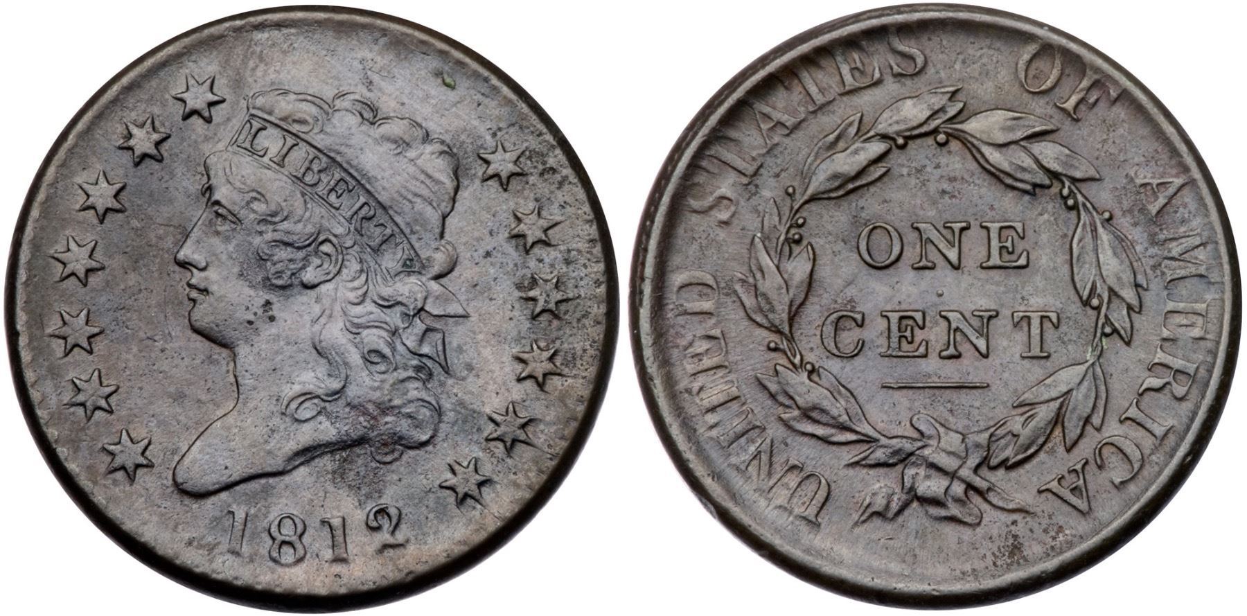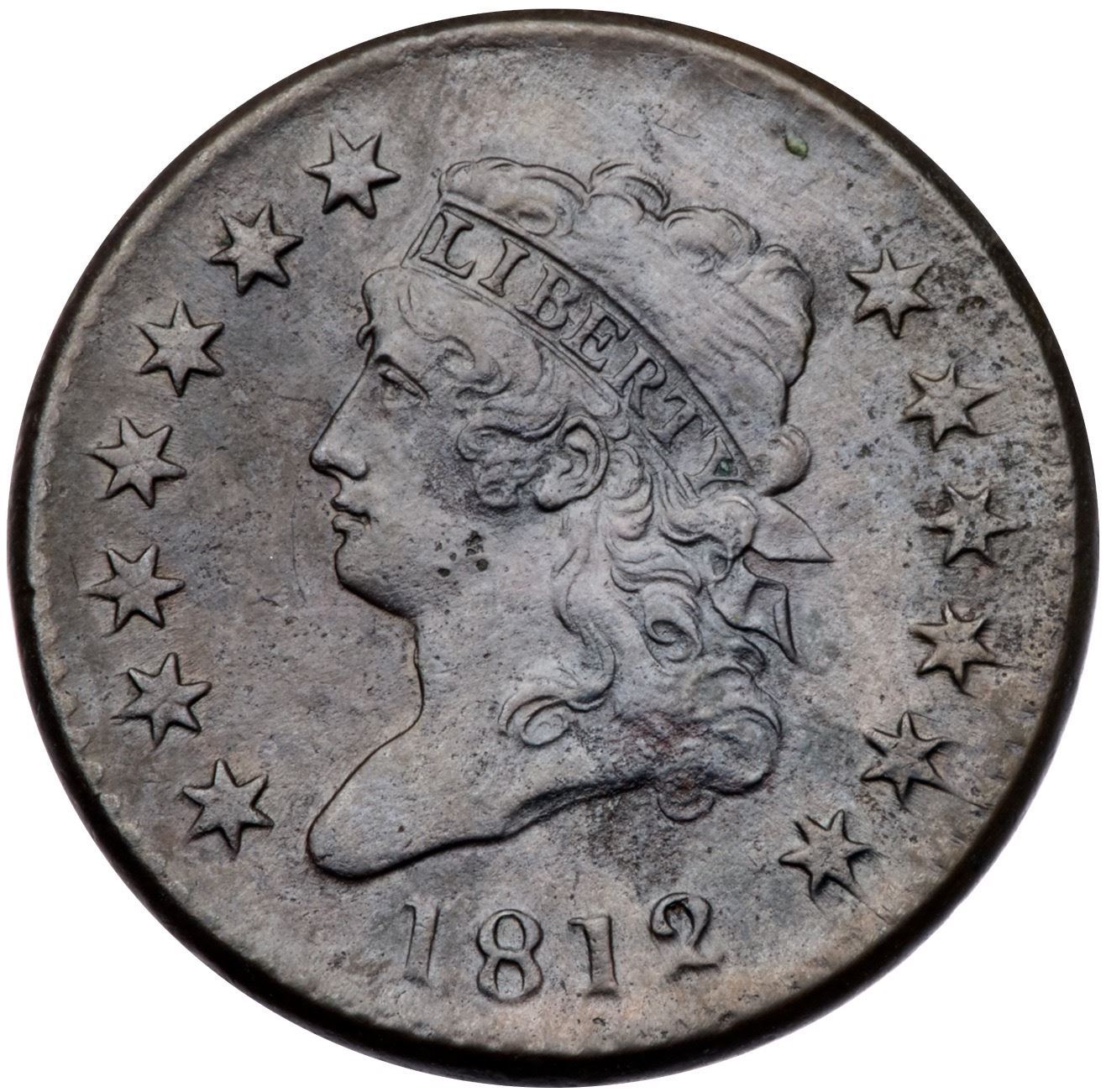 1812 S-289 R1 Large Date VF20+Sharpness EF45 but covered with fine roughness with moderate roughness at the truncation over the 12. Slightly glossy mix of olive and steel brown. There is a tiny speck of verdigris near the dentils above the back of the head, a pair of fine scratches before the mouth, and three tiny ticks under the earlobe. LDS, Breen state IV, with flowlined fields and a narrow rim cud at ED in UNITED.Certificate Number: Pedigree: From the Fred H. Borcherdt Collection