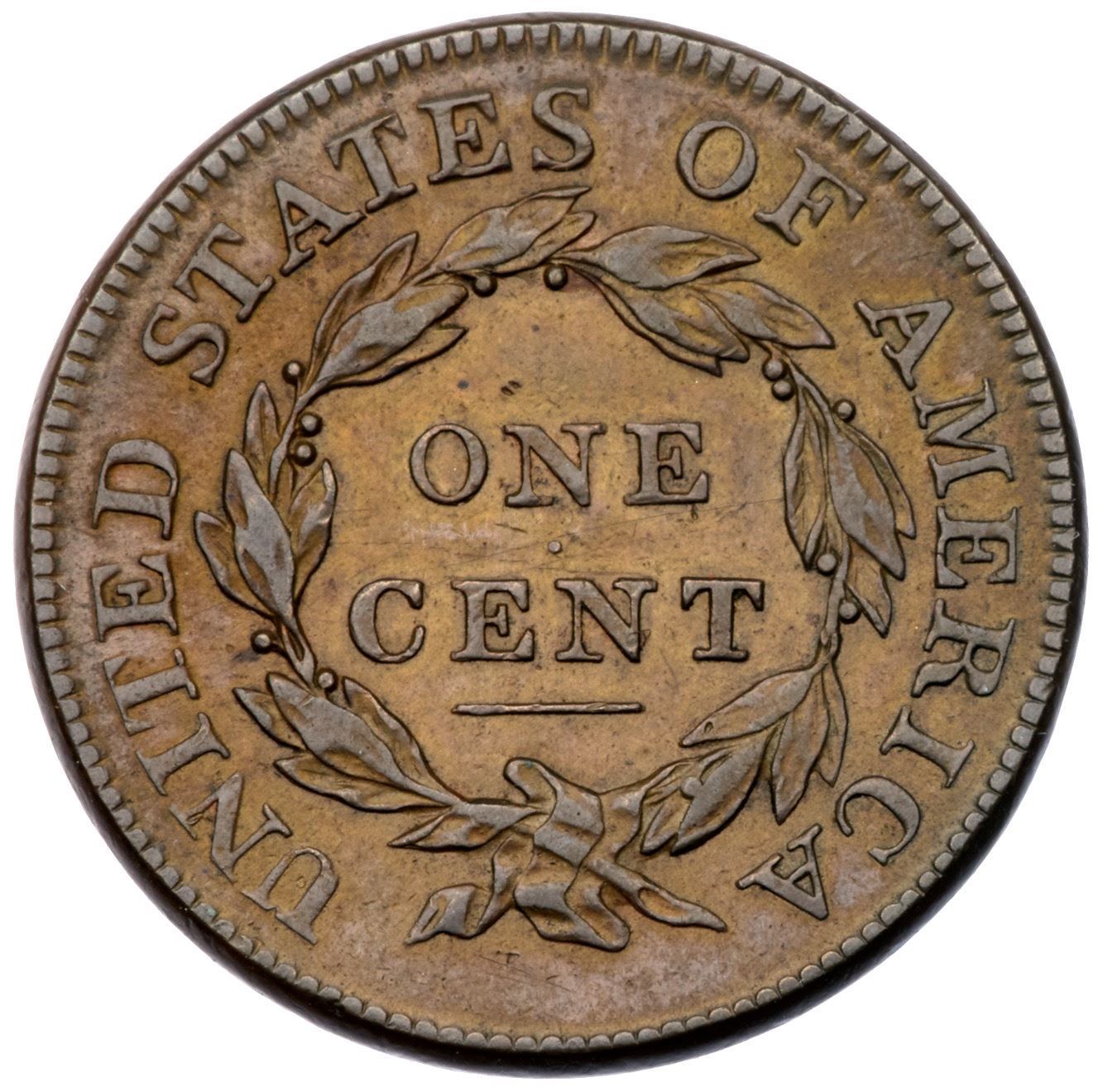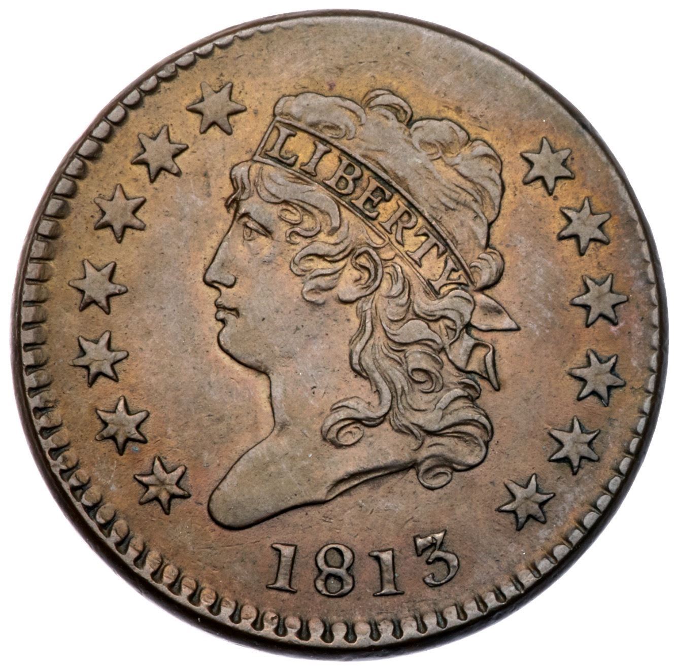 1813 S-292 R2 VF35Slightly sharper with great eye appeal, but there are three very light scratches over CENT. Otherwise this cent is choice with very attractive glossy light chocolate and golden tan toning. MDS, Breen state III, with crisp dentils and faint die clashmarks, strongest at the berry above the N in ONE. Struck with the obverse die slightly misaligned to K-1.Certificate Number: Pedigree: Ex Dean Johnson 6/1979-Fred H. Borcherdt Collection