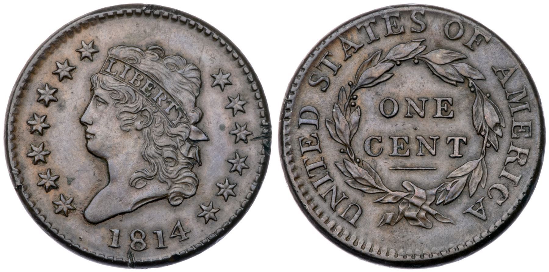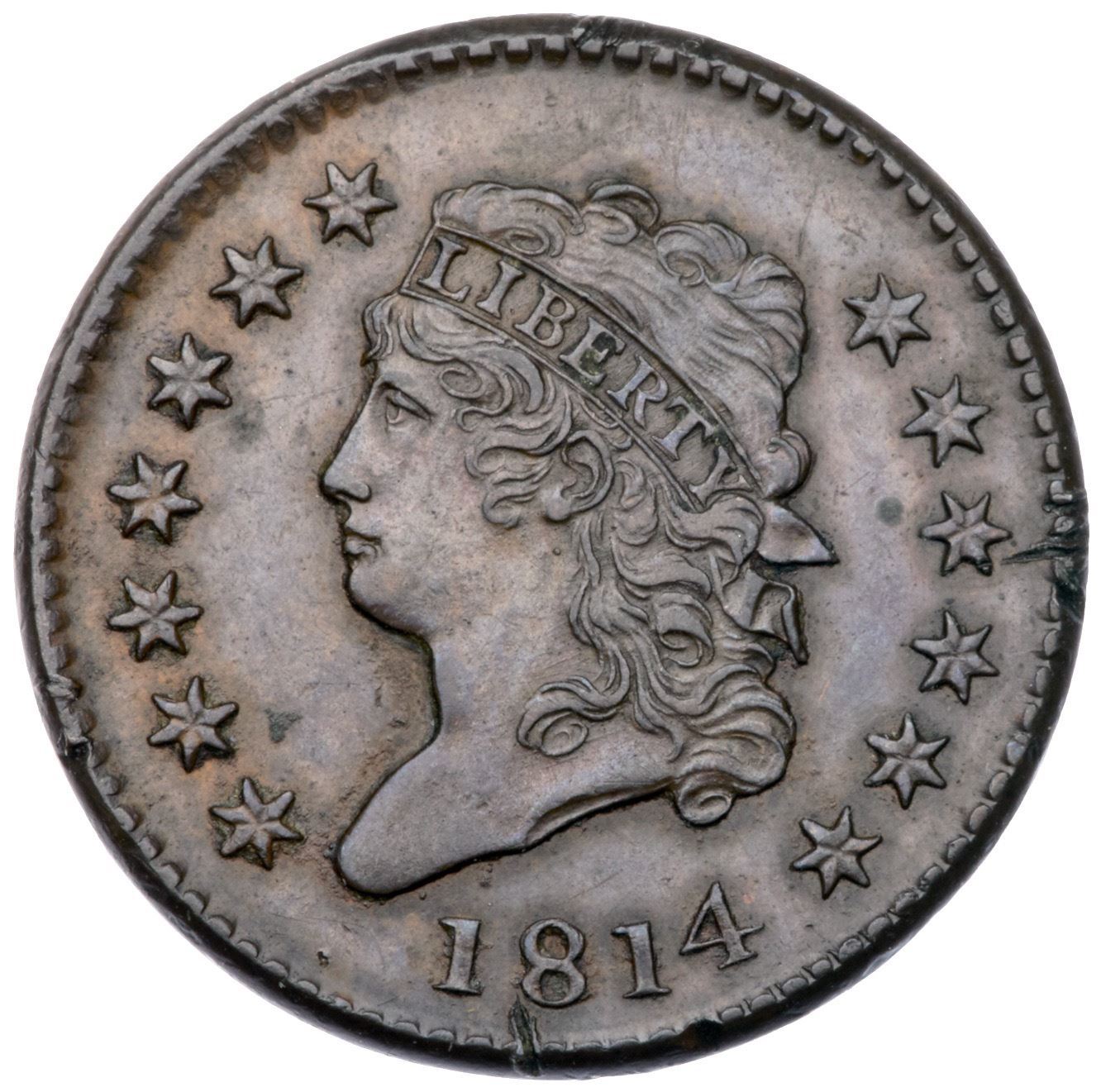 1814 S-295 R1 Plain 4 VF35Ten points sharper with three small cuts on the rim: one at star 10, another below the 8, and a tiny one at star 2. Glossy brown and light chocolate with frost in protected areas, but there is crud nestled up against most of the portrait and around the date. The obverse fields are quite smooth, almost reflective, thanks to a fresh die polishing. E-MDS, Breen state IV early. The die crack from star 11 through the curl is very light.Certificate Number: Pedigree: Ex Fred H. Clymer-Fred H. Borcherdt Collection