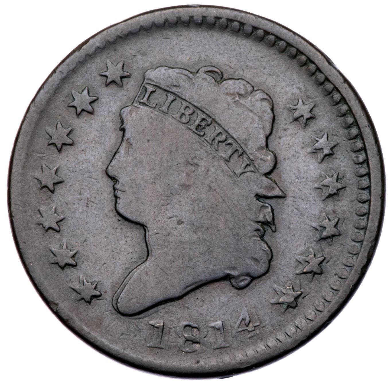 1814 S-295 R1 Plain 4 G6Glossy chocolate brown and olive with some lighter brown in protected areas on the reverse. E-MDS with a die crack through the lowest curl but no crumbling at the throat. This cent was struck two times. The first strike was normal and the second was against the obverse die on the obverse and a new blank planchet on the reverse thereby creating a reverse brockage. The doubling on the obverse is especially obvious on the date, bust, and neck with an offset of slightly less than a millimeter. The reverse is blunted and swollen, a characteristic of having been struck against a blank planchet.Certificate Number: Pedigree: Ex Stack's 9/29/1977-Richard V. Punchard-Fred H. Borcherdt Collection (includes the Punchard collection envelope)