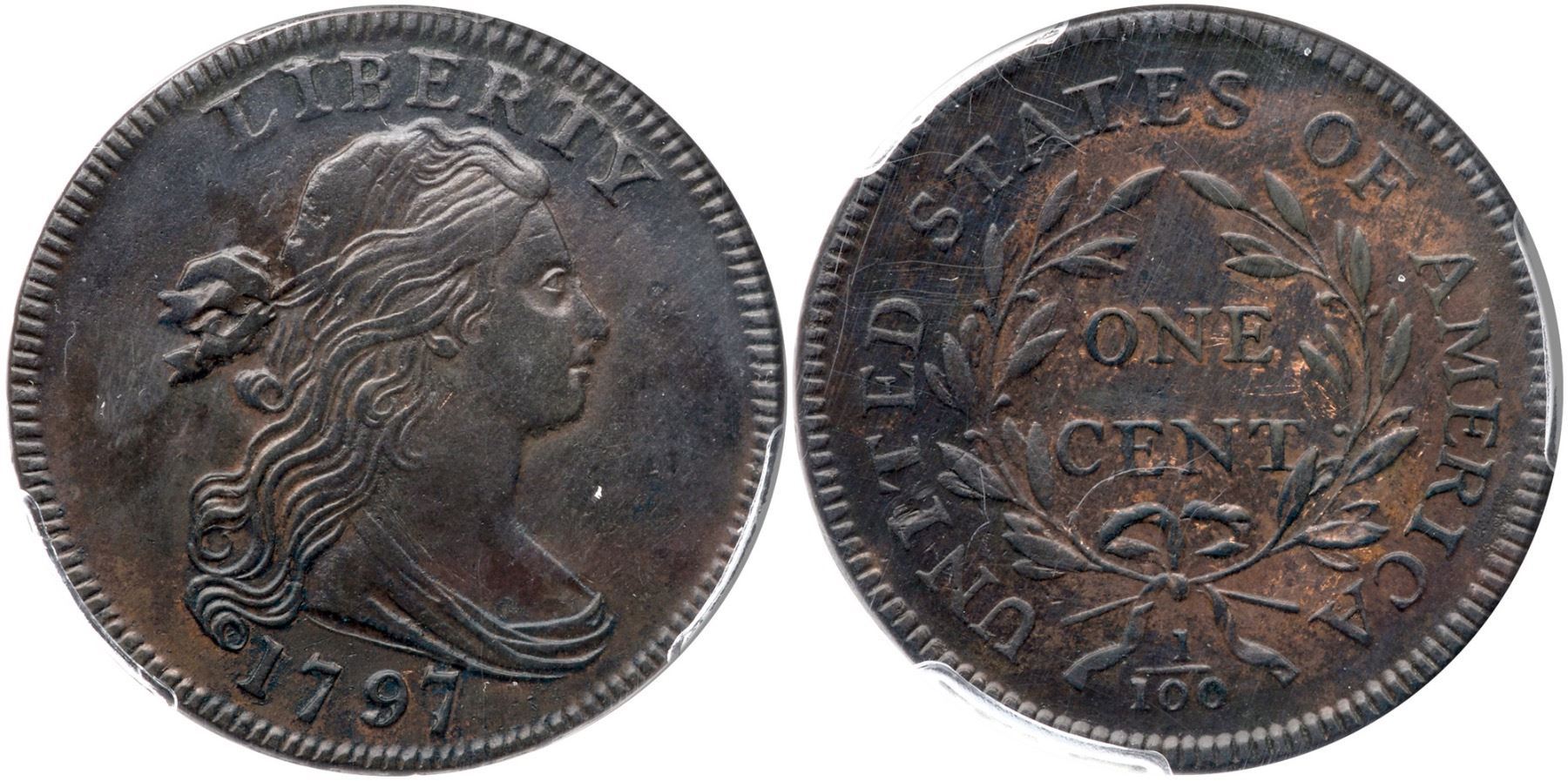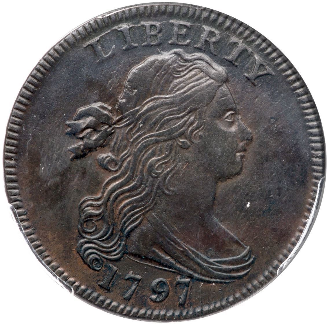 1797 S-120b R-2 Gripped Edge PCGS XF Details (Repaired)XF45 sharpness but cleaned and retoned dark steel brown with traces of underlying tan and orange. The notable marks include a nick on I in UNITED, and wispy pin scratches on the neck. Reverse of 1796, Gripped Edge. MDS, die state b. Our grade is VF35.Certificate Number: 35900.98/44279263Pedigree: Ex; Tom Morley 1980 - Louis Ullian - Grove Hoard S&C as AU55 - Superior 6/2000:141 - Col Ellsworth Collection