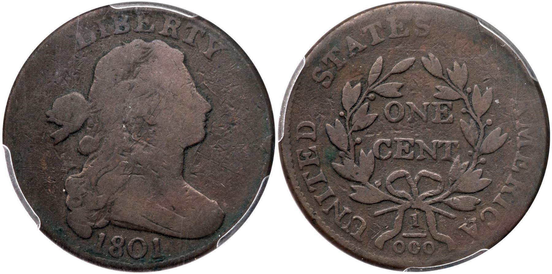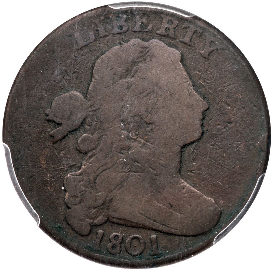 1801 NC-3 R-6+ 1/000 PCGS G Details (Graffiti)VG sharpness but there are hairline scratches on the ear, before the chin, and behind the lower hair that earned the Graffiti distinction by PCGS. Semi-glossy medium to dark chocolate browns. Weaker at OF, otherwise bold date and legends, clear 1/000 fraction error. Our grade is G6.Certificate Number: 36281.98/49047556Pedigree: Ex; Kevin Skeith 5/2022 - Col Ellsworth Collection
