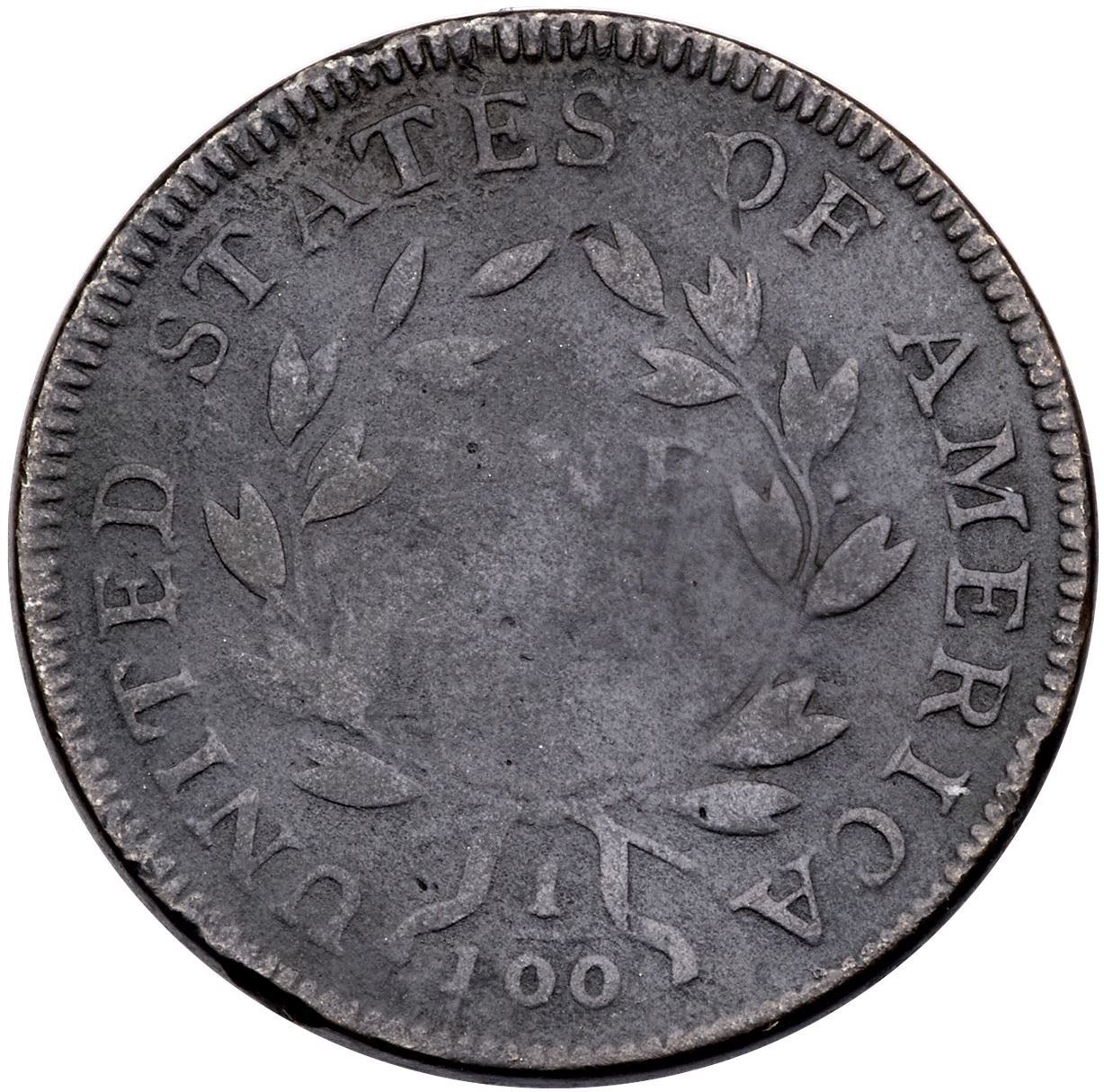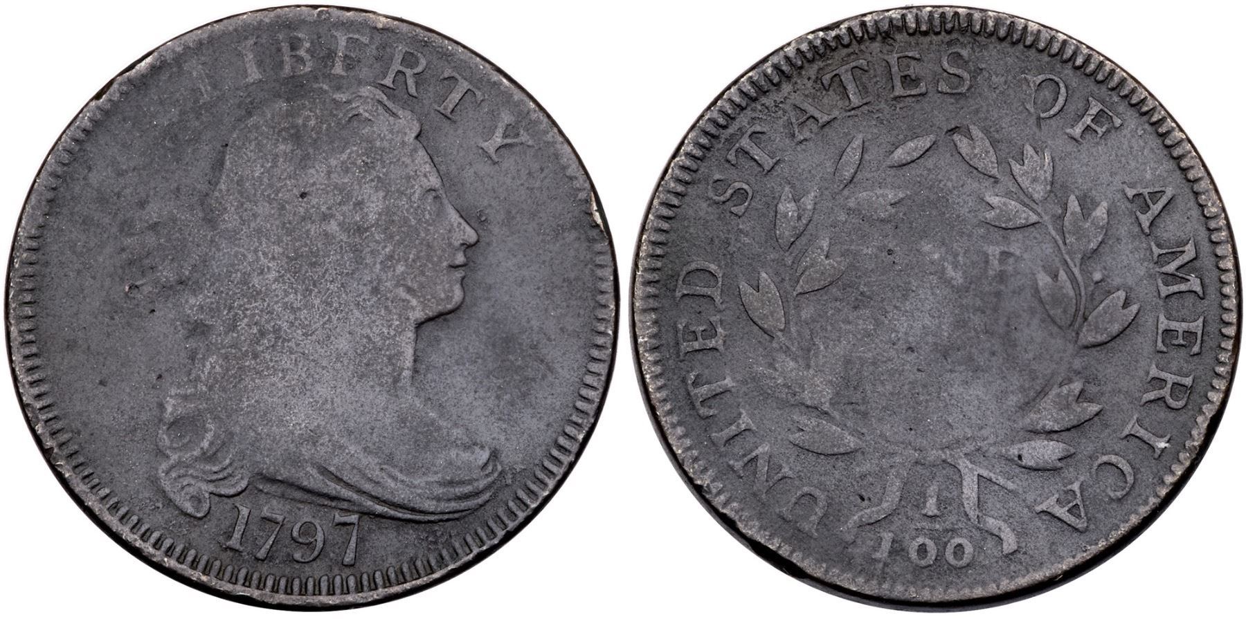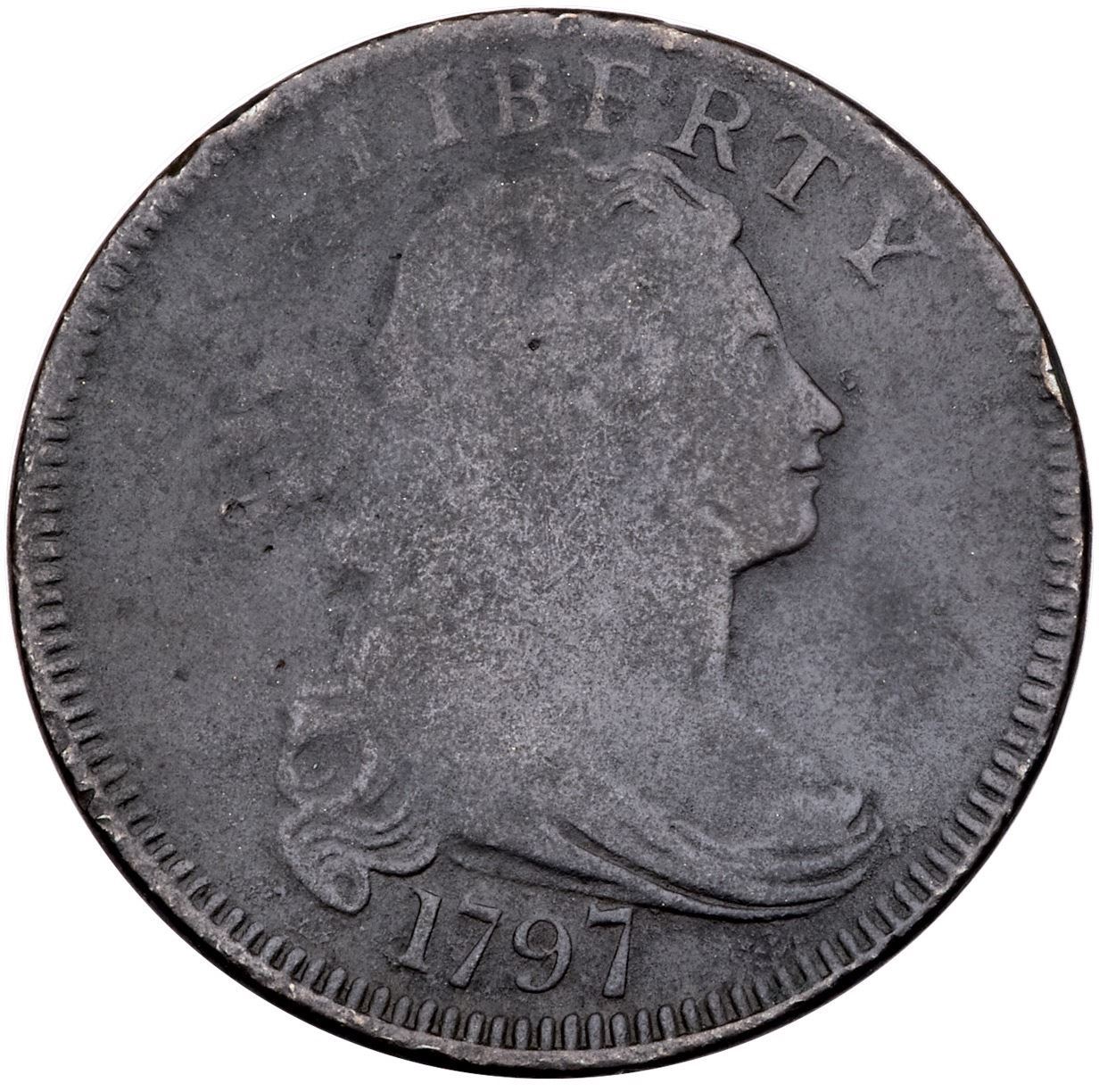 1797 NC-3 R-6- G6Slightly sharper with extremely fine roughness under a rather glossy dark olive patina. The highpoints are a slightly lighter shade of steel and chocolate brown. No verdigris and only a few trivial marks including a vertical nick from the O in OF down into the leaf below that blends in well to the natural patina. The date and legends are strong except for weakness inside the wreath. It appears the center of the reverse failed to strike up die to debris on the die while everything else was fully struck. EDS, Breen state I, before the reverse die cracked. Broken out of an ANACS G6 holder (2492000).Certificate Number: Pedigree: Ex; Goldbergs 9/2011:822 - CVM - Kevin Vinton