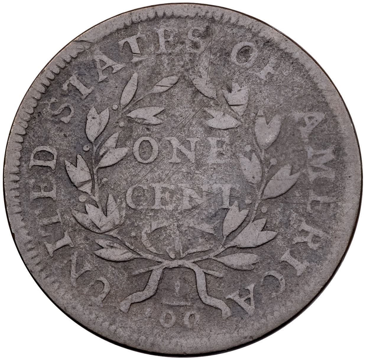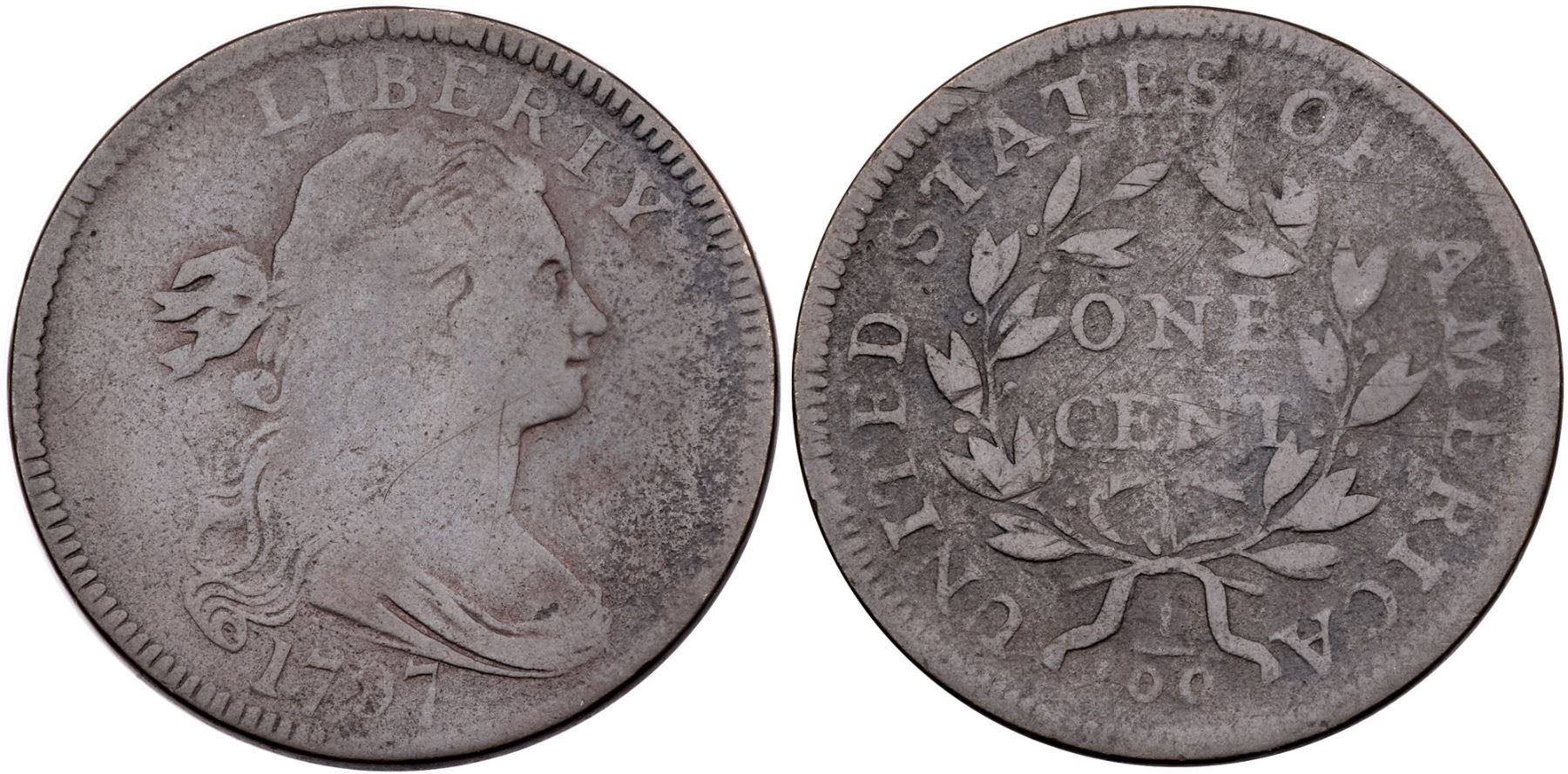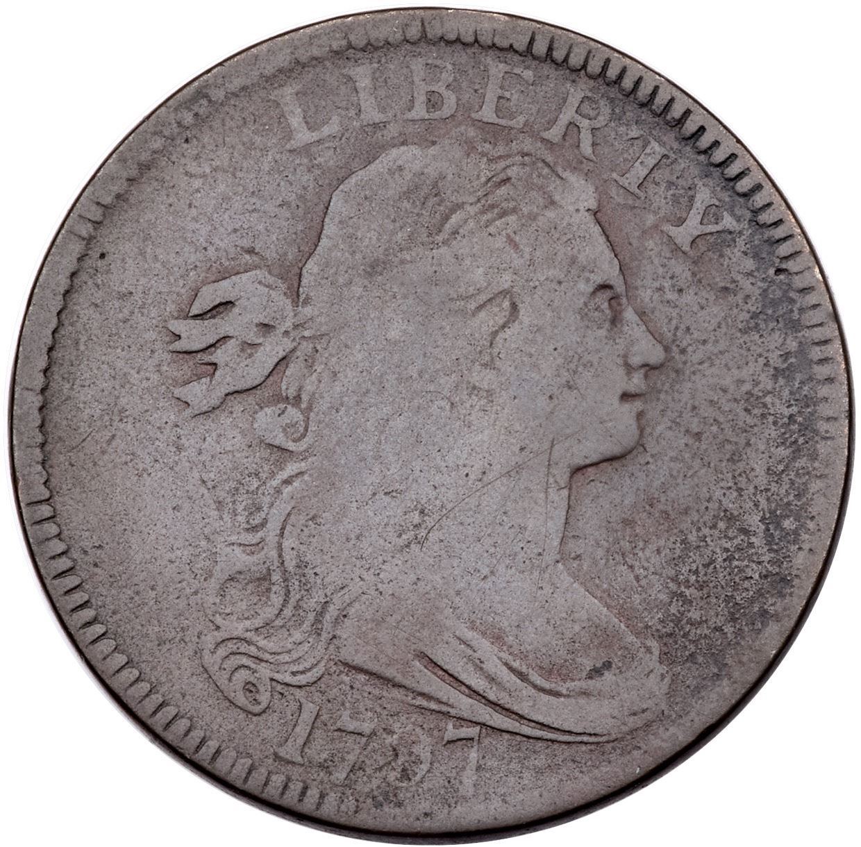 1797 NC-5 R-6 G6A couple points sharper but the fields are covered with very fine roughness underneath a rather glossy light olive and steel brown patina with traces of darker olive and reddish brown toning in some protected areas. No verdigris, and the only notable marks are an old scuff at AT in STATES and a couple nicks in the write below ITE in UNITED. EDS, Breen state I. Called G6 and TCC#12 in the Bland census. Noyes says G6 net G4 and TCC#15, his photo #26633. Removed from an NCS VG Details slab with the Reiver provenance noted.Certificate Number: Pedigree: Ex; Robert C. Sheffer (Glenville coin) 2/1984 - James E. Long 3/7/1984 - Jules Reiver HA 1/24/2006:19353 - Chris McCawley 5/2006 - Dan Holmes M&G/Goldberg 9/2009:258 - Kevin Vinton