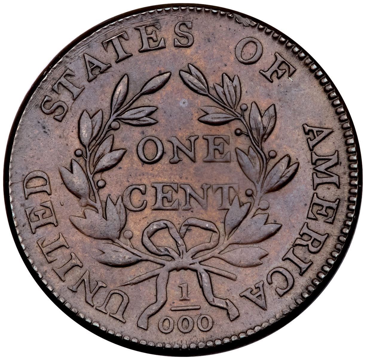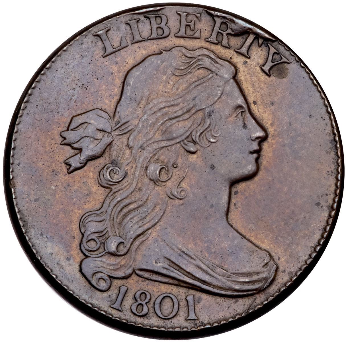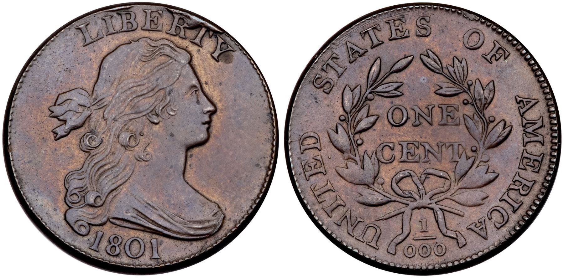 1801 S-223 R-1 Error Fraction 1/000 VF30EF45 sharpness but cleaned and retoned with traces of microporosity and very faint harlines visible under a glass left across the fields and devices. The notable marks include slightly stronger scratches over STATES, one on the bust tip, and a scuff on the rim above O in OF. Now toned a glossy light steel brown with underlying faded orange tan. M-LDS, Breen state V, with cud breaks at RT in LIBERTY and a thin one over IB.Certificate Number: Pedigree: Ex; Kevin Vinton