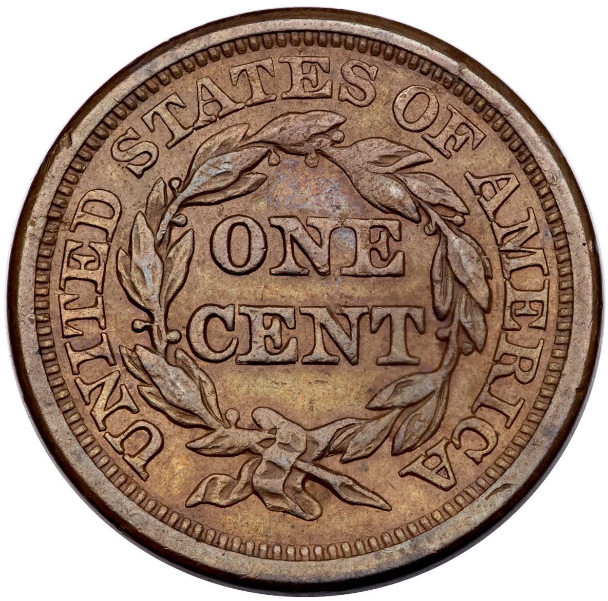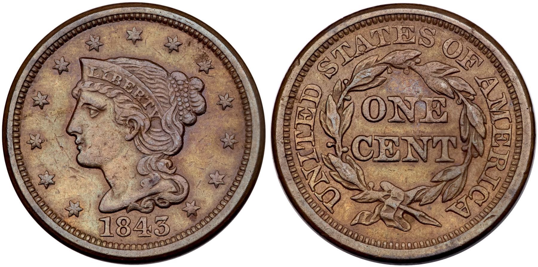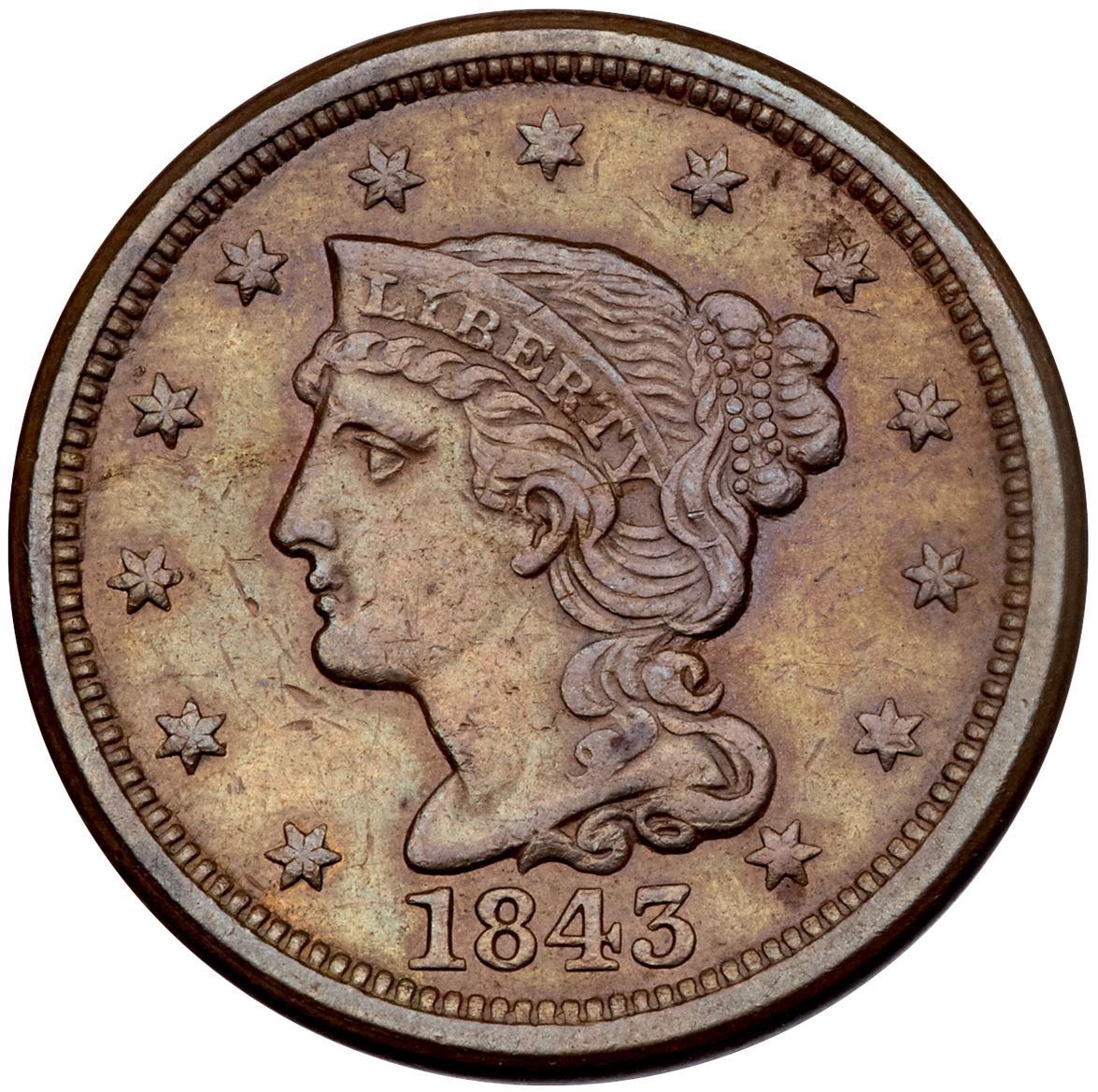 1843 N-17 R-5 VF30+EF45 sharpness but there are numerous small nicks scattered on both sides preventing the higher grade. The notable ones are in the field before the mouth and chin, as well as a rim nick left of the first S in STATES. Frosty steel brown and light chocolate with traces of mint frost in the protected areas. EDS. Tied for CC#3 honors in the Grellman census.Certificate Number: Pedigree: Ex; Discovered by Rick DeSanctis - Goldbergs 8/2013:373 - Kevin Vinton