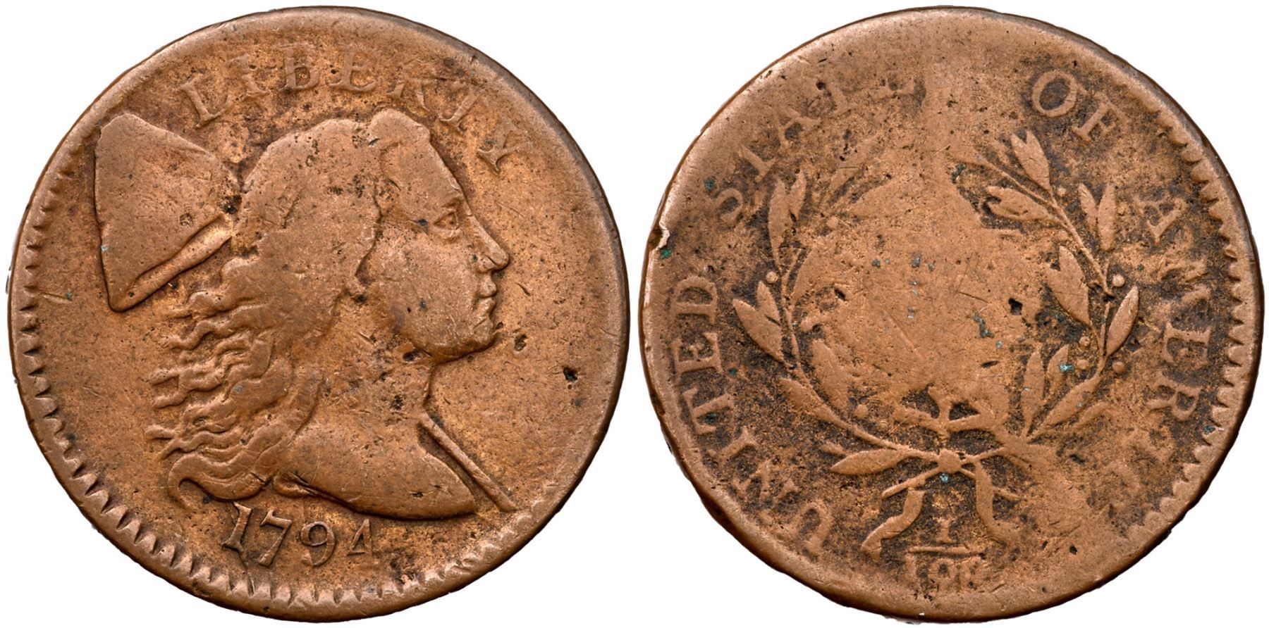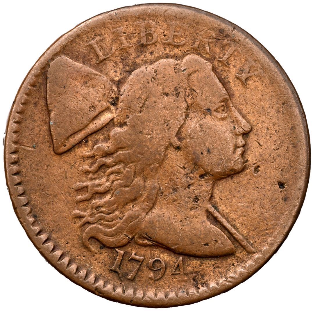 1794 S-65 R-1 VG8. Fine sharpness but cleaned long ago and now toned pleasing light brown with hints of faded orange underneath. There are a few scattered pits on either side, and a rim bruise between UNITED and STATES. TDS, with heavy bulging on the central reverse. Strong date.Certificate Number: Pedigree: Ex; Schwartz 1/1985 - Jules Reiver Collection lot 19235 - Perdue 10/2013 - Tom Webster