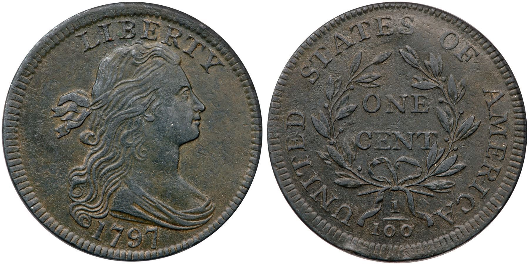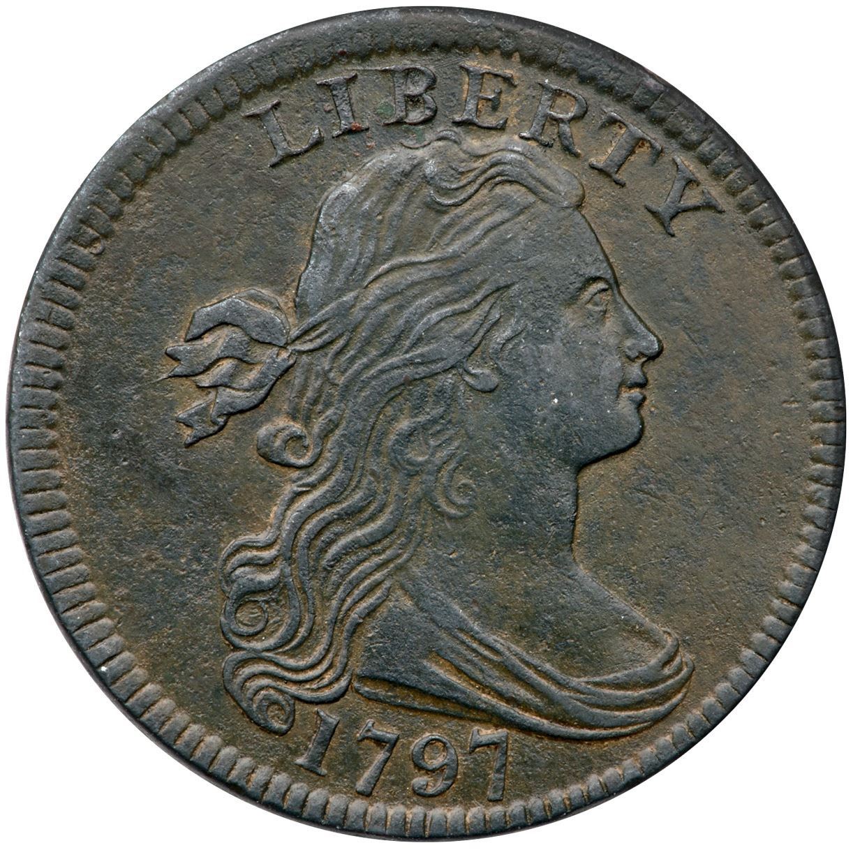 1797 S-138 R-1 F15XF40 sharpness but lightly corroded with scattered spots of microporosity. A minor rim bruise under the left ribbon tail is the only notable mark. Semi-glossy dark steel and olive green surfaces. EDS, Breen state II.Certificate Number: Pedigree: Ex; Tim Paquette