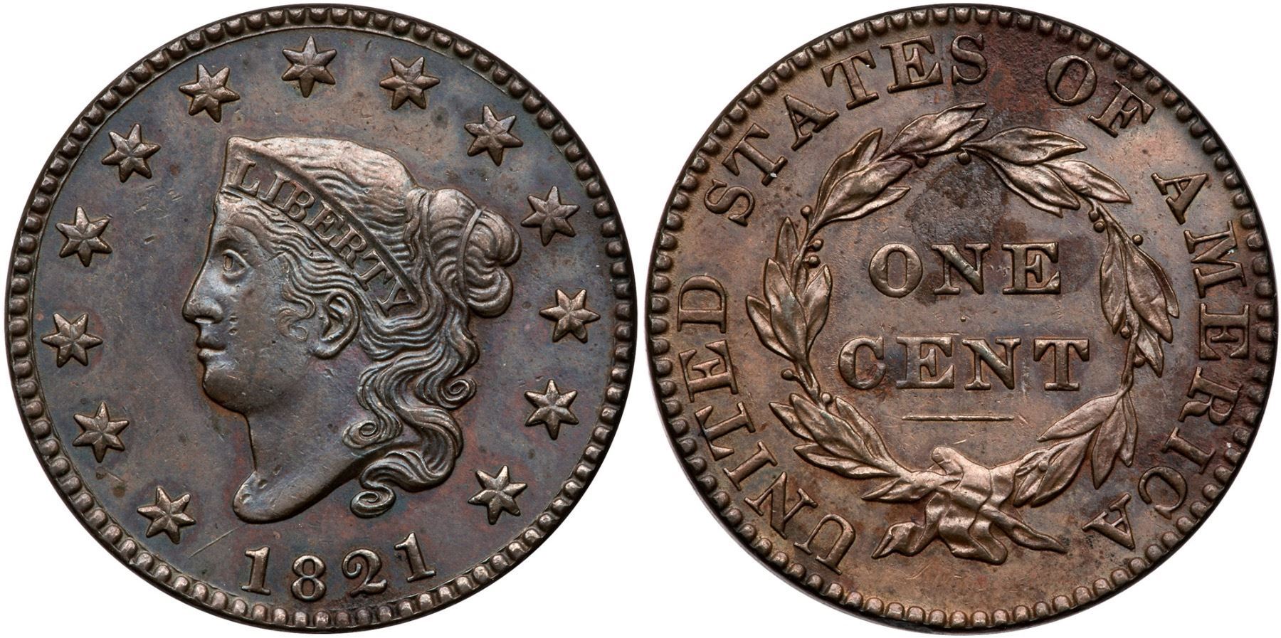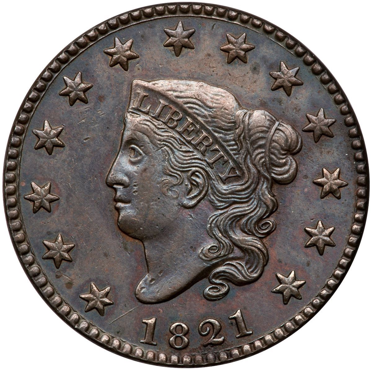 1821 N-2 R-1 EF40AU50 but there are a few spots of light corrosion on the upper reverse, and the surfaces have been recolored. Now toned olive and bluish steel and iridescent red underneath, and a few stains on the mid to upper reverse. EDS.Certificate Number: Pedigree: Ex; Tim Paquette