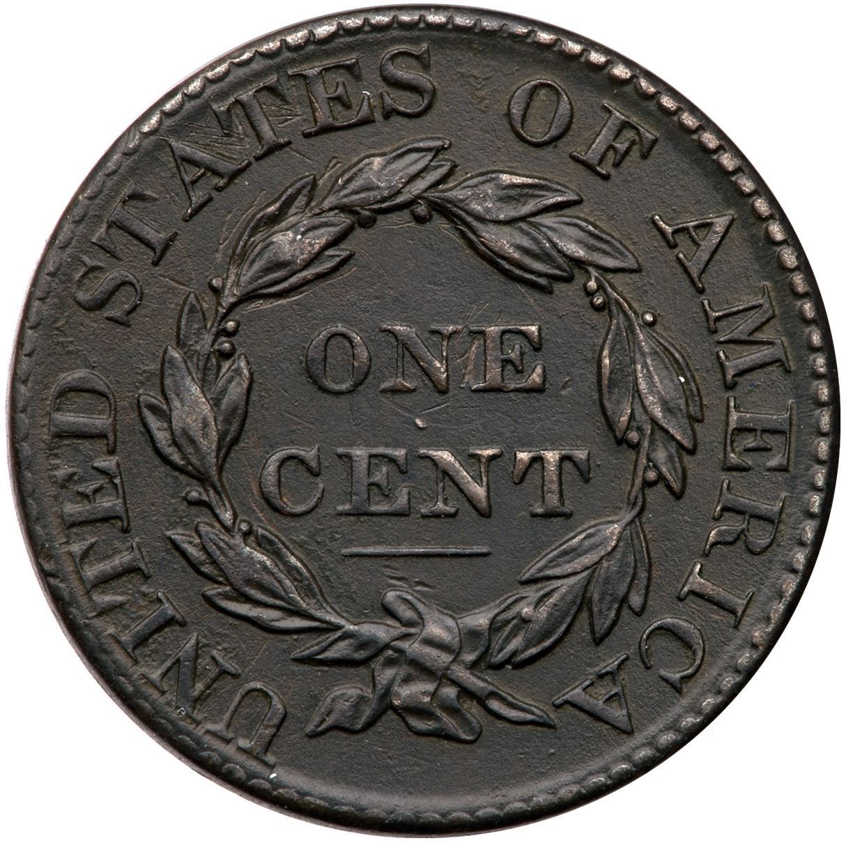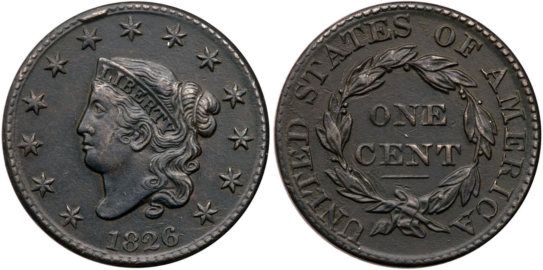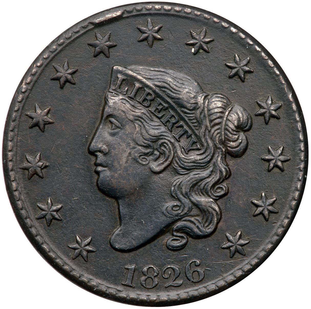 1826 N-1 R-2 VF25+XF45 sharpness but dark with microscopic granularity in some fields and protected areas. The notable marks include a dull nick on Liberty's cheek, and old scratches around star 13 and AT in STATES. Dark steel and olive browns. MDS, with the obverse rim cud break over star 6.Certificate Number: Pedigree: Ex; Tim Paquette