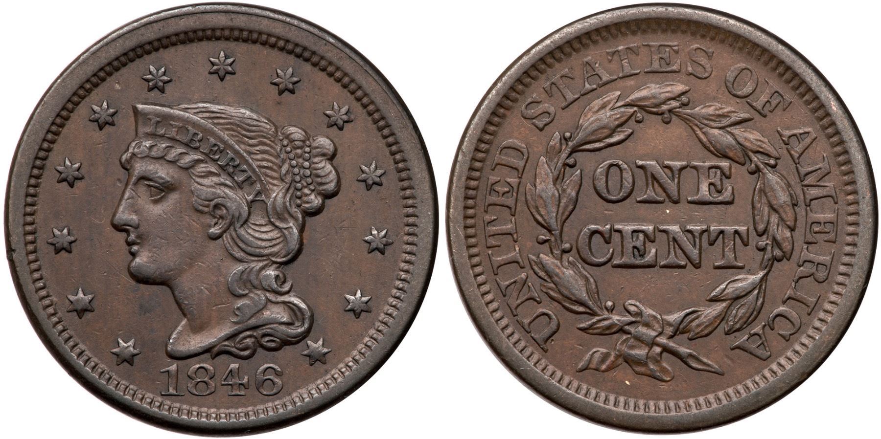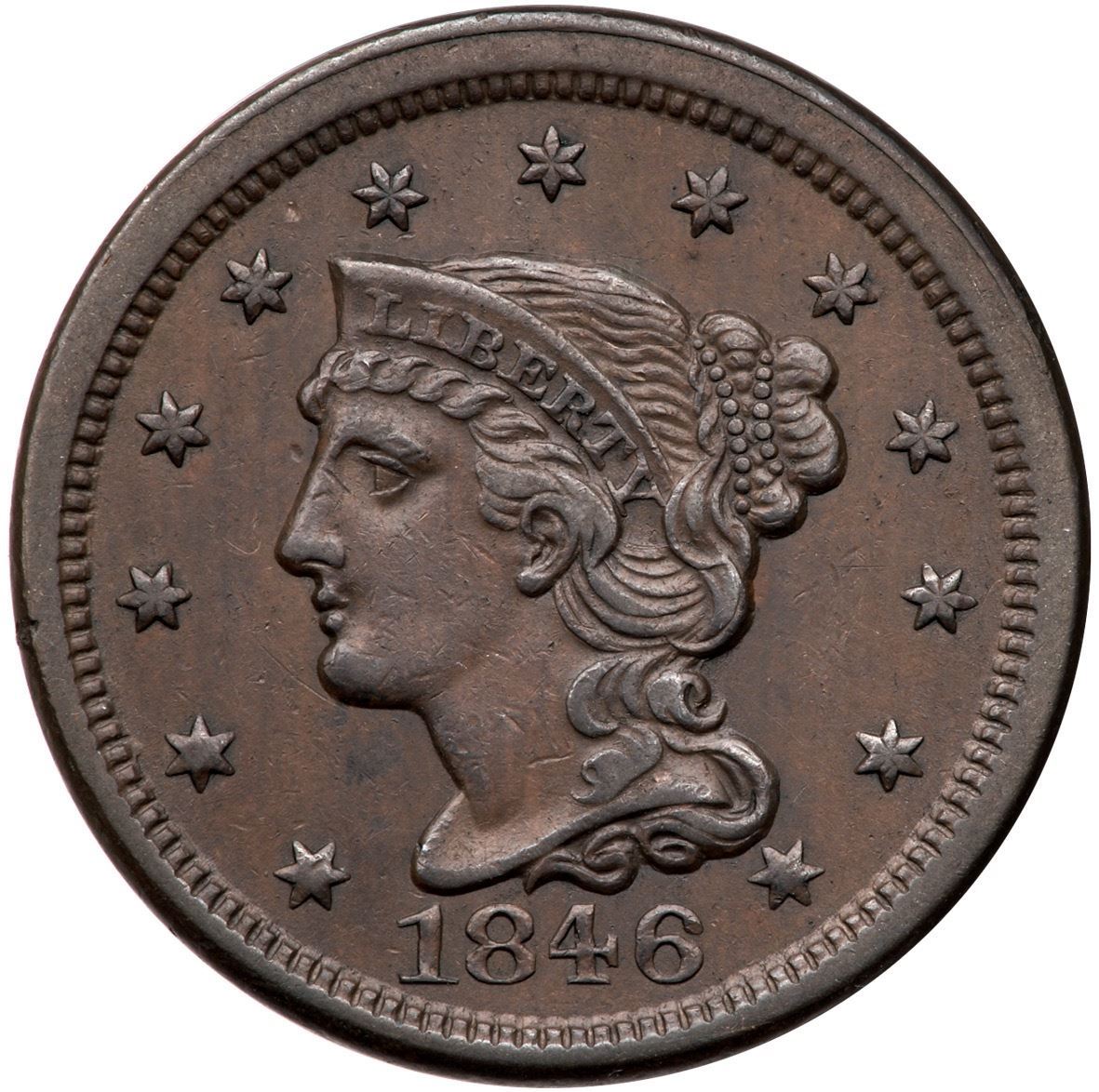 1846 N-20 R-3 XF40Chocolate and steel brown surfaces with subtle pin scratches on the cheek and right obverse field that blend in very well to the toning. Otherwise the only notable marks are a tiny nick on the nose bridge and one on the rim at star 3. Smooth surfaces.Certificate Number: Pedigree: Ex; Tim Paquette