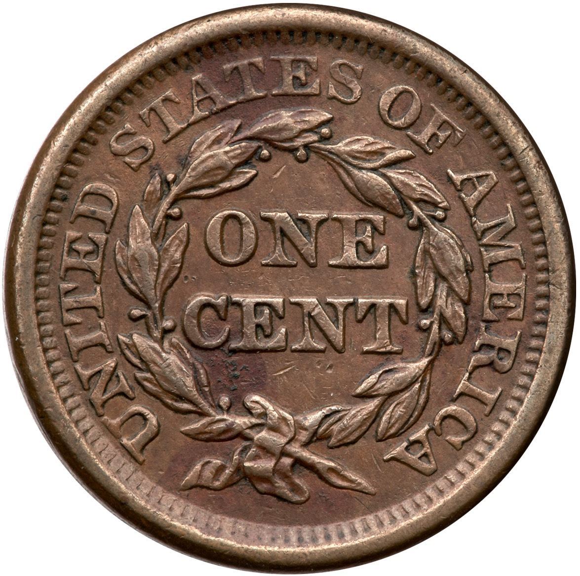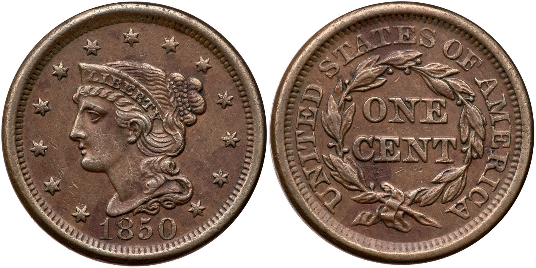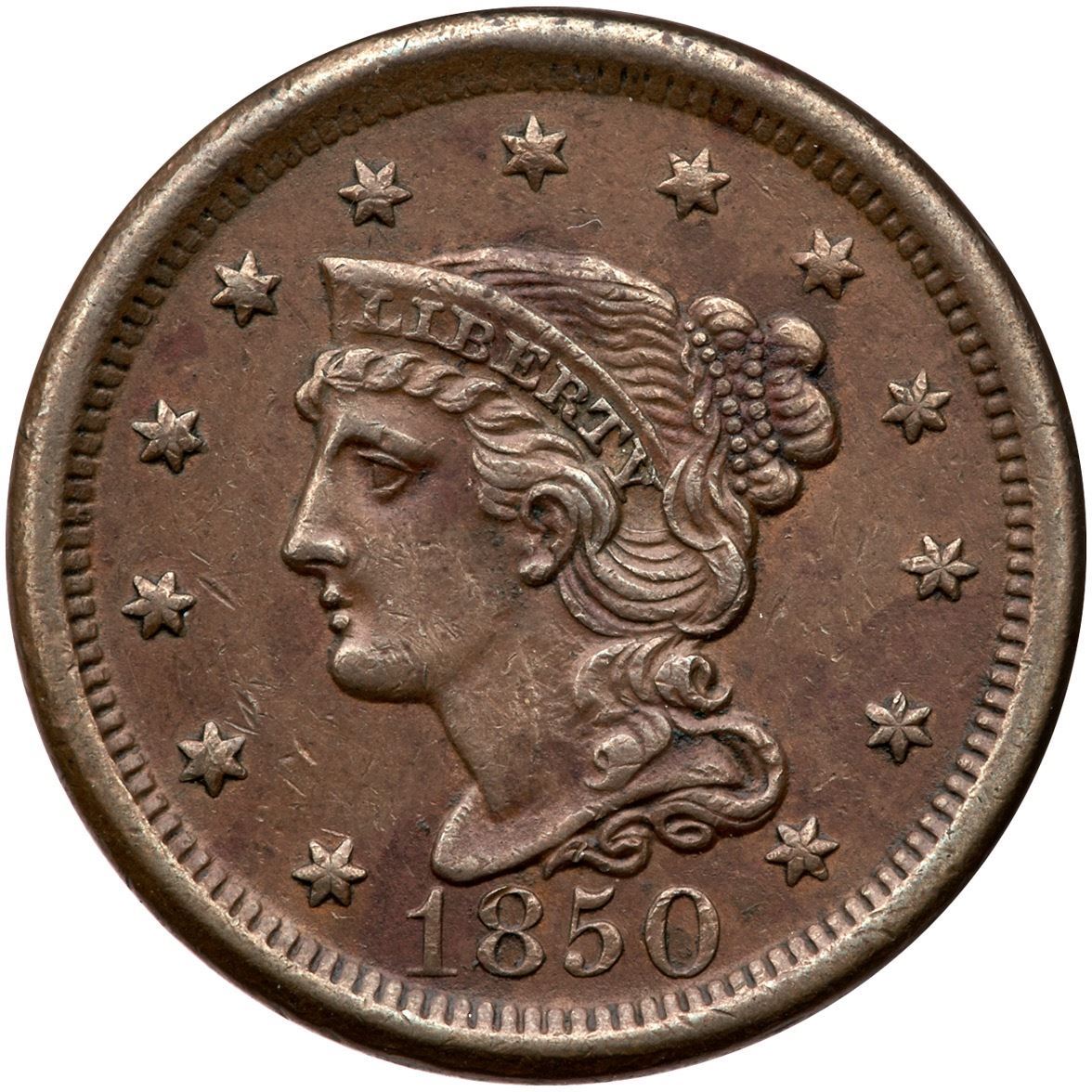 1850 N-11 R-3 VF30XF sharpness but there are several maroon stains on both sides and a few specks of old verdigris below C in CENT. There are also trivial nicks in the fields and one atop the 8. Medium brown and olive browns on glossy surfaces.Certificate Number: Pedigree: Ex; Tim Paquette